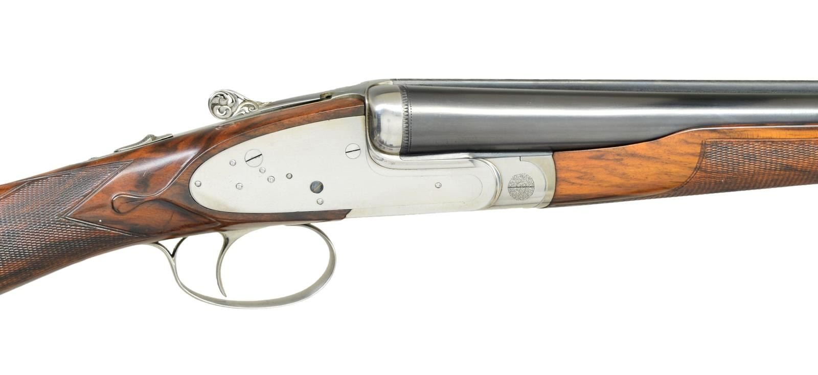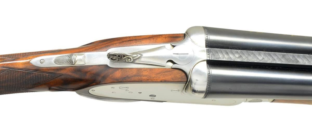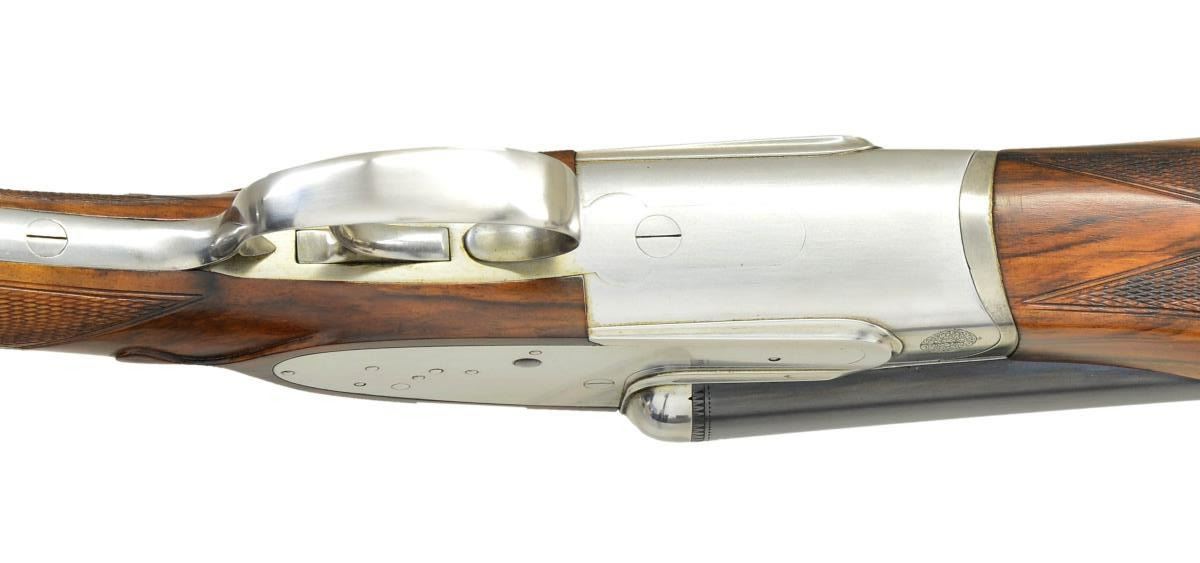 SIDELOCK EJECTOR GAME GUN. Cal. 12 Ga. 2 3/4". S# 89018 (1973). One of the highest grade guns made by Antonio Zoli, the Volcano Record was custom made. Examples are seldom seen. This unusual gun, almost devoid of engraving, is possibly unique. It has 28" shoelump barrels with slightly raised matted concave rib. "Antonio Zoli" is gold inlaid in script on left barrel. Barrel flats are stamped with 1973 Italian nitro proofs for 2 3/4" chambers along with "106A" and grade "VR". These marks are also found on watertable of coin finished H&H type sidelock action. Action features non-automatic safety, hidden third fastener, bushed strikers with gas vents, gold line tumbler end cocking indicators and single non-selective trigger. Action is well filed and nicely polished. The only engraved decoration is a burst of small scroll on hinge pin caps and pierced and relief carved foliate scrolls on thumb piece. Plain trigger guard has S# in gold on tang. (Plain finish guns like this were often made to show off excellent gun making skills with joining of parts not hidden by engraving). Very attractive well marbled and lightly stump figured European walnut, slightly swan necked buttstock measures 14 5/8" over solid black "Old English" white line pad. Stock features drop points and point pattern grip checkering. Matching beavertail ejector forend has Anson release. MEASUREMENTS: BBLS: Bore Diameter: L .724". R .724". Restriction: L .037" (extra full). R .023" (mod). Wall thickness: L .021". R .020". STOCK: DAH: 1 1/2". DAC: 1 3/16". CAST: about 1/4" off. LOP: 14 5/8". WEIGHT: 7 lb. 7 oz. CONDITION: finish very fine, mechanics fair. Metal parts retaining nearly all of their blue and coin finish with only some minor handling marks. Stocks have a few scattered marks in what appears to be their original lacquer finish. Bores are bright and shiny without noted problems. Action is tight, barrels are on face, ejectors in time, mechanical trigger appears to work well. The third fastener locking bolt is sheared off of top lever, so no bolt engages third fastener. (22-5921/MGM). MODERN. $2,200-3,000.