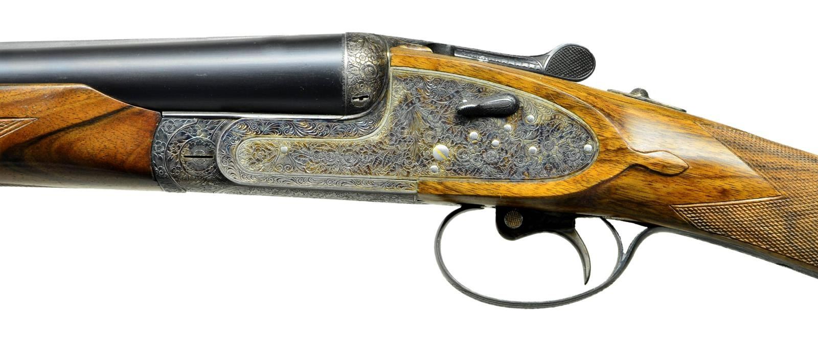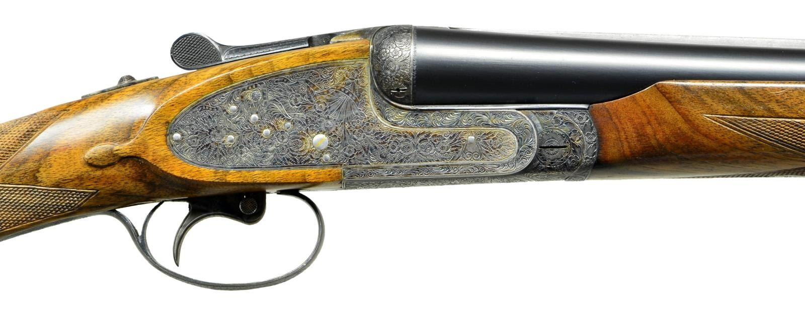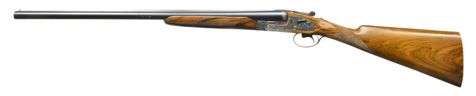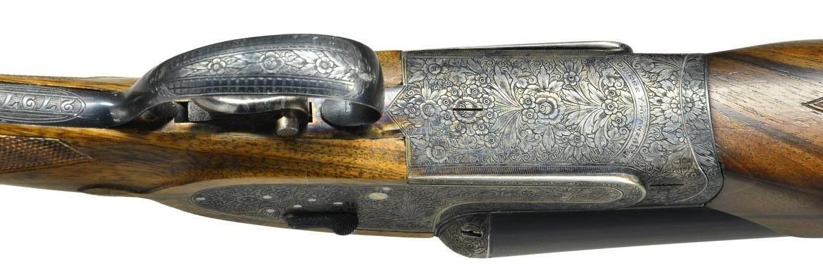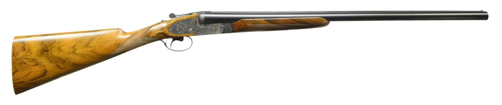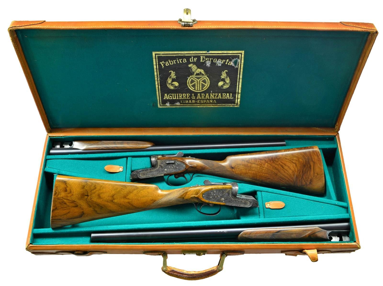 GAME GUNS WITH CASE. Cal. 12 Ga., 2 3/4" both. S# 279733 (Gun #1) & S# 279734 (Gun #2) (1969). The 25" chopper lump barrels are fitted with raised Churchill ribs gold inlaid "AYA" and "1" or "2" on breech ends. Matching numerals are on top levers and forend latches. Tops of right barrels are marked with maker's name and "MADE IN SPAIN". Barrel flats are stamped with 1969 Spanish nitro proofs for 2 3/4" chambers. Case hardened side lock actions feature automatic safetys, bushed strikers, gold line tumbler end cocking indicators, H&H type hand detachable locks and single selective triggers. Actions and lockplates are engraved with full coverage, hand cut shaded scroll surrounding a vast array of flower blossoms and acanthus which is bound by a ribbon toward top of lockplates. Bottoms of actions are engraved with maker's name on arched ribbon. Blued trigger guards have S#'s on short tangs. Straight grip buttstocks are of European walnut and measure 14 1/4" over checkered wood butts. Wood on gun #1 has some smokey marbling on right side and is rather plain on left. Wood on gun #2 has good stump figure and some marbling. Stocks feature drop points, point pattern checkering and gold ovals engraved "JCR". Matching beavertail ejector forends have Deeley releases. Gun #1 MEASUREMENTS: BBLS: Bore Diameter: L .732. R .730. Restriction: L .033. (full). R .017 (mod). Wall thickness: L .027. R .030. STOCK: DAH: 2 5/16". DAC: 1 1/2". CAST: about 1/2" off. LOP: 14 1/4". WEIGHT: 6 lb. 7 oz. Gun #2 MEASUREMENTS: BBLS: Bore Diameter: L .731. R .728. Restriction: L .024 (mod). R .008 (IC). Wall thickness: L .024. R .026. STOCK: DAH: 2 5/16". DAC: 1 1/2"+. CAST: about 1/2" off. LOP: 14 1/4". WEIGHT: 6 lb. 11 oz. UNATTACHED ACCESSORIES: guns are housed in their original leather case with stitched leather corners. A brass rectangle on top is engraved "JAMES C. RICKOFF". Interior is lined in green cloth and a black printed foil AYA label is in lid. Case contains a glass oil bottle and a key. Case is fitted with blue canvas outer cover with zippered closure. CONDTION: very fine. Both guns retain nearly all their factory finishes on both wood and metal. Gun #1 has some scuffs on side of left barrel in front of forend with some associated denting evident in bore. There are a good scattering of dents on buttsock of gun #2; otherwise guns are mechanically and cosmetically fine. Case leather is somewhat scuffed and with some marks, scrapes and handle are good, outer cover is good, interior cloth is very good to fine with some rubs through, label shows considerable rubs and marks. (22-5840 & 22-5841./MGM). BOTH CURIO. $4,000-6,000.