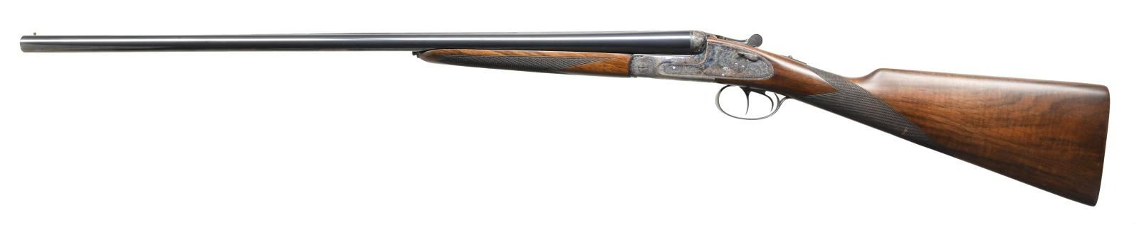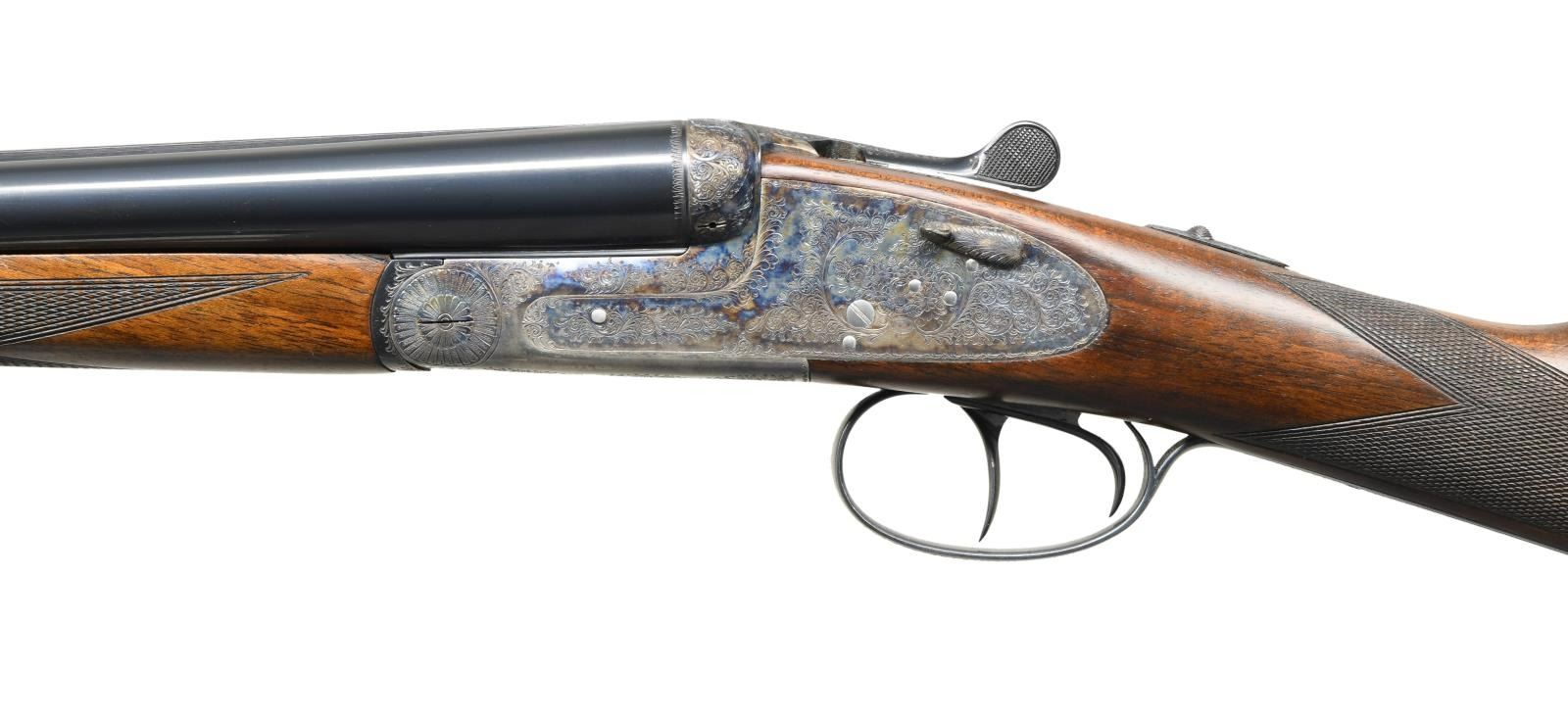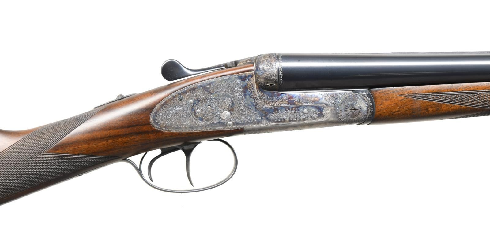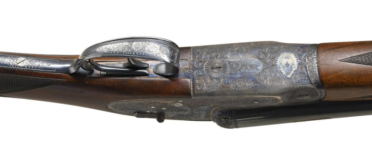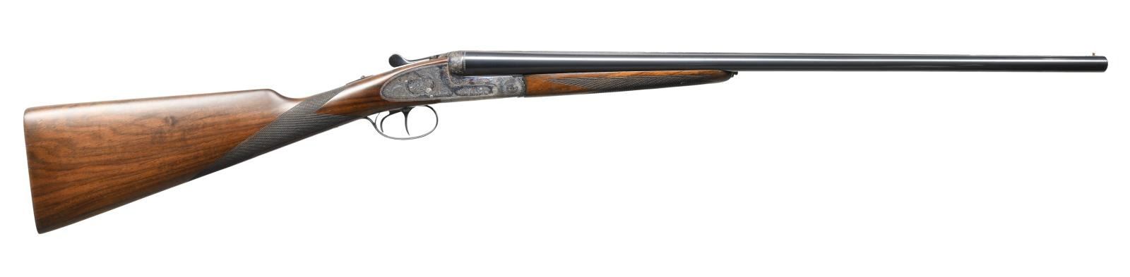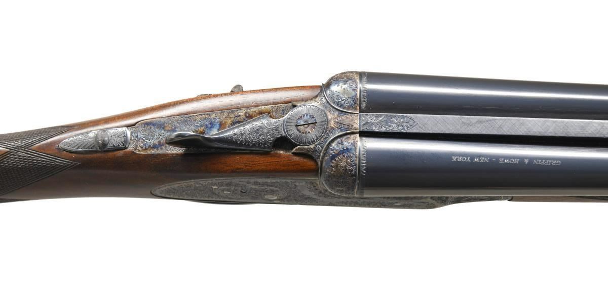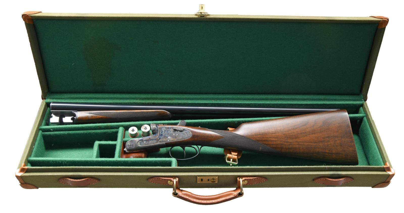 GAME GUN RETAILED BY GRIFFIN & HOWE. Cal. 20 Ga. 2-3/4". S# 38331. The 26" chopper lump barrels fitted with narrow matted flat rib are marked "GRIFFIN & HOWE - NEW YORK" on top of left barrel. Barrel flats are stamped with 1995 Spanish nitro proofs and barrels are marked for IC & Mod chokes. Case hardened, round bodied sidelock action with Arrieta marks on watertable, features automatic safety, bushed strikers, H&H style detachable sidelocks, engraved tumbler end cocking indicators and double triggers (front articulated). Action and lockplates are engraved with 70% coverage, medium scroll with some rose bouquets. "GRIFFIN & HOWE" "NEW YORK" are in gold on bottom of action. Blued trigger guard with single bead on bow has S# on tang. Lightly figured and streaked dark European walnut straight grip buttstock measures 14-3/4" over skipline checkered wood butt. Point pattern flat top checkering is at grip. Matching wide splinter ejector forend has Anson release. MEASUREMENTS: BBLS: Bore Diameter: L .626. R .626. Restriction: L .010 (Mod). R .003 (IC). Wall thickness: L .028. R .028. STOCK: DAH: 2-1/4". DAC: 1-1/2+". CAST: about 1/2" off. LOP: 14-3/4". WEIGHT: 5 lb. 15 oz. UNATTACHED ACCESSORIES: gun is housed in green canvas case with leather corners lined in green felt, which contains a pair of snap caps and 2 keys. CONDITION: very fine, showing moderate field use. Barrels show a scattering of very light marks. Case color of action thinning and silvering around bottom. Case color remains strong on top and on locks. There is a fair scattering of small marks on buttstock and some brush marks on right side of forend. Bores are bright and shiny. Mechanically fine. Case is good showing some scuffs. Straps and handle are good; interior is somewhat stained. (23-2135/MGM). MODERN. $4,000-6,000.