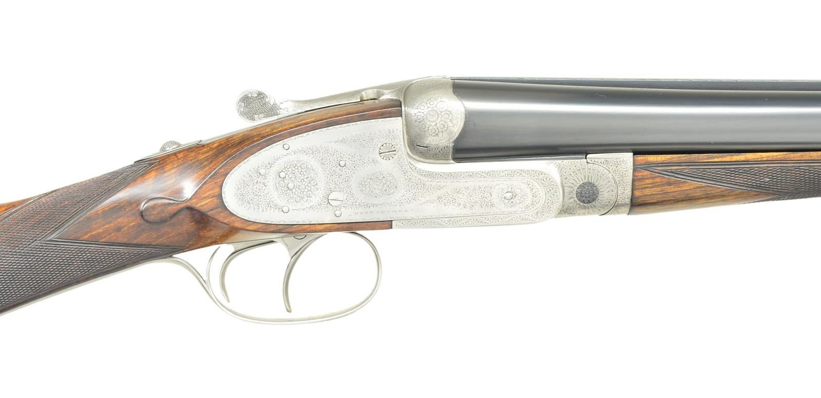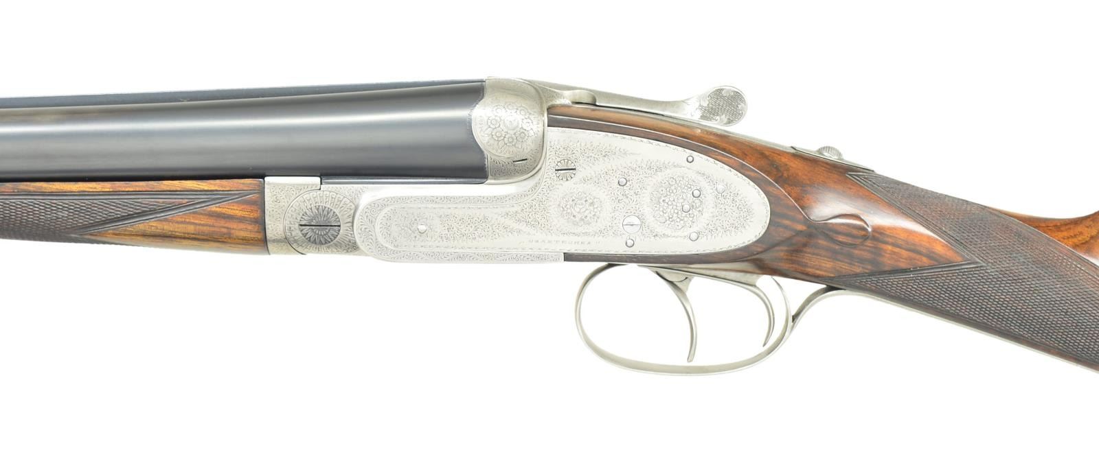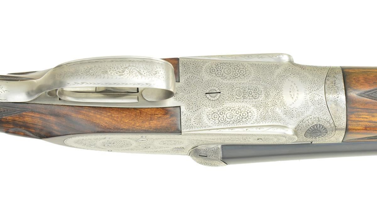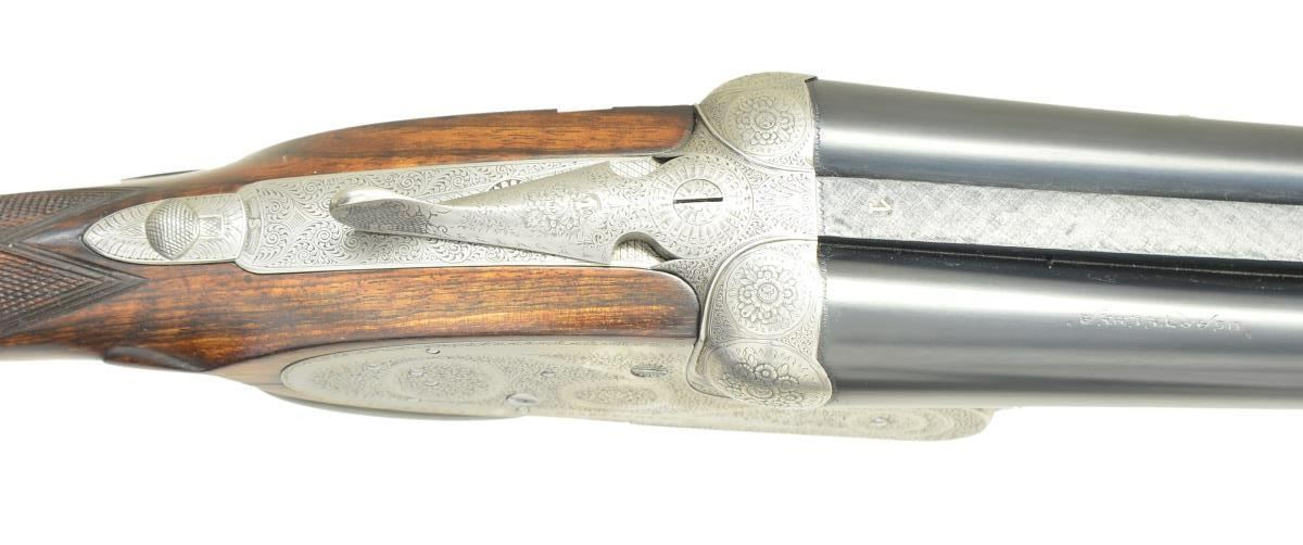 SHOTGUN. Cal. 12 Ga., chambers are lengthened to 2-3/4". S# 26721. Bbls. 27-5/8" w/ hand matted solid rib. Assisted opening sidelock action. Features include double under lug & third bite locking w/ side clips, cocking indicators, ejectors & hinged front trigger. Right edge of trigger guard is rolled. Traditional fine English rose & scroll full coverage hand engraving. Breech end of bbl., forearm tip & top lever are marked w/ gold no. 1s indicating this gun was part of a 2 gun set. Splinter forearm w/ Anson release & straight hand stock of fancy European walnut. Stock features include point pattern checkering, tear drop points & nameplate on toeline. LOP: shortened to 14-1/4" over a red ventilated aftermarket pad. DAC: 1-1/2". DAH: 2-5/16". Near neutral cast. Bore diameter: RT .721", LT .724". Choke constriction: RT .013", LT .032". Minimum wall thickness: RT .028", LT .027". WEIGHT: 7 lbs, 2 ozs. CONDITION: bbls. retain 98% reblacked finish & have very good bright bores. Action has a very good cleaned bright finish. Stock & forearm are refinished showing small marks. Freshened checkering. Action is tight on face. (23-661/DS). CURIO. $2,500-4,000.