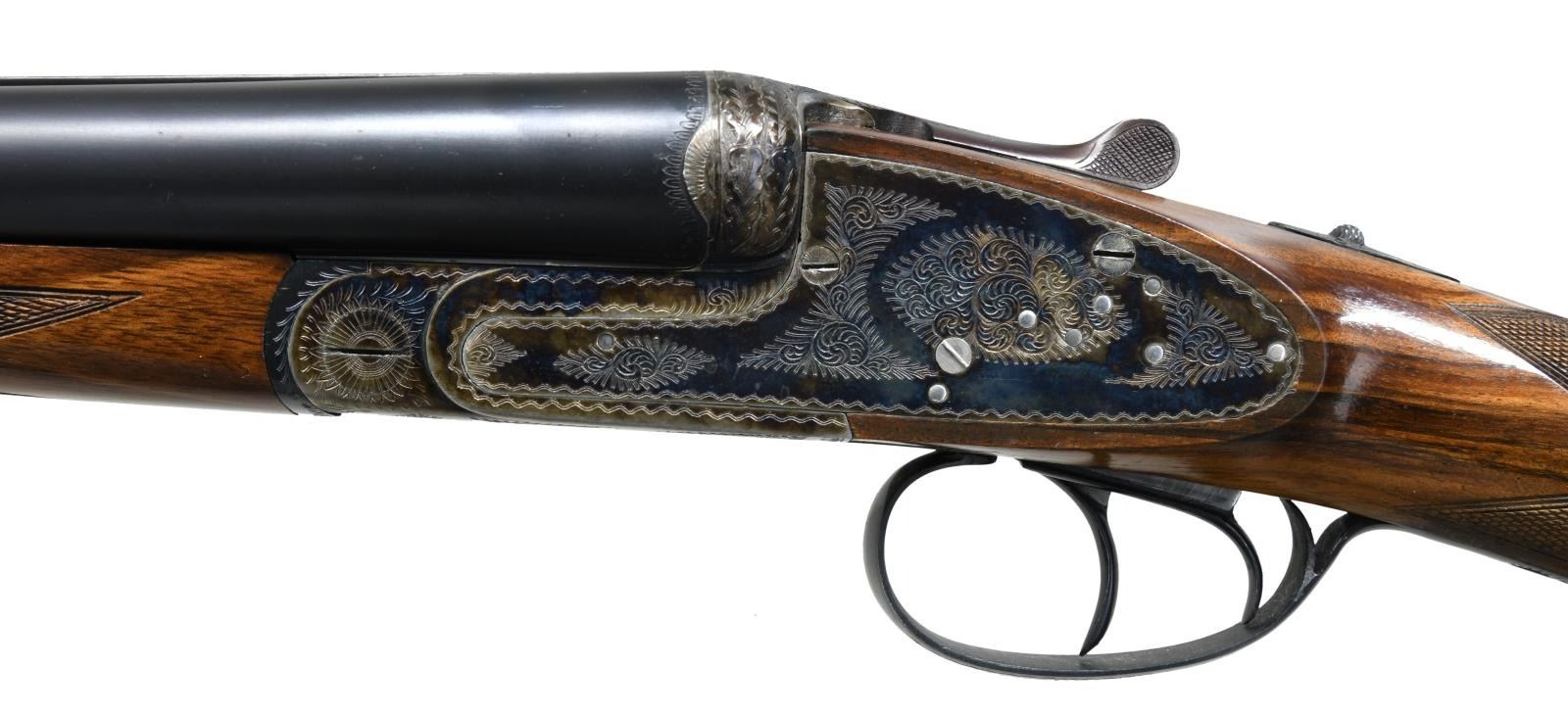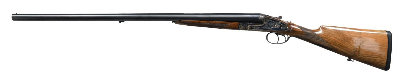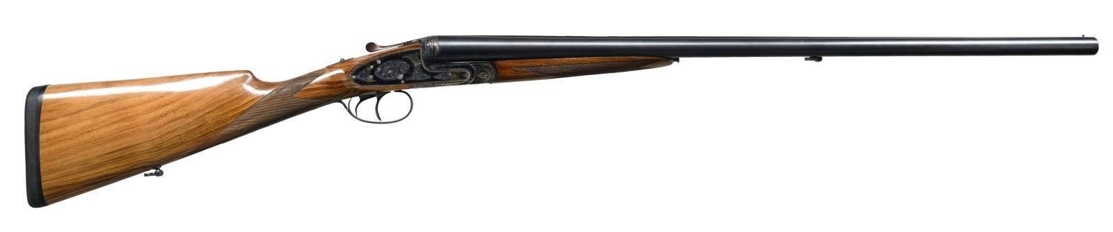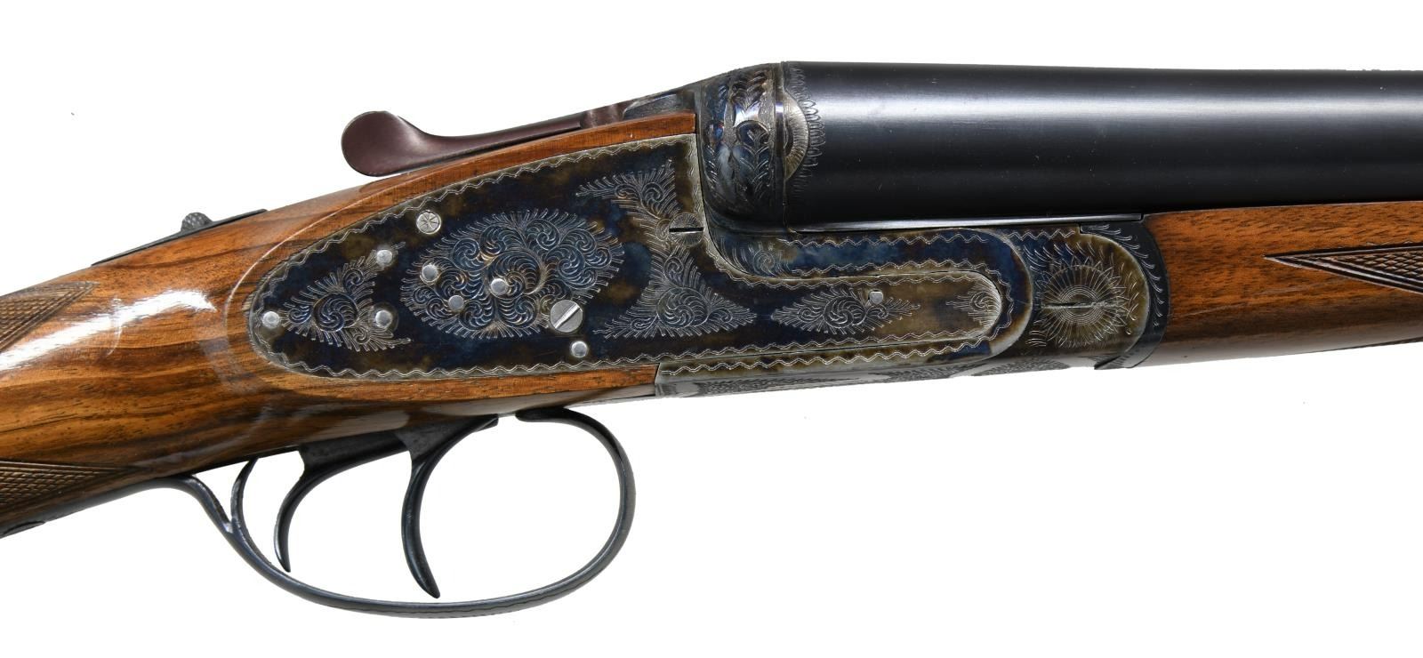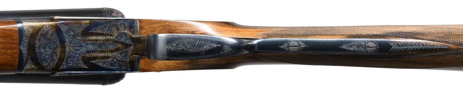 Cal. 12ga 2-3/4". S# 10602. Bbls. are 27-1/2" w/ brass bead. Case colored sidelock action featuring side clips, third fastener & cocking indicators. Action has moderate coverage of open pattern Arabesque scroll engraving. Splinter forearm w/ Anson fastener & straight grip stock of fancy European walnut have point pattern hand checkering. Toeline of stock & bbls. are fitted w/ swing swivels. LOP: 14-1/4" over an aftermarket solid black Old English pad. DAC: 1/2". DAH: 2-1/8". Stock has approx. 1/4" cast off. Bore Diameter R .727. L .725. Choke Constriction: R .008 L .017. Minimum Wall Thickness: R .030 L .031. WEIGHT: 6 lbs, 11.6 oz. Date codes indicate 1997 mfg. This mid-grade gun was produced at a time when Arrizabalaga offered several grades of shotguns. Currently, they offer only best quality guns & have achieved a reputation of making the finest guns in Spain. CONDITION: bbl. & action retain 97% blue & case colored finish showing slight edge wear. Original wood finish shows scattered scratches & marks. Gun is tight & on face. Bright near excellent bores. (23-2151/DS) MODERN. $1,500-2,250.