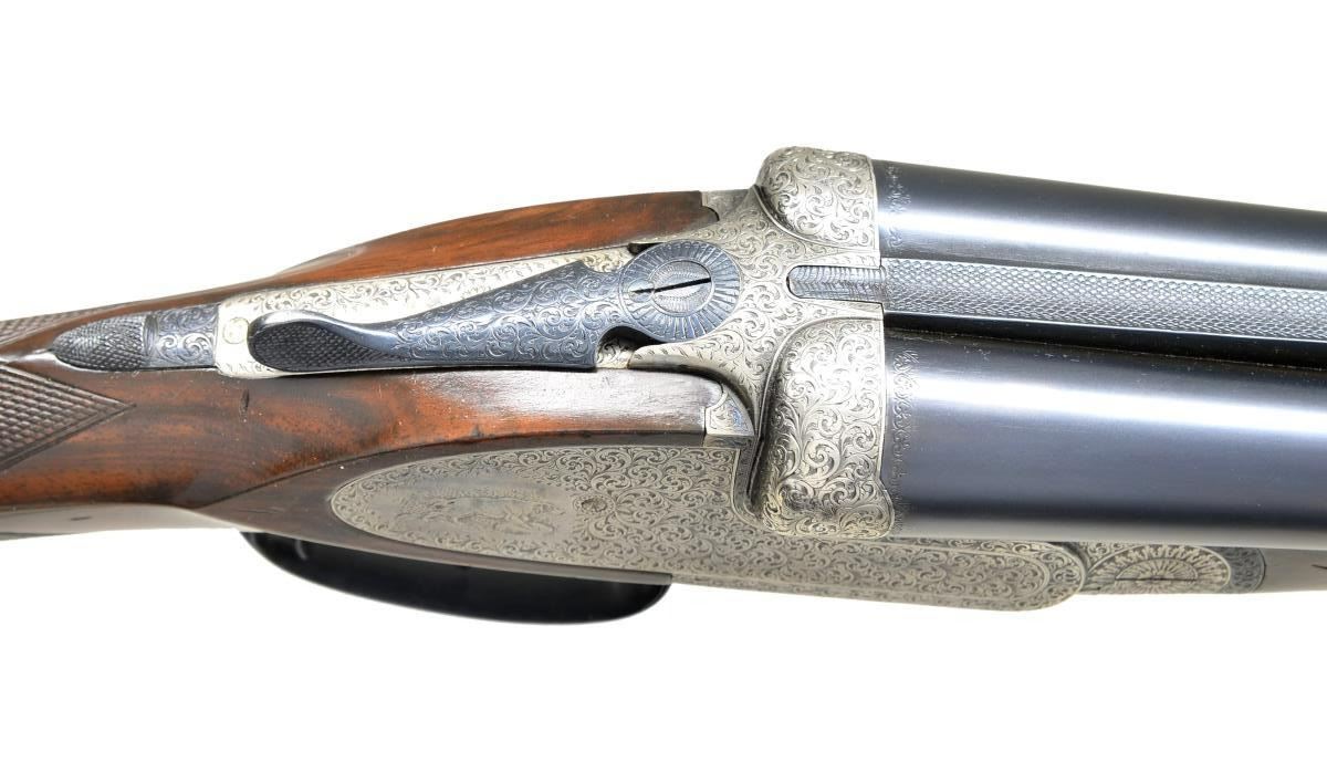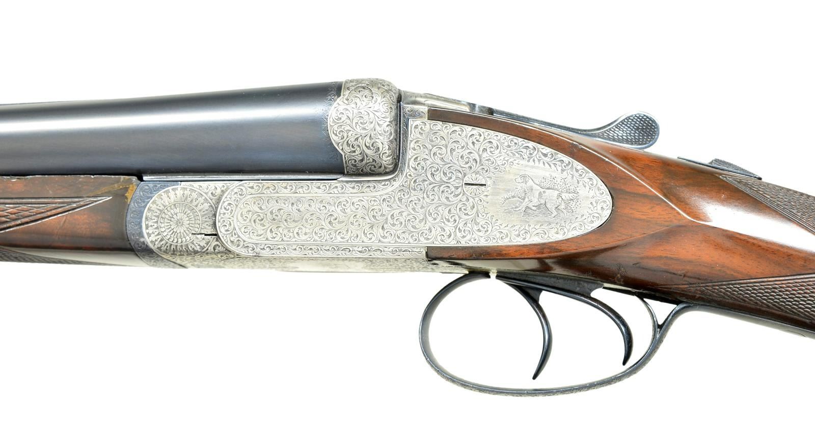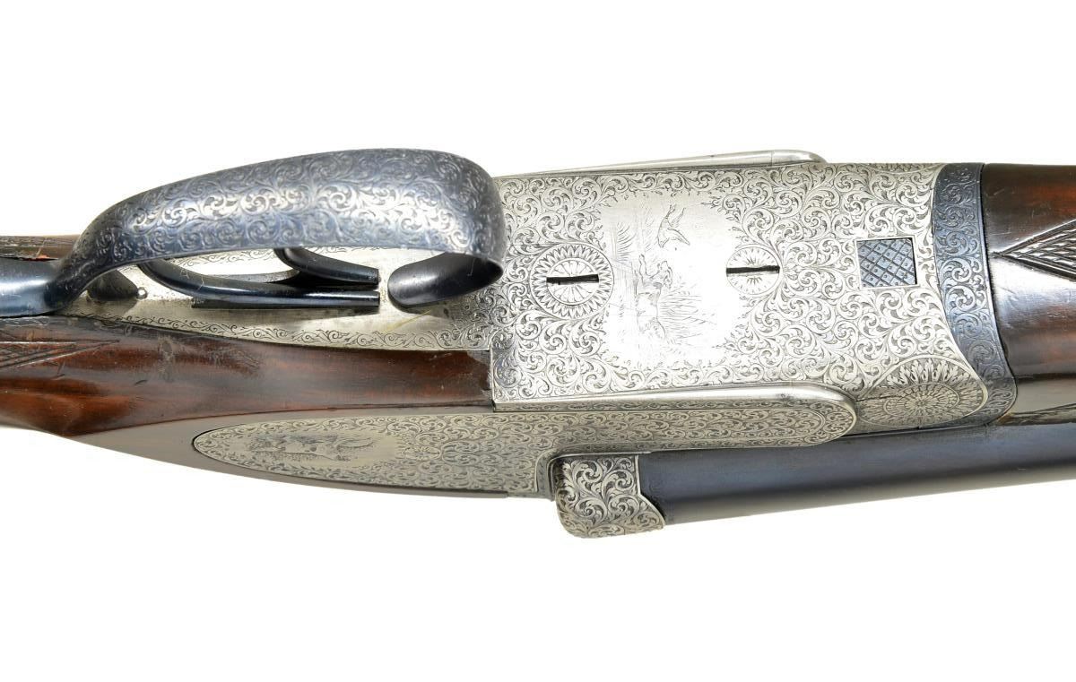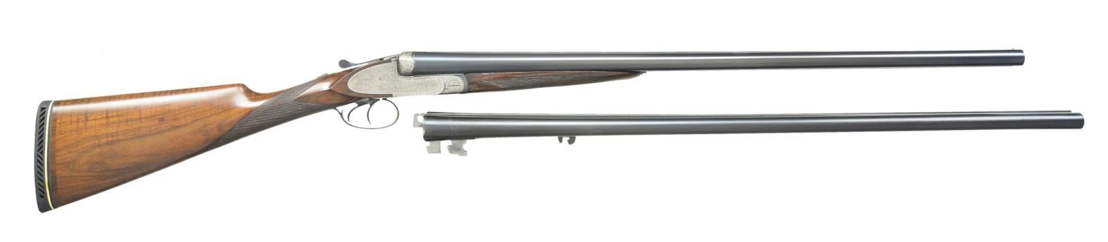 BARCELONA 12 BORE TWO BARREL SET GAME GUN OF VERY HIGH QUALITY. S# 35786. Bbls: Set 1: 27 7/8" w/ 2 3/4" chambers. Matted top rib & brass front bead w/ makers name & address on top of tubes. SN & proof marks on blued bbl. flats. Set 2: 30" long w/ 2 1/2" chamber constructed by Lebeau Courally w/ makers name on top rib & Eduardo Schilling info on tops of bbls. Single splinter forend is checkered in point pattern w/ diamond at center & has Anson type push button release & blued & engraved iron. Side plated action is near full coverage scroll & game scene engraved w/ setter on left & right plates towards rear & sm. flushing cocker in marsh scene on bottom all surrounded by nicely executed scroll engraving. Beaded bolsters w/ side clips are fully scroll engraved as is blued top lever & top tang w/ gold inlaid "S" in front of safety. Gun has dbl. locking underlug & Greener crossbolt. Water table w/ proof marks & very sm. import mark. Gun made w/ dbl. triggers, auto ejectors & auto safety. Straight grip buttstock is checkered in 2 point pattern through the wrist has unengraved long trigger guard tang & 1/4" wood spacer at butt & terminates w/ a "Irupe" brand ventilated White Line pad. Weight w/ bbl. set 1: 7 lbs., 2 oz. Measurements: Set 1: Right: .719" w/ .030" choke. Left: .718" w/ .039" choke. Minimum wall thickness: Left: .038:, right: .030". Set 2: Right: .736" w/ .024" choke. Left: .735" w/ .033" choke. Minimum wall thickness: Left: .015", right: .019". LOP: 14 7/8" w/ 1/4" wood extension. DAC: 1 7/16". DAH: 2 1/8". CONDITION: excellent. Original bbl. set retains nearly all of a professionally restored finish as does bbl. set no. 2. Bbl. set no. 2 w/ sm. push impression on right bbl. near forend which could easily be removed & some beginning exterior pits towards muzzle. Bbl. set no. 1 has bright & shiny bores. Bbl. set 2 w/ beginning orange peel in bores. Stocks are mostly sound w/ a beginning grain separation behind the top tang which is barely noticeable & tiny minor losses on bottom stock fingers & on left side of forearm where it meets the wood. Stocks retain most of an older professionally restored finish w/ subsequent minor handling marks. Mechanics in need of minor attention as hammers will not drop w/ safety disengaged. Action is nice & tight & on face. Engraving is crisp. Action appears to have been originally coin finished & shows only minor staining. Engraving is still crisp & clear. (22-1143/JSL). CURIO. $2,000-3,000.
