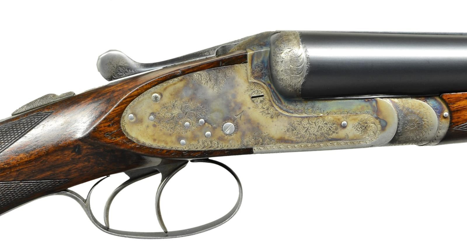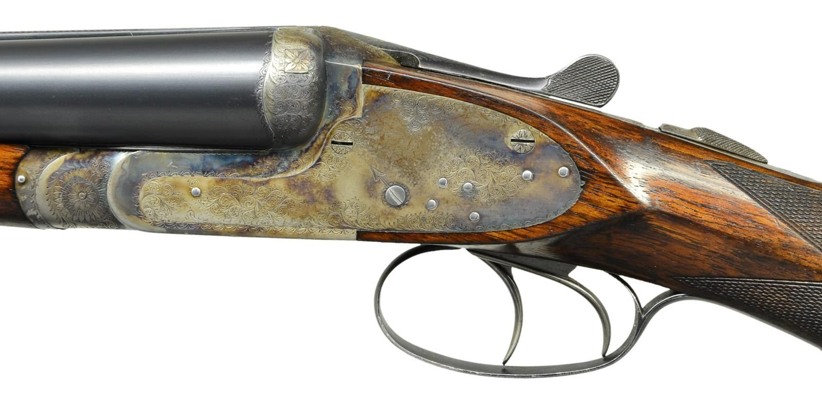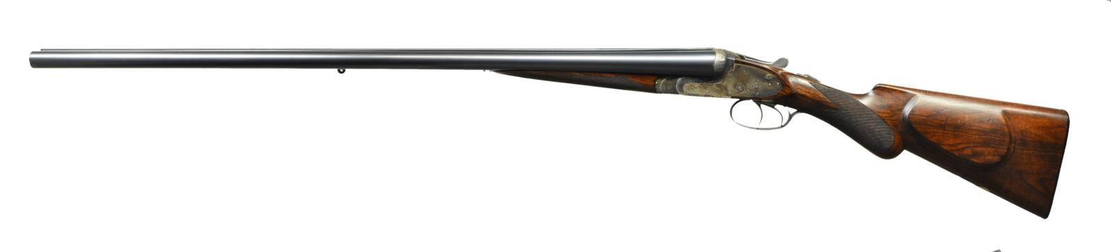 Cal. 12 Ga., 2-5/8". S# 12266. Bbls. 29-7/8" w/ solid rib & brass bead. Rib is marked "Victor Sarasqueta Eibar". Case colored sidelock action w/ 50% coverage of arabesque scroll engraving. Action has double under lugs & crossbolt locking w/ side clips & cocking indicators. Selective ejectors & double triggers. Splinter forearm w/ Anson release & round knob cheek piece stock of European walnut w/ hand checkering. LOP: 14" over original buttplate. DAC: 1-1/2". DAH: 2-1/2". Near neutral cast. Bbl. has sling eye, stock has open hole for sling eye attachment. Bore diameter: RT .726", LT .726". Choke constriction: RT .030", LT .035". Minimum wall thickness: RT .036", LT .028". WEIGHT: 6 lbs, 11.6 ozs. Mfg. in Eibar, Spain prior to 1927. CONDITION: bbls. retain over 95% original blue. Action has 80% lightly faded case colors. Trigger guard shows worn blue from carry use. Wood has good original finish & checkering showing numerous small marks. Right side of butt has a 2" crack extending from buttplate. Action is tight & on face w/ top lever at center. Bores show some spots of very light darkening. (23-687/DS). CURIO. $1,200-1,600.