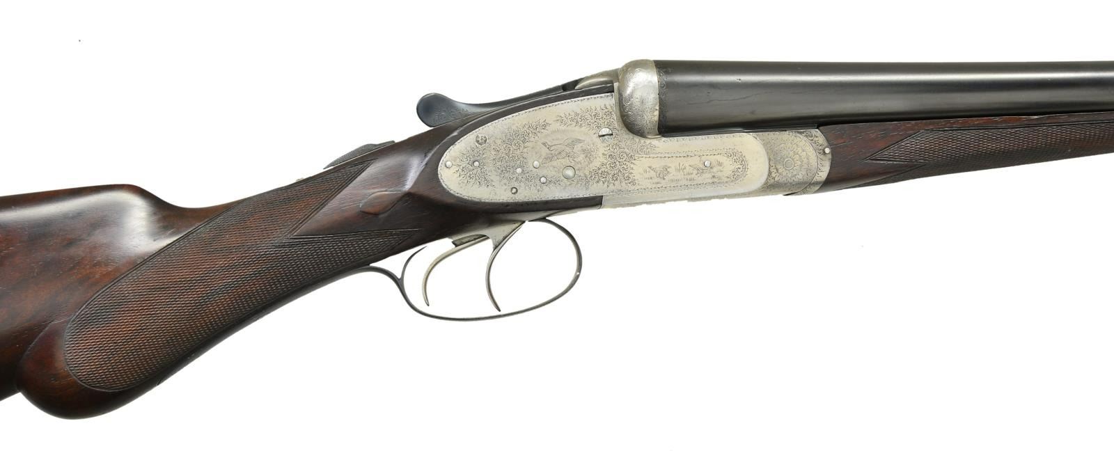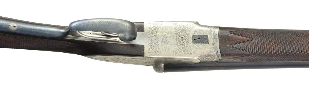 Cal. 12 Ga., 2-3/4". S# 22523. Bbl. shortened to 28-1/2" w/ solid rib & brass bead. Rib is marked "Victor Sarasqueta, Eibar". Sidelock action w/ double under lug & third fastener locking. Selective ejectors & double triggers. Action has fine arabesque scroll engraving surrounding game birds on locks & floorplate. Splinter forearm w/ Anson release & round knob stock of fancy European walnut w/ hand checkering & tear drop points. Toeline has German silver oval nameplate. Stock & bbl. have sling swivels. LOP: shortened to 14" over a thick black foam pad. DAC: 1-9/16". DAH: 2-3/8". Neutral cast. Bore diameter: RT .740", LT .738". Choke constriction: RT cyl. bore, LT cyl. bore. Minimum wall thickness: RT .026", LT .025". WEIGHT: 6 lbs, 13.2 ozs. Mfg. 1941. CONDITION: action is cleaned, bright & retains very good engraving. Bbls. have 98% reblacked finish. Trigger guard & fittings are reblued w/ good engraving. Refinished wood has freshened checkering. Bore shows scattered light pitting. Action is tight & on face. (23-689/DS). CURIO. $900-1,400.