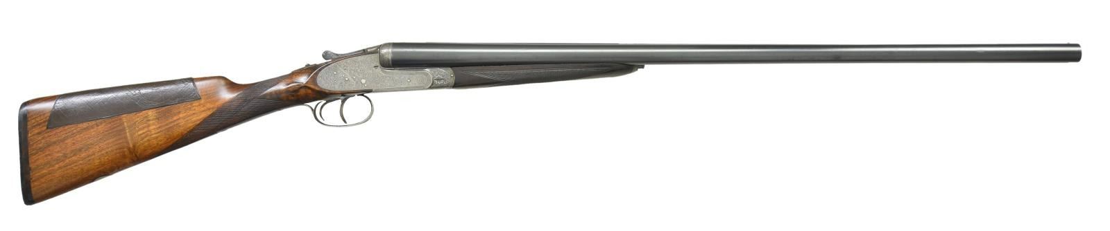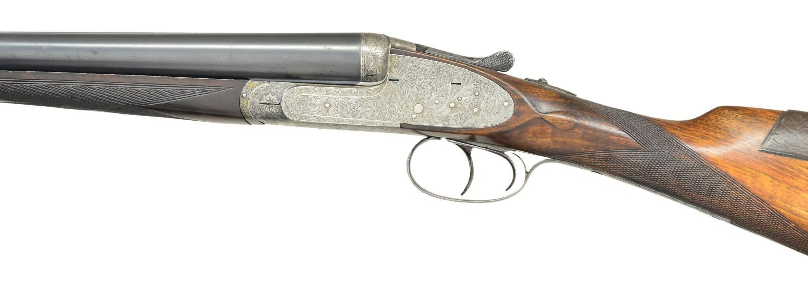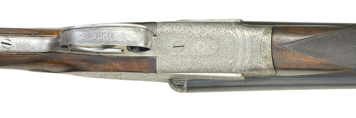 Cal. 12 Ga., 2-3/4". S# 90955. Bbls. 27-5/8" w/ hand matted concave solid rib. Sidelock action w/ full coverage foliate scroll hand engraving. Features include double under lug & third bite locking. Bushed firing pins. Gold bar cocking indicators. Ejectors. Hinged front trigger. Right side of trigger guard bow is rolled. Breech end of bbls., top lever & forearm tip are marked w/ gold no. 2s. Splinter forearm w/ Anson release & straight grip stock of European walnut. Stock features include hand checkering, tear drop points & gold nameplate in toeline. LOP: shortened to 13-7/8" over a buttplate & 1/4" spacer. Comb has added leather facing. DAC: 1-7/16". DAH: 2-1/2". Stock has approx. 1/8" cast off. Bore diameter: RT .727, LT .724". Choke constriction: RT .019", LT .034". Minimum wall thickness: RT .034", LT .032". WEIGHT: 7 lbs. CONDITION: bbls. retain 90% lightly worn blue showing handling marks. Action has pleasing gray appearance. Refinished wood shows wear & handling marks. Checkering is freshened. Action is tight w/ top lever sitting at center. Both bores show pitting. (23-700/DS). CURIO. $1,200-1,600.