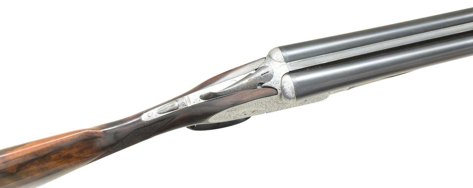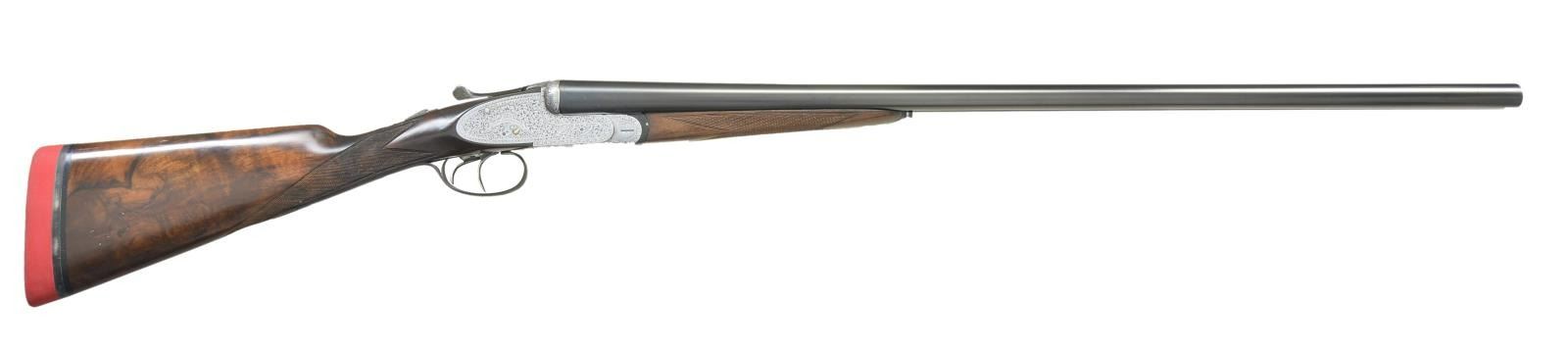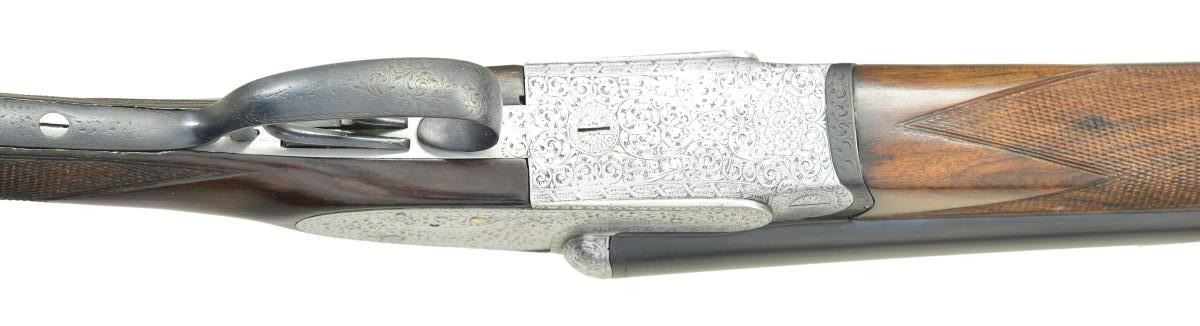 Cal. 12 Ga. S# 350059. Bbl. 29-3/4" w/ matted sunken rib & steel bead. Sidelock action w/ double under lugs, third fastener, side clips & cocking indicators. Selective ejectors. Double triggers, front trigger is hinged. Splinter forearm w/ Anson release & straight hand stock w/ fancy European walnut having hand checkering. LOP: 13-3/4" over an aftermarket solid red pad & 1-1/4" spacer. DAC: 1-7/16". DAH: 2-3/16". Neutral cast. Chambers are lengthened to 2-3/4" w/ lengthened forcing cones. Bore diameter: RT .735", LT .031". Choke constriction: RT .021", LT .034". Minimum wall thickness: RT .026", LT 027". WEIGHT: 6 lbs, 7.6 ozs. Mfg. 1941. CONDITION: Bbls. have over 95% reblacked finish w/ weakened markings. Action has brightly cleaned finish showing some weakening of engraving. Trigger guard & fittings are reblued w/ weakened engraving. Floorplate has a shallow dent. Sanded & refinished wood has good gloss finish w/ chips along trigger guard tang & action. Checkering is deeply recut. Good bores. (23-704/DS). CURIO. $900-1,200.