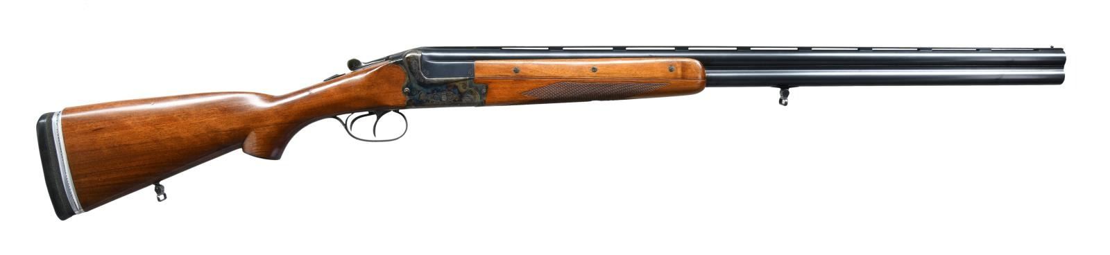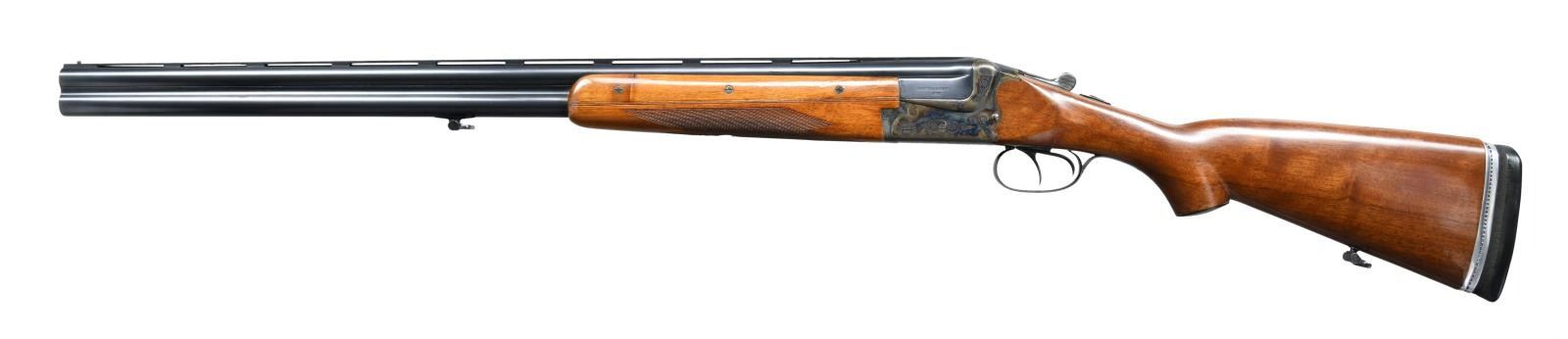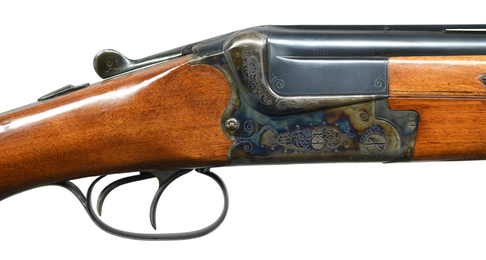 Cal. 12 Ga., 2 3/4". S# 60033 (364 = March 1964). VR 28" bbls. w/ brass front bead. Full chokes. Case hardened scalloped blitz style boxlock action w/ dbl. triggers, cocking indicators, ejectors & non-automatic safety. Action has wedges of acanthus scroll engraving w/ wavy line borders. Blued trigger guard w/ scroll engraving on bow. Checkered forearm w/ matching Deeley release. Walnut pistol grip stock w/ Skeet style profile, grip cap & sling swivel on toeline. LOP: 14" to Morgan adj. buttplate. DAC: 1 3/4". DAH: 2 1/2". CAST: neutral. WEIGHT: 7.4 lbs. CONDITION: very good over 95% bbl. blue w/ varnish overspray from forearm, pinprick patina & streaks on right side top tube by breech. Very good case colors w/ peeling varnish & light wear. Wood has been lightly sanded & refinished w/ a few sm. cracks & previous sm. gouges. Refreshened checkering on forearm. Action appears tight on face. Bright bores w/ scratches & fouling forward of chamber & around choke area. (23-2179/MD). MODERN. $800-1200.
