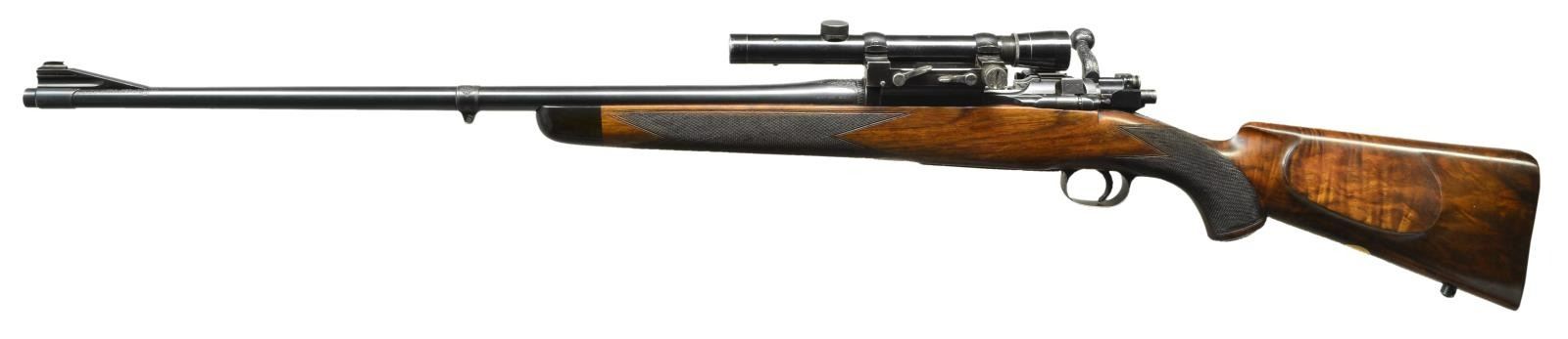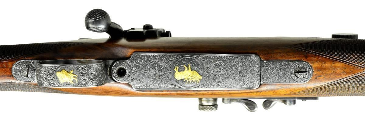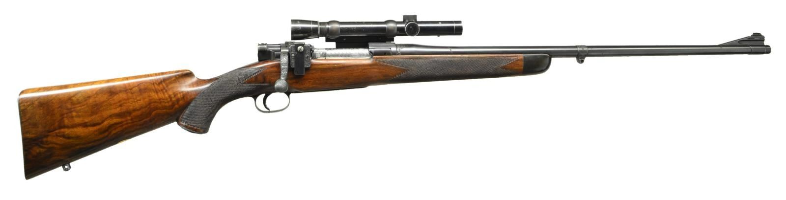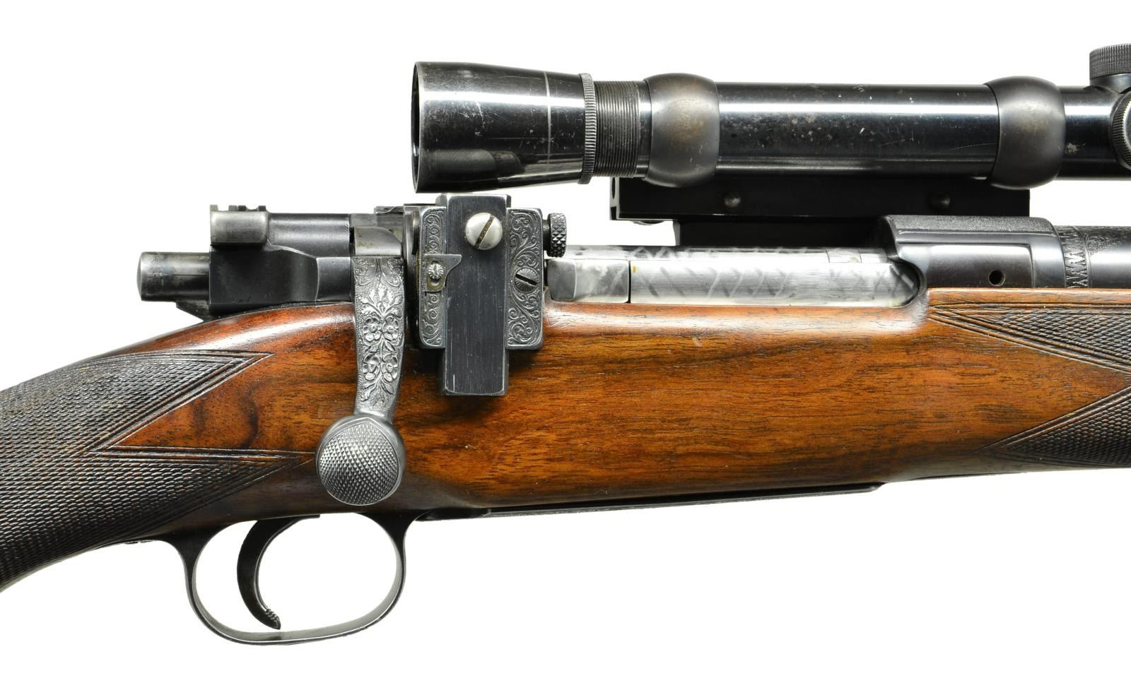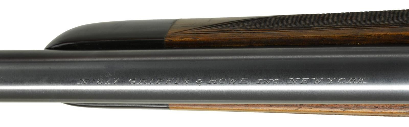 EARLY GRIFFIN & HOWE SPRINGFIELD SPORTING RIFLE WITH SCOPE. Cal. 30-06. S# 817. (CA 1928). A major part of Griffin & Howe's early work was the conversion of NRA Springfield rifles into first class sporters. The work ranged from reshaping and checkering the standard "C Type" stock provided, to a complete reworking with fine embellishment as is the case with this fine rifle. The original 24" star gauge barrel has had sling eye and front sight ramp with gold bead sleeved on. Top of barrel is engraved "No. 817 GRIFFIN & HOWE inc. NEW YORK". Action has had tang reshaped, numbers removed, receiver ring stippled, G&H side mount installed. Original Lyman 48 base has blank slide fitted. Bolt has body polished and damascened, bolt knob is checkered, bottom flattened. Cocking knob is removed giving faster lock time. Military trigger is retained. Bottom metal is unaltered. Barrel, bolt handle, receiver sight base and bottom metal are all engraved by noted master engraver Rudolph Kornbrath; prolific independent engraver who specialized in work on firearms. He emigrated to Hartford, CT in 1910 and worked until he suffered a stroke in 1937. He worked for Colt, Hoffman and private people, as well as doing the preponderance of work for Griffin & Howe in their early years. Barrel has triangle of relief scroll at rear and some scroll decoration around front sight. Top of sling eye band is engraved to match. Receiver itself is not engraved but Lyman base is near fully engraved. Bolt handle is fully relief engraved with some acanthus and rose blossoms which are essentially a Kornbrath signature. Bottom metal is near fully engraved with intricate relief scroll and some ribbons which surround circular vignettes of game animals in relief gold. The center of floorplate depicts a bugling elk on a hilltop, center of trigger guard bow has the portrait of a mountain goat. This scene is flanked by more blossoms. Steel grip cap with trap is engraved to match. Pistol grip stock made of a very fine piece of well figured and marbled European walnut measures 13 1/8" over checkered and engraved steel buttplate with trap (empty). The stock is of the style thought to be the work of Seymour Griffin with its distinctive small cheek piece with shadow line on edge. Stock also features horn forend tip, sling eye, and well cut point pattern checkering around grip and forend. A gold oval engraved with crossed keys is on toeline. Rifle is mounted with what appears to be its original R. Noske 2 1/2 X "Hunter" scope with picket post reticle in steel G&H rings and slide (rear with micrometer adjustment for windage). CONDITION: fine, metal parts retain most of their factory rust blue, thinning overall and with some minor splotches on barrel. Damascening on bolt is bright, stock retains most of an old oil refinish, with a fair number of subsequent marks. Checkering is lightly worn and somewhat clogged with oil. Bore is bright and shiny with sharp rifling throughout, mechanically fine. Scope has some rubs and scratches on its exterior blue, optically clear. (22-5797/MGM). CURIO. $5,000-8,000.