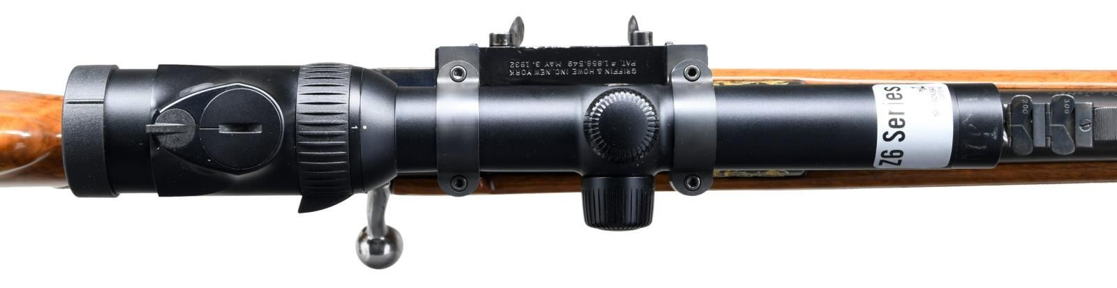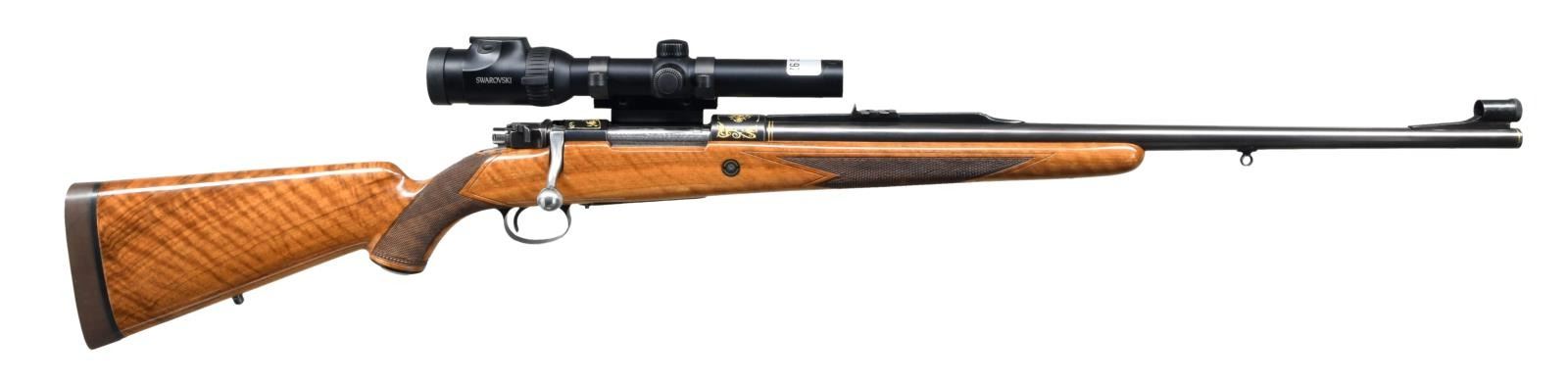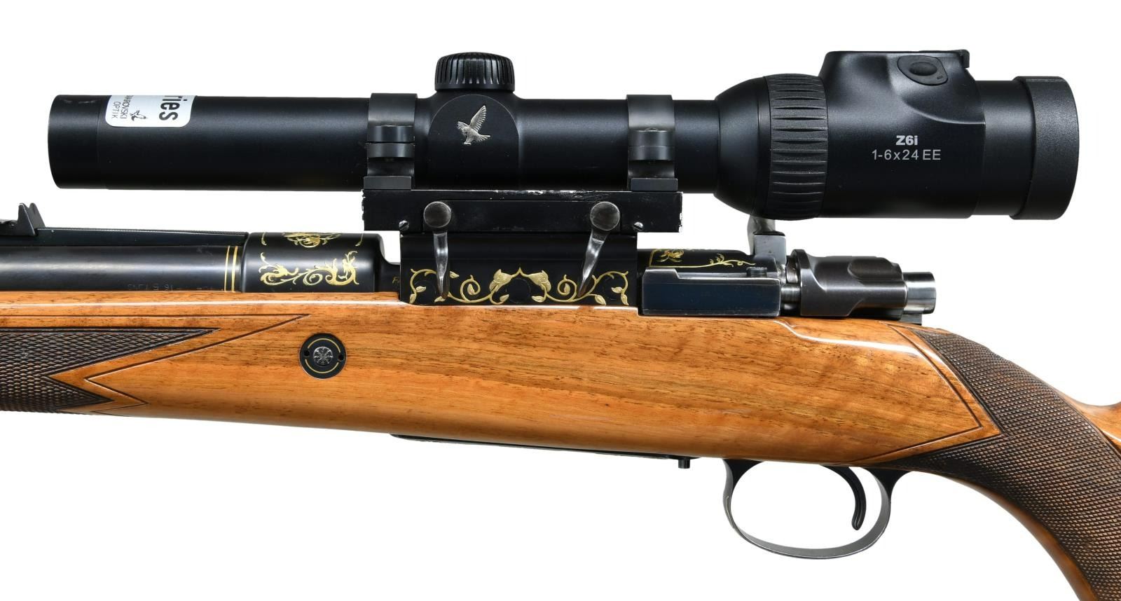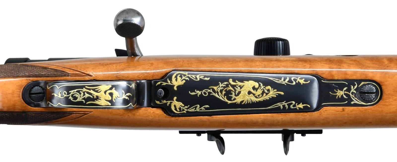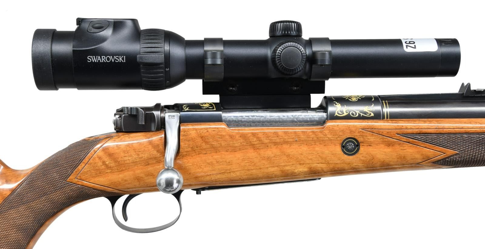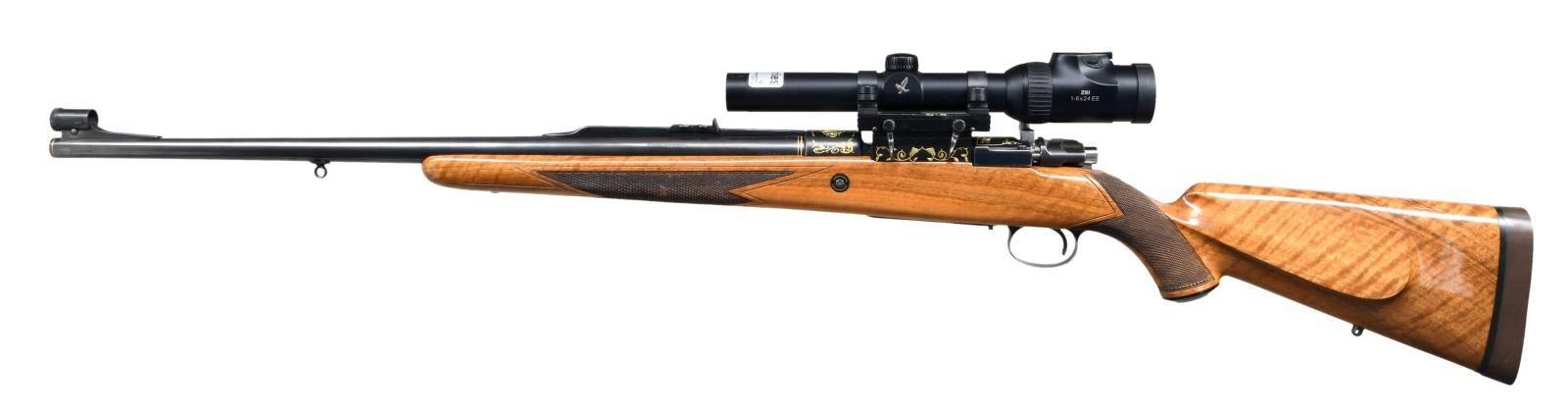 DANGEROUS GAME BOLT ACTION RIFLE. Cal. 404 Jeffery. S#.20843. Very special FN M98 custom shop African hunting rifle. The 2 color raised gold inlay portrays scenes with scroll and feathered dragons on the front receiver ring, floorplate and trigger guard. These scenes are surrounded by additional dragon heads with scroll and borders spewing from their mouths. 2 more dragon heads with foliate scroll adorn the Griffin & Howe side mount scope base. The 24 1/2" heavy tapered round bbl. is finished with gold wire inlay the breech & muzzle ends. An express rear sight with 1 standing and 2 folding leafs is mounted a quarter rib with hand filed serrations. The gold bead front sight and hood are on a hand serrated ramp. The scope is a 30mm Swarovski Z6i series 1-6x24EE with illuminated European 3 post & dot reticle. Straight comb cheekpiece stock of gloss finished light colored thin shell walnut has full length fiddle figure, black grip cap and sling swivel base. The front swivel base is bbl. mounted. The point pattern hand checkering has areas of wide single line & beaded borders. LOP 14 3/8" over a 1 1/8" solid brown pad. Weight with scope 10 lbs., 13 ozs. CONDITION: Very fine showing little use. Over 98% wood & metal finish. The forend checkering shows some gun rack bruising. Bright excellent bore. Scope has bright optics. PROVENANCE: From the Estate of Jon Thomas. (23=1644/DS). MODERN. $5,000-7,000.