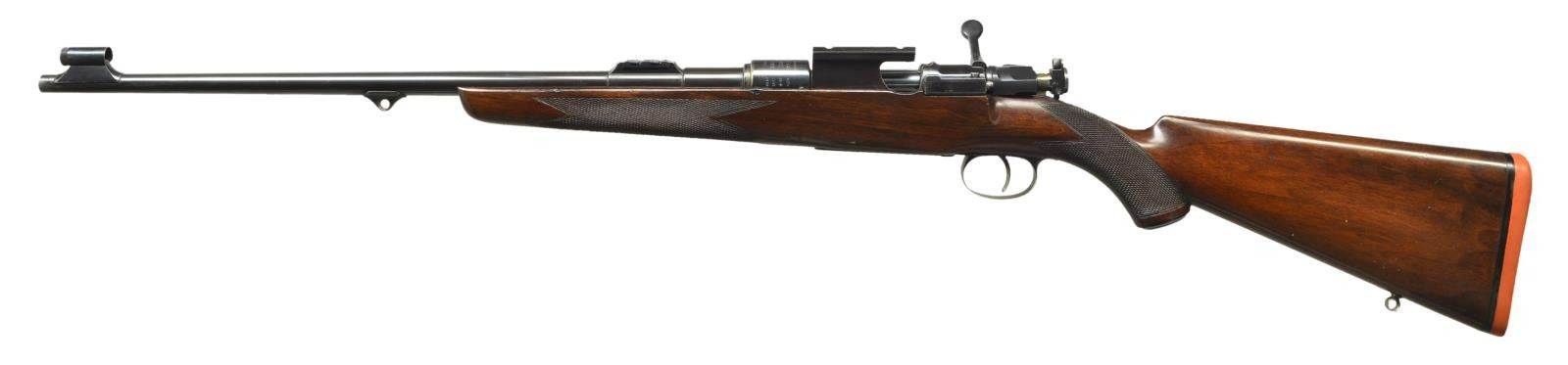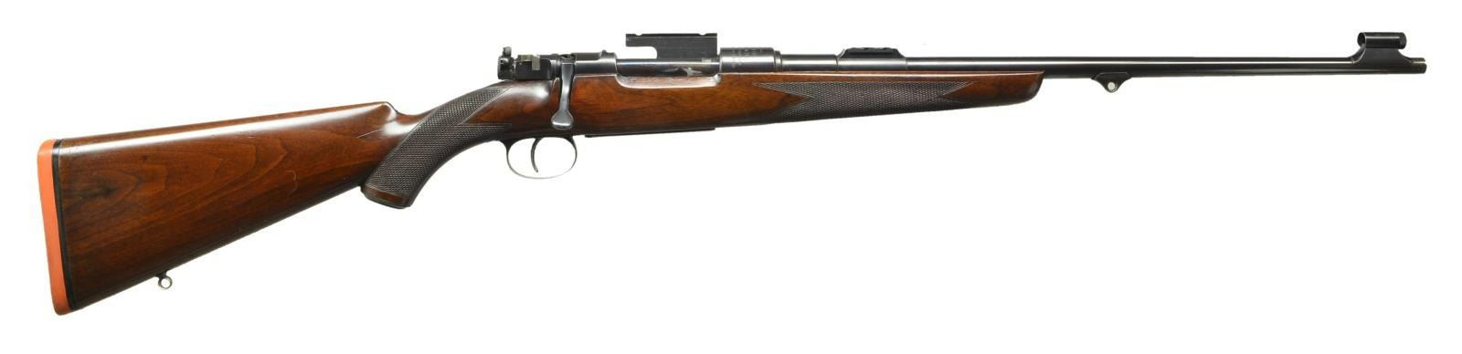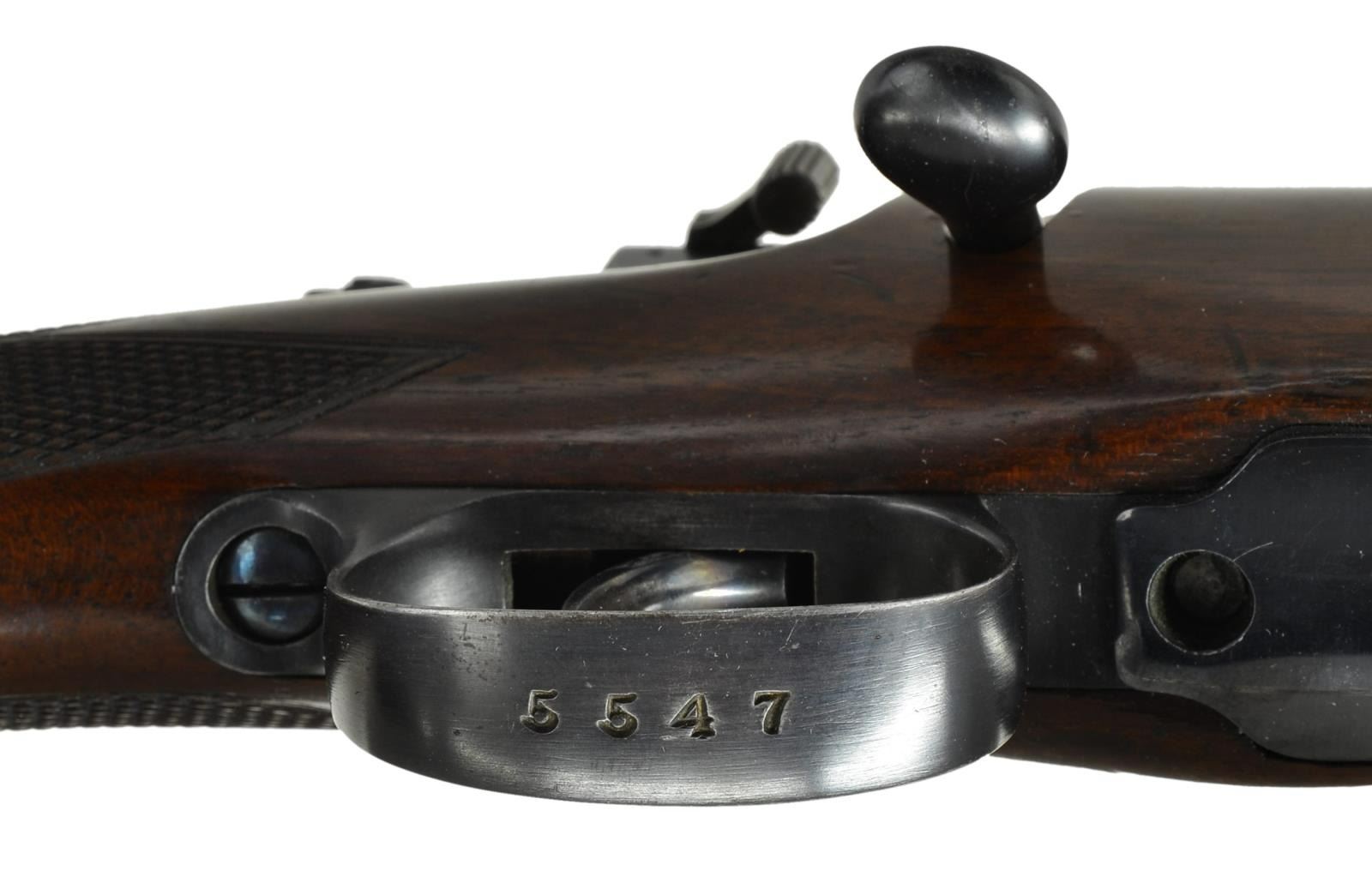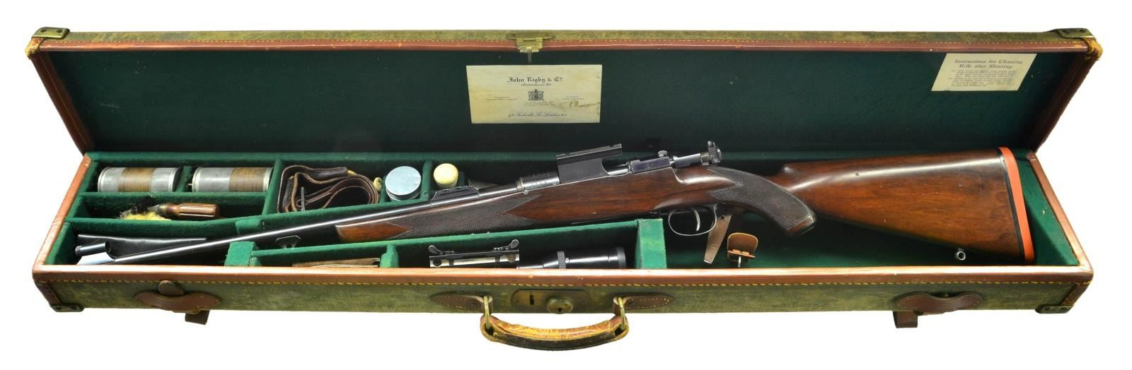 SHORT RIFLE WITH SWAROVSKI SCOPE AND CASE. Cal. 7x57 Mauser. S# 1096/5547. (CA 1933). The 21" tapered round barrel is fitted with two folding leaf rear sight with gold lines and marked for 100 and 200 yds. Gold bead front sight is in classic Rigby style front ramp with knurled protector. Soldered on sling eye is also of classic Rigby style. Standard length, large ring model 98 Mauser action appears to be sourced from a military rifle with S# 1096 stamped on left side of receiver ring above Rigby number (5547) and on bolt root. "96" also appears on bolt stop and cartridge follower. Bottom metal has had lock screw holes welded up and trigger guard bow nicely shaped. Standard military trigger is retained. Receiver ring is engraved "Sighted for" "Rigby's Special" "High Velocity" ".275 Bore Cartridge" "Pointed Bullet 140 Grs." A G&H side mount is installed. Bolt has had handle lowered and lightened. An after market shroud is installed with model 70 type safety. Cocking piece has Rigby patent "pop-up" peep sight installed. Rigby S# is on trigger guard bow. Pistol grip stock of plain, dense European walnut measures 14 3/4" over Silver pad. Stock is of classic Rigby style with short forend without contrasting tip. Grip cap is of horn, well cut point pattern checkering with mullered borders is at grip and around forend. A sling eye is on toeline. Rifle is fitted with brown leather sling attached with rawhide thongs. A Swarovski Habicht 1.5-4.5 scope with duplex retical is in low Griffin & Howe rings and slide. UNATTACHED ACCESSORIES: rifle comes with what appears to be its original green canvas leather trimmed case with brass corners, lined in green cloth. A paper 43 Sackville St. Rigby label is in lid along with cleaning instructions. Case contains hearing trumpet type bore washing funnel, carrying sling, bone bottle with spare front sight, horn handled dusting brush, two walnut handled turn screws, steel cleaning rod, pull through bore cleaner and two tin cans, one for "Special Cleaning Fluid" the other for "Rangoon Oil". There is also an aluminum jar of Motty rifle paste. CONDITION: exceptionally fine, mostly original. Metal parts retaining over 70% original streaky blue/brown. Stock retains what appears to be most of its original finish with a scattering of light marks. Rear barrel sight and bolt shroud are modern replacements; as of course is scope and top mount. Bottom of mount appears to be original. Bore is bright and shiny, mechanically smooth. Scope is very fine with a few scattered marks on exterior, optically clear. Case has some marks and rubs on exterior, canvas is faded, straps and handle are good. Interior cloth is fine as are accessories, label is lightly foxed and soiled. (22-5850/MGM). CURIO. $3,500-5,500.