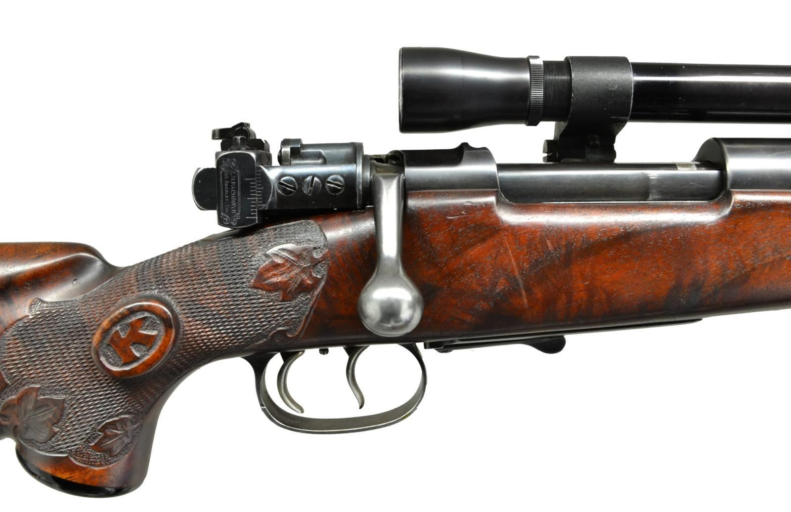 PACHMAYR. Cal. 7mm. (7x57 ?) S# 81535. The 26" medium weight round barrel is fitted with quarter rib with stippled top holding three folding leaf rear sight. Rib partially covers sleeved on band for Pachmayr lo-swing type scope mount. Banded on front ramp holds gold sourdough bead. No markings are noted on barrel. Standard length model 98 commercial Mauser action has rear portion of lo-swing mount added over usual factory markings. Matching bolt with pear shaped knob has had shroud fitted with scarce Pachmayr ghost ring/U-notch rear sight number "121" with windage and elevation adjustments. Staff is engraved "A.M. PACHMAYR" "Los Angeles, Cal" within rectangular device. Original bottom metal is fitted with set triggers and has lever type release for hinged floor plate. Capped pistol grip stock of crotch figured American walnut measures 13 1/2" over solid "NOSHOC" pad. Stock features Monte Carlo comb with Keith design swept right hand cheekpiece, deeply schnabled hard rubber forend tip and sling eyes. Checkered panels at forend and top of grip have flanking carved leaves. Right side of grip is carved with the initial "K" on raised oval pedestal which serves as a palm swell as seen on many rifles custom made for Elmer Keith. Scope mounts are fitted with Lyman "ALASKAN" 2.5 x scope with crosshair and post reticle in lo-swing type rings which are unmarked and possible prototypes. CONDITION: fine. Metal parts retaining over 80% of what appears to be their original blue which has browned considerably on bottom metal. Stock retains what appears to be its original oil finish with some scattered marks. Bores bright and shiny. Mechanically good. Scope shows many marks on exterior, optically good. Mounts show considerable loss of lacquer. An interesting rifle owned by an iconic gun writer. (22-5815/MGM). CURIO. $2,000-4,000.