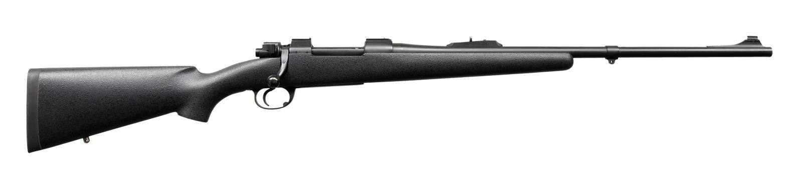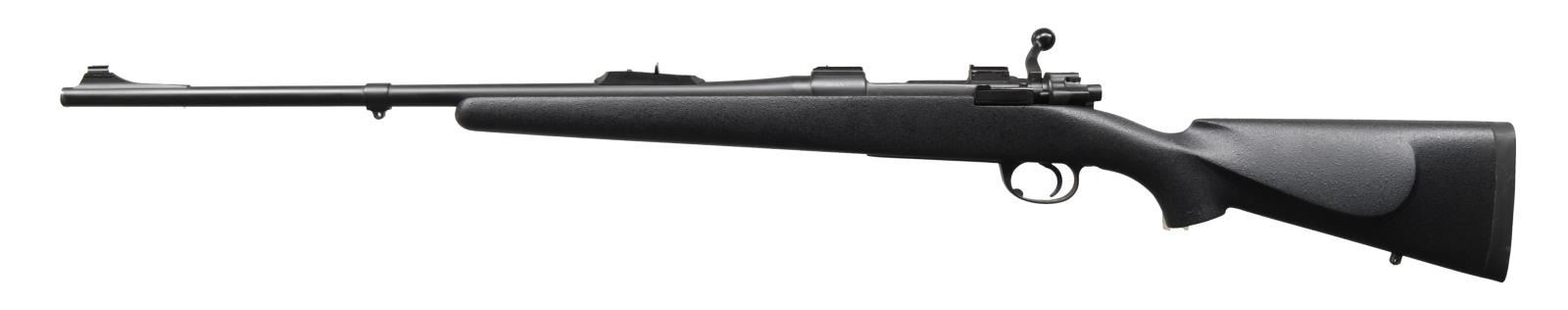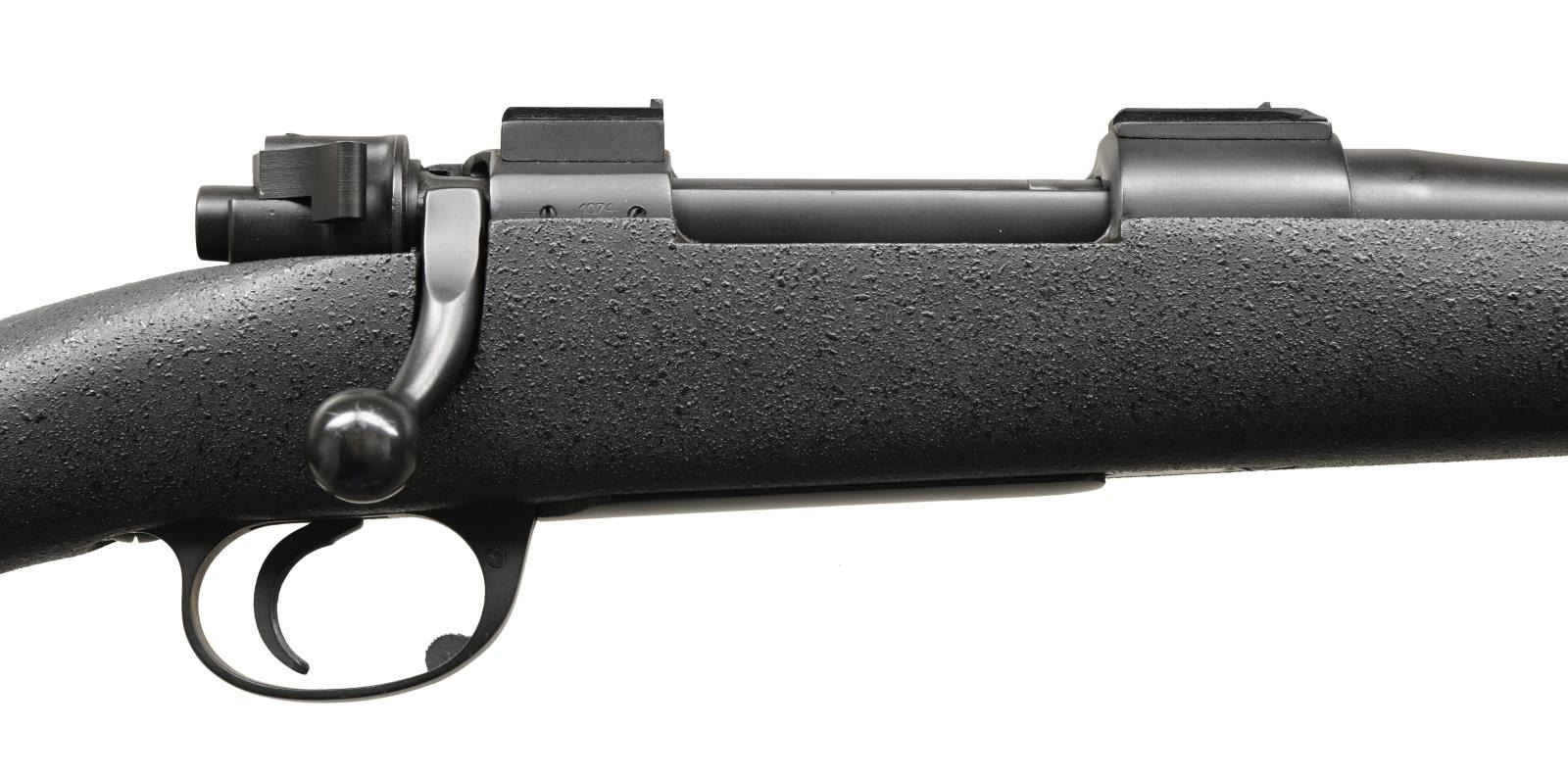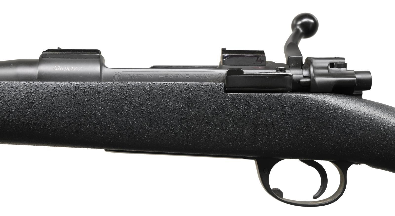 Cal. 338-06. S# B69047. Bbl. 23". Frank Wells of Tucson custom rifle built on a British made Interarms MKX action. Express sights. Scope bases present on receiver. Rear right of receiver has two holes present for sight mounting. Bolt is numbered "5144". Matte black finish. Black synthetic stock w/ left side cheekpiece & bottom mounted sling studs w/ one stud on bbl. band. Pachmayr Decelerator pad. LOP: 14". CONDITION: muzzle shows some flaking. Other aspects rate very good plus or better. (23-4788/MJC). MODERN. $2500-3500.