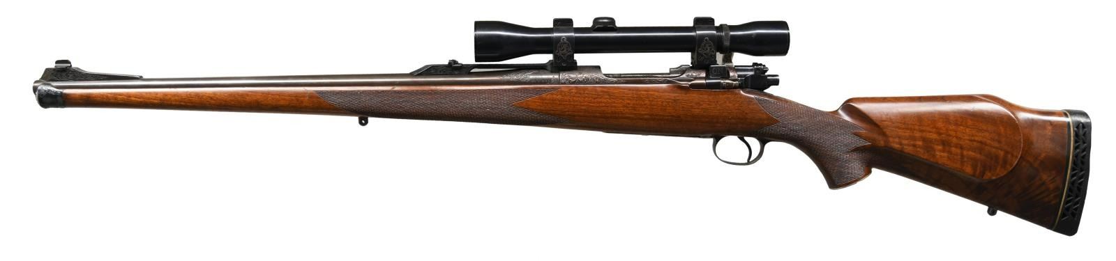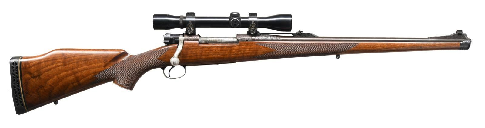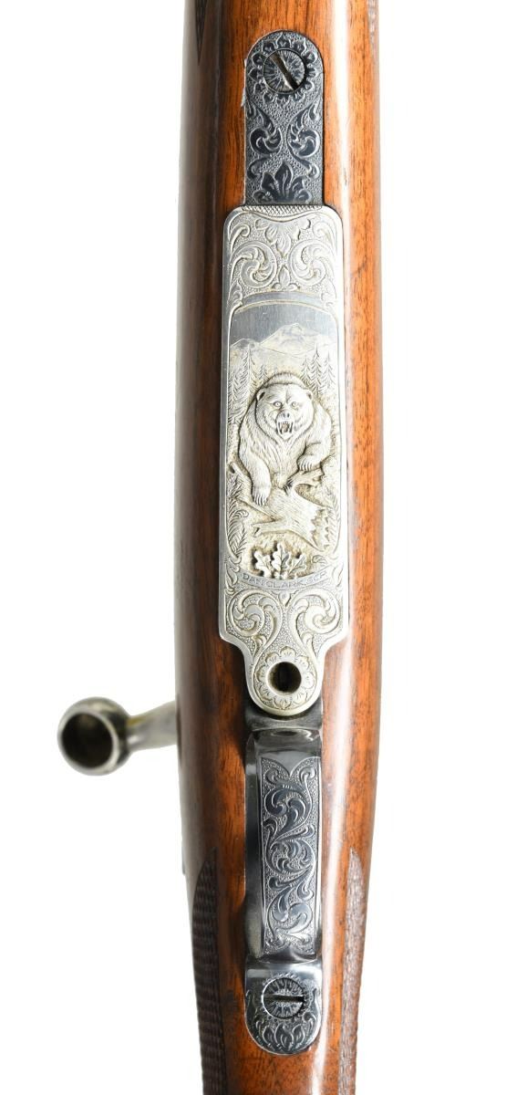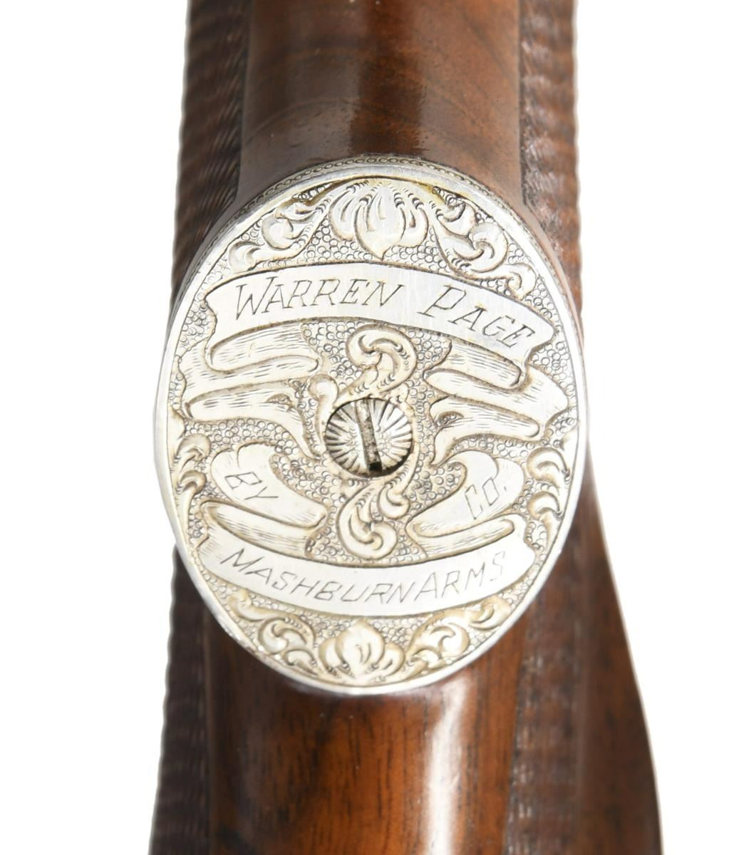 CARBINE BY MASHBURN ARMS CO. WITH SCOPE. Cal. 35 S. Mag. S# NSN. Warren Page was the shooting editor for Field & Stream magazine for a quarter of a century. He was also the author of many books including "The Accurate Rifle". This rifle with Warren Page's name on grip cap has 20" medium weight round barrel fitted with custom quarter rib incorporating front scope base and folding leaf Lyman rear sight. A gold sourdough bead is in matching front ramp. Left rear of barrel is marked "MASHBURN" "ARMS CO." "35 S. MAG". Springfield action has had bolt handle lowered, Buehler safety installed and body engine turned. Cocking piece has been altered to speed lock. A commercial trigger (probably Mashburn) has been installed. Bottom metal has had trigger guard thinned. Barrel and action are engraved with large shaded scroll; receiver ring is stippled. Nickel plated floor plate has full relief rendering of charging grizzly bear in western setting, ribbon below this scene is marked "DAN CLARK, SCP." Full length stock of crotch figured American walnut measures 13 1/2" over black white line pad. Stock style appears to be that of Reinhart Fajen with Monte Carlo comb and Keith design swept right hand cheekpiece. Stock also features steel forend cap, sling eyes and well cut semi fancy pattern checkering at grip and around forend. Plated steel grip cap has engraving that matches the rest of rifle which surrounds folded ribbons engraved "Warren Page" "BY Co." "MASHBURN ARMS" (a well known custom rifle maker from the 50's & 60's that specialized in wildcat magnum calibers). Rifle is fitted with unmarked (probably Weaver) 4X scope with cross hair reticle in "QD" rings that are engraved to match action. CONDITION: exceptionally fine, retaining nearly all custom finishes by Mashburn with a good scattering of marks and dings associated with field use. Bore is bright and shiny. Mechanically fine. Scope is also fine, optically clear. (22-5847/MGM). CURIO. $2,500-6,000.