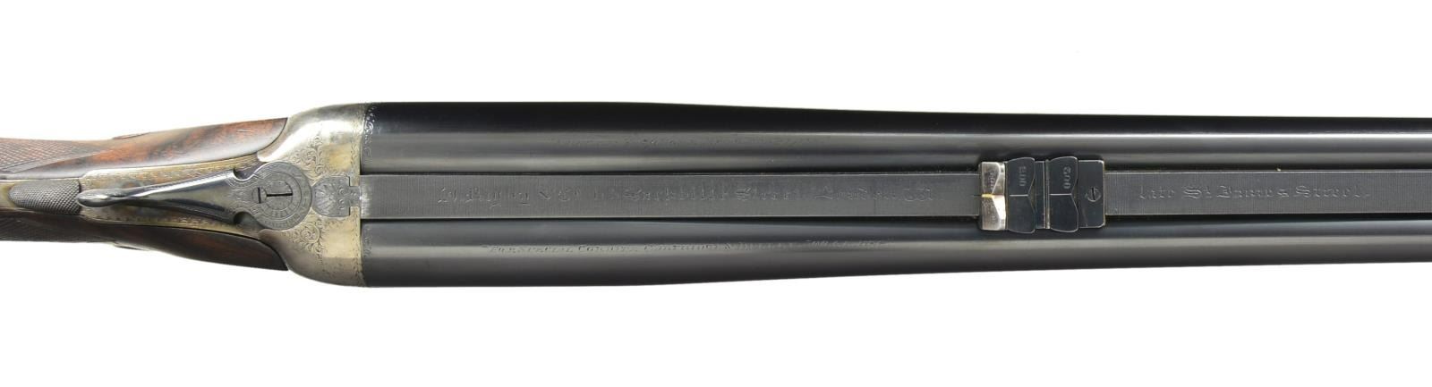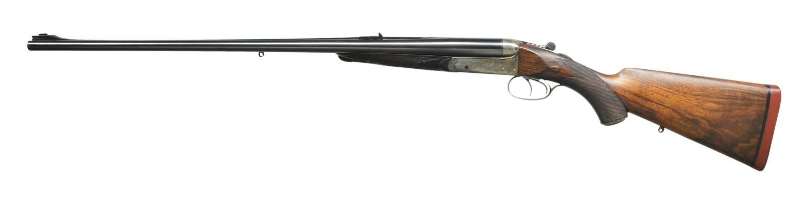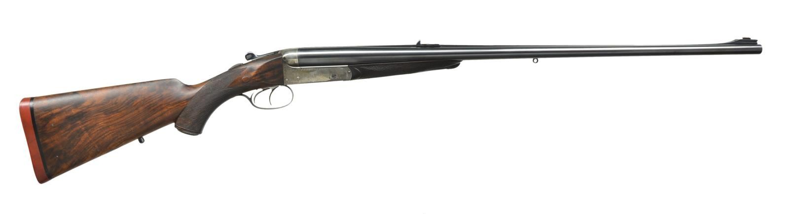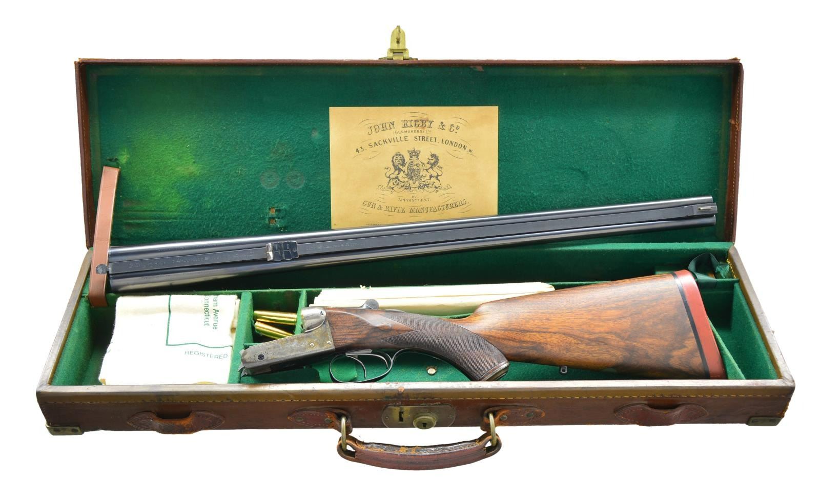 DANGEROUS GAME DOUBLE RIFLE IN 470 NITRO WITH CASE. Cal. 470 Nitro. S# 17560 (CA 1910). The 470 nitro was developed after the prohibition of military caliber (.450) sporting rifles in 1905. It gave ballistics similar to the popular 500-450 nitro. This rifle has 28" chopper lump barrels fitted with full length matted rib, central portion slightly cut away forming quarter rib and front sight ramp. Rib is fitted with one standing, two folding leaf express rear sight and silver bead front. Top of rib is engraved in old English script with Rigby's Sackville Street address. Tops of barrels are engraved with caliber markings and loads. Barrel flats are stamped with S#, caliber info, Rigby RR trademarks, and "CLASS C". A sling eye is soldered to bottom rib. Case hardened Webley long bar, screw grip boxlock action features non-automatic saftey ("SAFE" inlaid in gold), screw grip third fastener engaging square shouldered dolls head rib extension, bushed strikers, and double triggers. Breech face is also stamped "CLASS C". Action is engraved with some sprays of scroll and small scroll borders. "J. Rigby & Co." is on each side. Blued top lever, floor plate, trigger plate and trigger guard are engraved to match. S# is on trigger guard tang which extends to case hardened grip cap. Well marbled and lightly figured European walnut pistol grip buttstock measures 14 7/8" over Silver type pad. Stock features drop points, point pattern checkering, later sling eye and vacant silver oval. Matching splinter Southgate ejector forend has forward pivoting lever release. MEASUREMENTS: STOCK: DAH: approx. 2 3/4". DAC: approx. 1 13/16". CAST: neutral. LOP: 14 7/8". WEIGHT: 10 lb. 15 oz. UNATTACHED ACCESSORIES: rifle is housed in what is possibly its original leather case with brass corners. Top is embossed "J.A.T.". Interior is lined it green cloth, and there is a reproduction Rigby paper label in lid. Case contains a target shot at 40 yds. showing good shot placement, pair of snap caps, bench cloth, spare firing pins, and a sealed box of five 470 soft nose cartridges by Westley Richards. CONDITION: fine as mostly refinished. Barrels retaining nearly all of a best reblack, engraving softened. Action retains about 30% original case hardening color were protected, the balance gray shading to brown. Blued parts show most of a reblue with soft engraving. Stocks have nearly all of an oil refinish, checkering recut. Bores are fine, with strong rifling throughout but also show light frosting throughout. Target indicates that the rifle still shoots well. Action is tight, barrels on face, ejectors strong and in time. Case leather has darkened and has many rubs and marks. Straps and handle are good, interior cloth is good with stains and marks, snap caps are new. (22-5830/MGM). CURIO. $8,000-12,000.