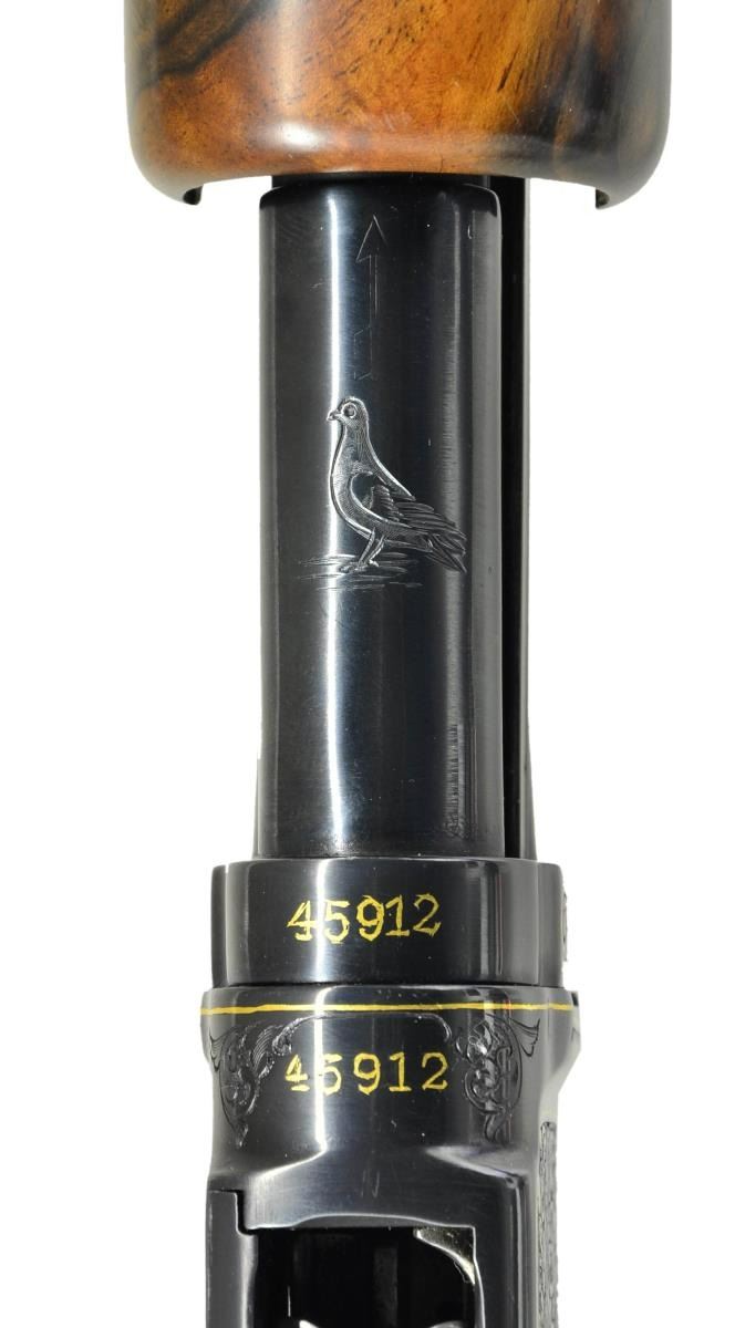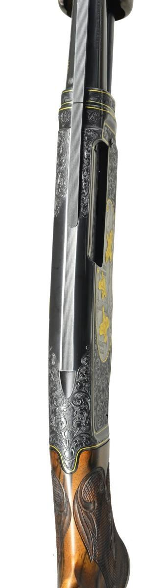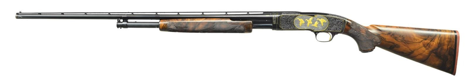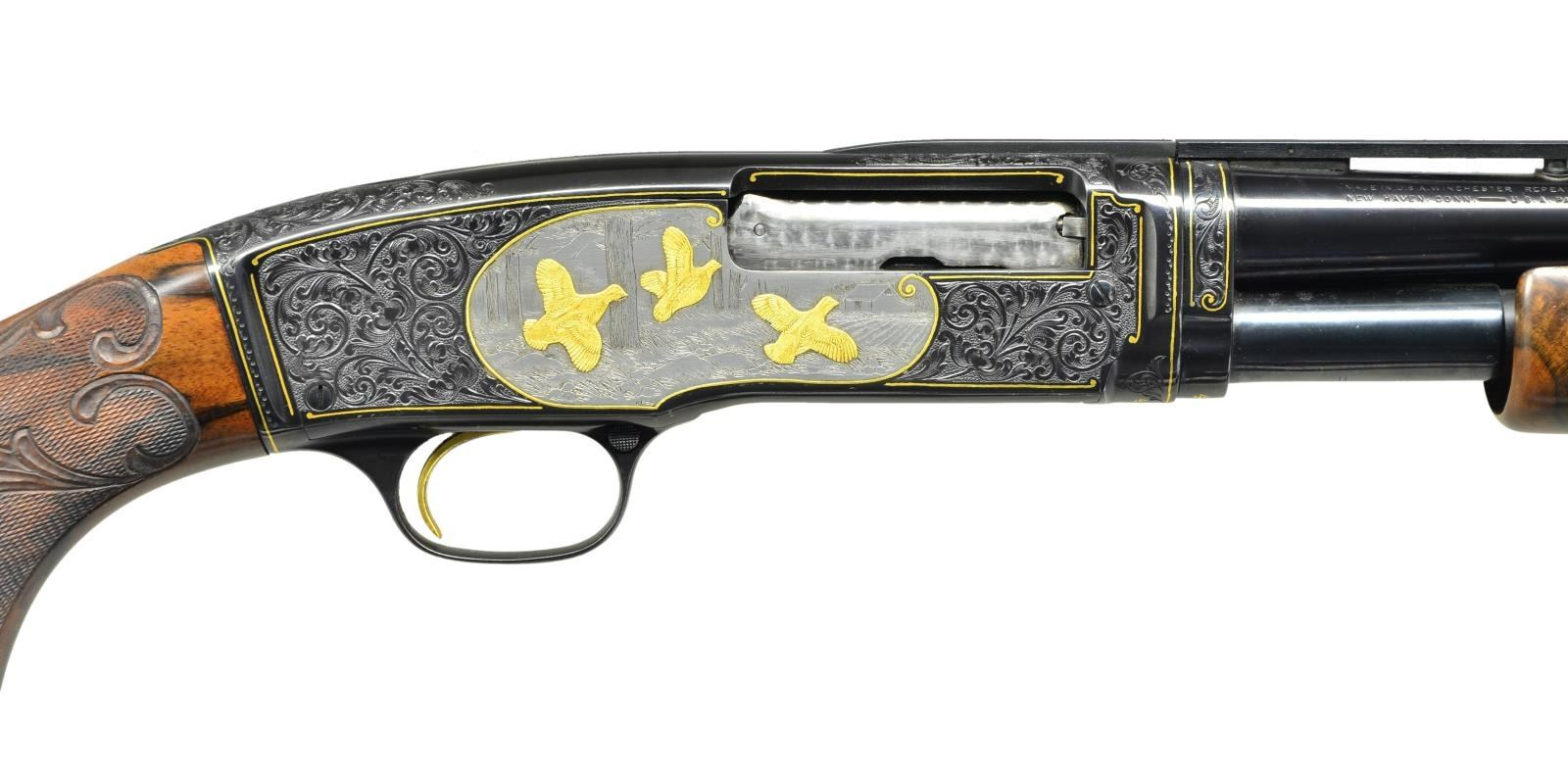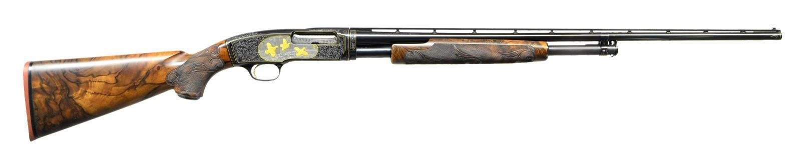 CUSTOM PUMP SHOTGUN. Cal. 410 3". S# 45912. An excellent example of engraving by Angelo Bee, former Browning master engraver. Action has full coverage vine type foliate scroll w/ punch dot backgrounds & gold inlaid borders surrounding French gray game scenes. Right side features 3 gold inlaid flushing quail. Left side depicts 4 gold inlaid mallards. Scroll highlights extend to receiver extension, mag. band, mag. cap & muzzle. Gold highlights include inlaid S#s & choke markings w/ gold band at muzzle. Bottom of receiver extension has engraved pigeon. Angelo's signature is found along bottom of both game scenes. Gold finished trigger. Breech bolt & carrier are jeweled. Bbl. 28" w/ round post donut base style vent rib. Fixed Mod choke. White target front sight w/ white mid bead. Custom beavertail forearm & steel capped pistol grip stock of satin finished thin shell walnut. Borderless segmented hand checkering is highlighted w/ richly carved foliate borders. LOP: 14 1/8" over thin red Winchester pad. Mfg. 1941. CONDITION: near excellent as refurbished. Very good bright bore. (23-470/DS). CURIO. $10,000-15,000.
