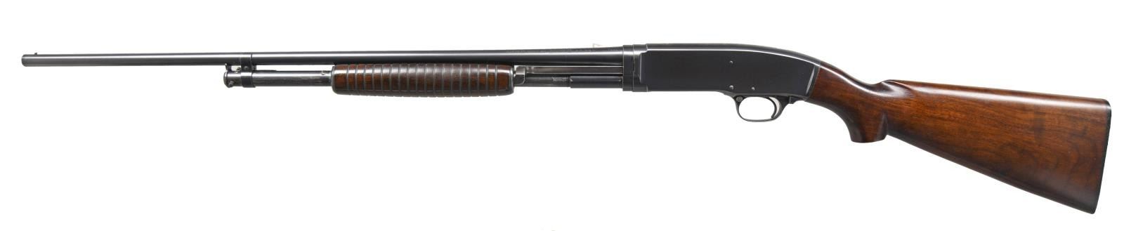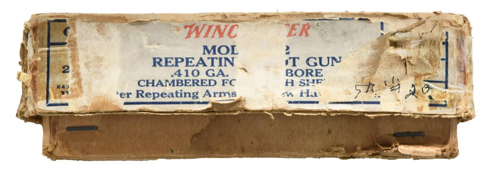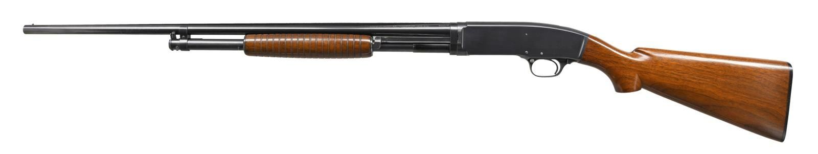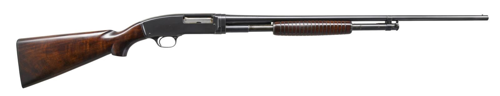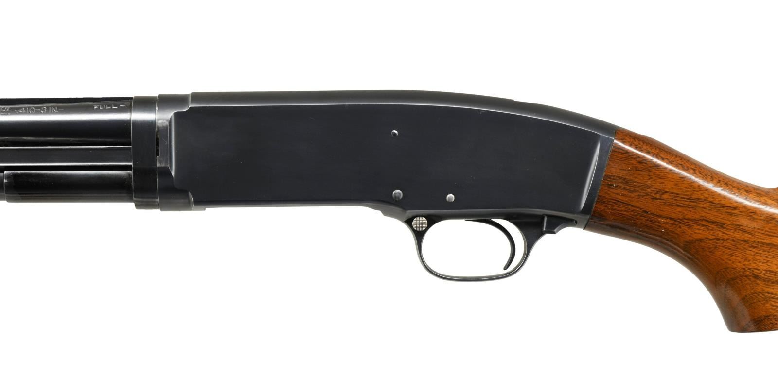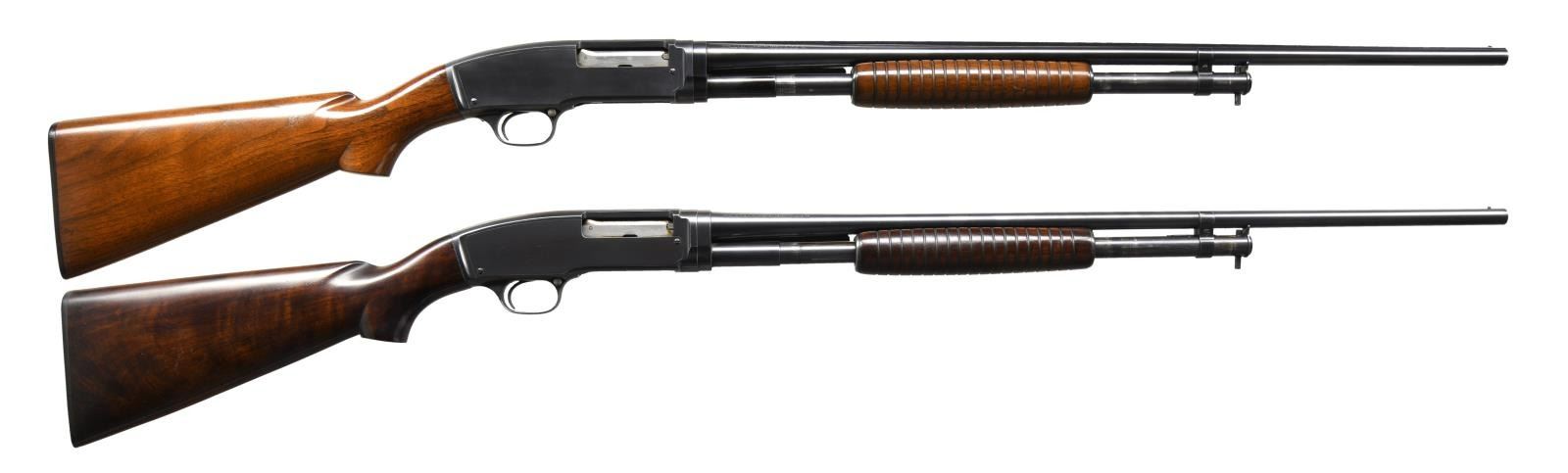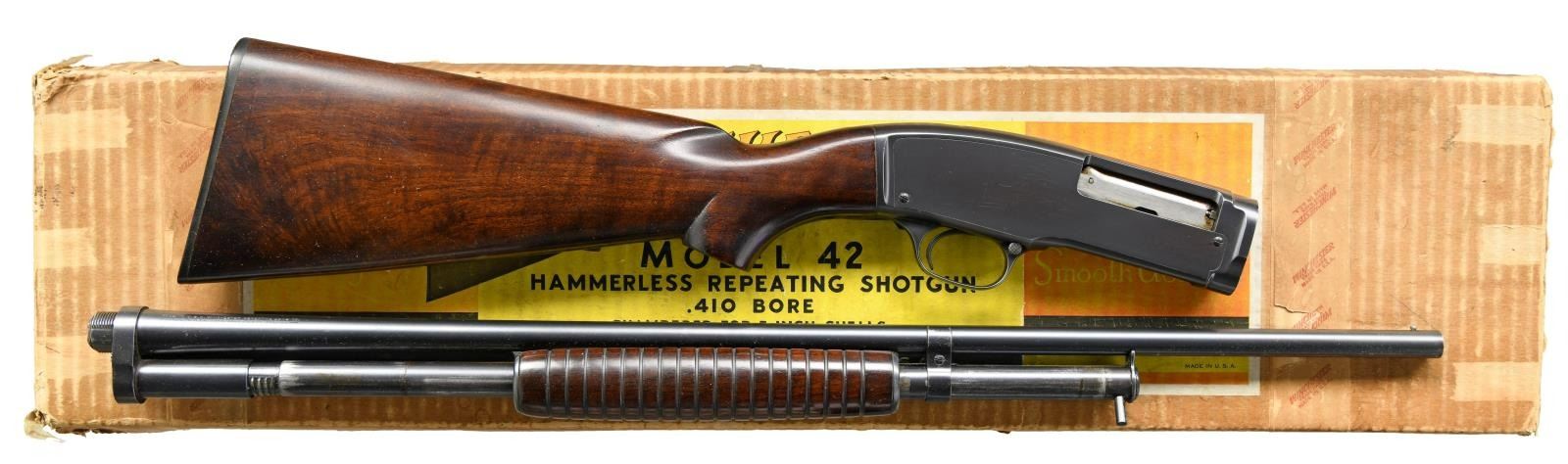 CONSECUTIVELY NUMBERED (S# 20 & S# 21)PAIR OF PUMP SHOTGUNS. Both Cal. 410. 3". Production of model 42s began w/ serial number 1 in 1933. GUN 1: S# 20. Bbl. 26" plain w/ fixed full choke & steel bead. Small round grooved forearm. Pistol gripped stock of nicely grained walnut w/ original buttplate. UNATTACHED ACCESSORIES: picture box w/ inserts. Partially intact label has added hand written serial number 20. Box has taped corners, tape damage w/ faded picture. CONDITION: metal retains over 90% dull blue indicating possible touch up finish. Sanded wood has a dark refinish. Bright near excellent bore. (23-4890/DS). GUN 2: S# 21. Bbl. 26" w/ solid rib & fixed full choke. Solid rib barrels were not cataloged until 1934. Bottom of bbl. has original 2 digit date code "33". Could this be the first solid rib Model 42 produced? Steel front bead. Small round grooved forearm. Pistol grip stock w/ original buttplate. UNATTACHED ACCESSORIES: picture box w/ inserts. Partially intact label has hand written serial number 21. Box has torn corners, tape damage w/ small areas of the top picture missing. CONDITION: over 95% blue showing slide wear & possible touch up. Very good original wood finish showing small marks & dents. Bright near excellent bore. (23-4891/DS). BOTH CURIO. $6,000-9,000.