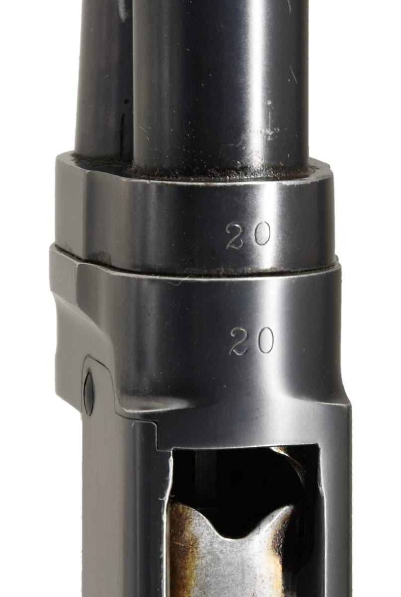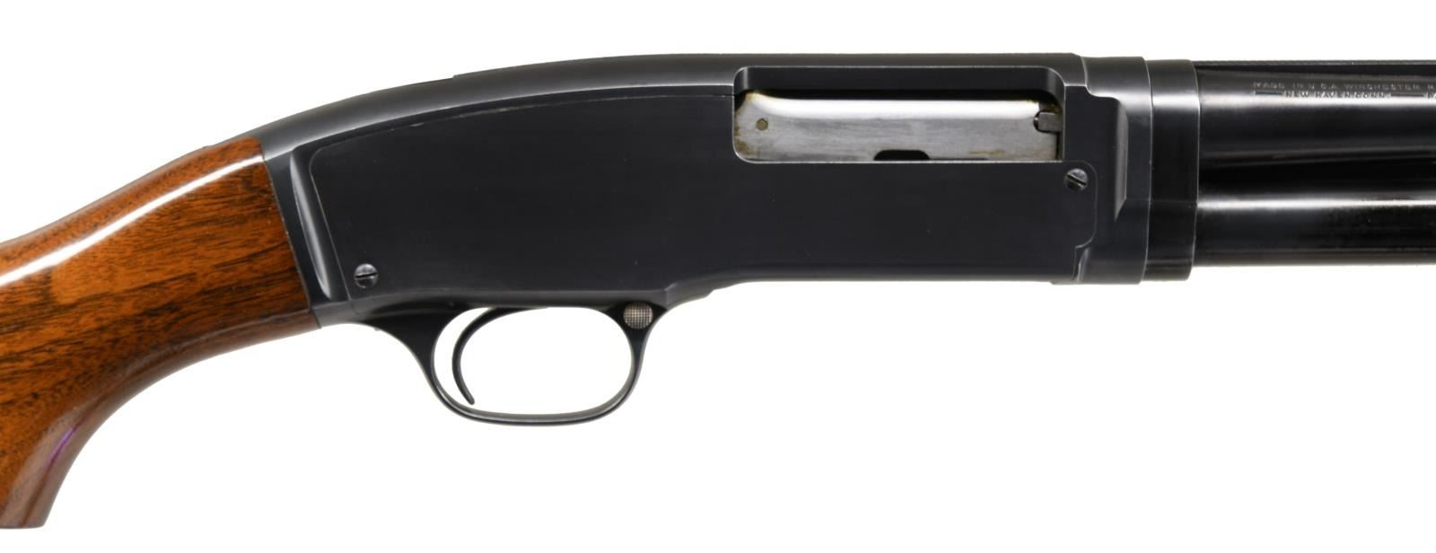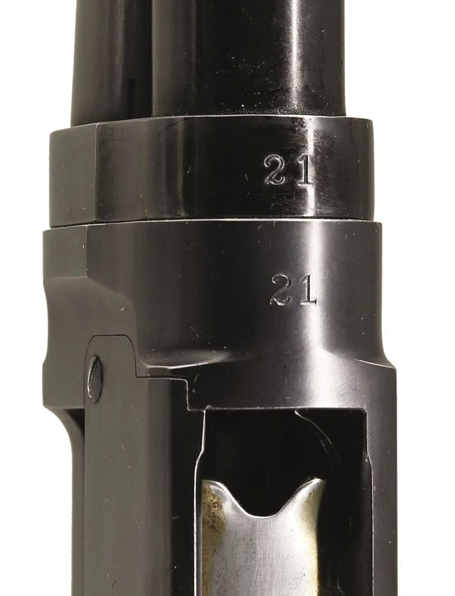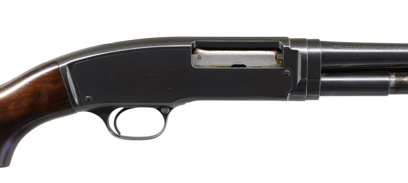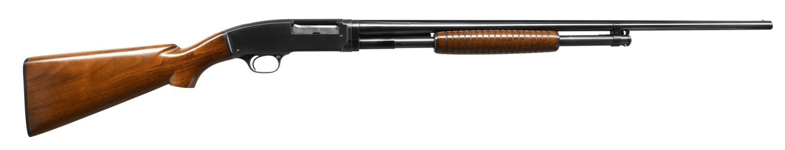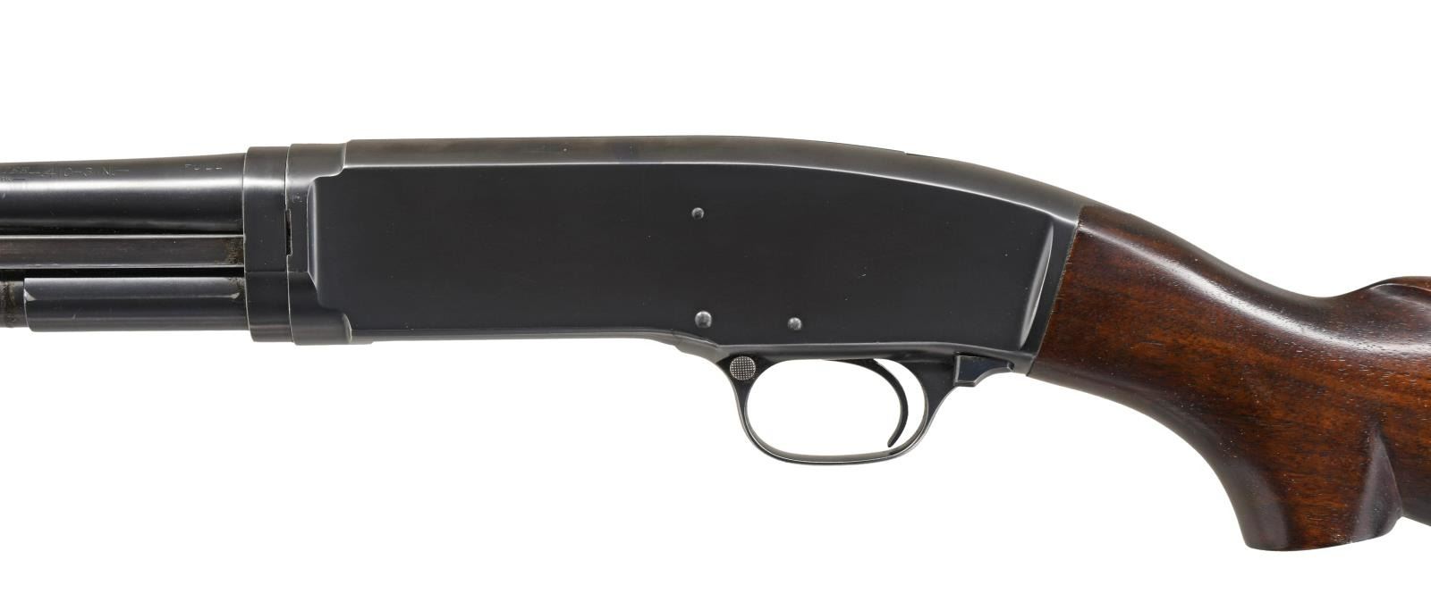 CONSECUTIVELY NUMBERED (S# 20 & S# 21)PAIR OF PUMP SHOTGUNS. Both Cal. 410. 3". Production of model 42s began w/ serial number 1 in 1933. GUN 1: S# 20. Bbl. 26" plain w/ fixed full choke & steel bead. Small round grooved forearm. Pistol gripped stock of nicely grained walnut w/ original buttplate. UNATTACHED ACCESSORIES: picture box w/ inserts. Partially intact label has added hand written serial number 20. Box has taped corners, tape damage w/ faded picture. CONDITION: metal retains over 90% dull blue indicating possible touch up finish. Sanded wood has a dark refinish. Bright near excellent bore. (23-4890/DS). GUN 2: S# 21. Bbl. 26" w/ solid rib & fixed full choke. Solid rib barrels were not cataloged until 1934. Bottom of bbl. has original 2 digit date code "33". Could this be the first solid rib Model 42 produced? Steel front bead. Small round grooved forearm. Pistol grip stock w/ original buttplate. UNATTACHED ACCESSORIES: picture box w/ inserts. Partially intact label has hand written serial number 21. Box has torn corners, tape damage w/ small areas of the top picture missing. CONDITION: over 95% blue showing slide wear & possible touch up. Very good original wood finish showing small marks & dents. Bright near excellent bore. (23-4891/DS). BOTH CURIO. $6,000-9,000.