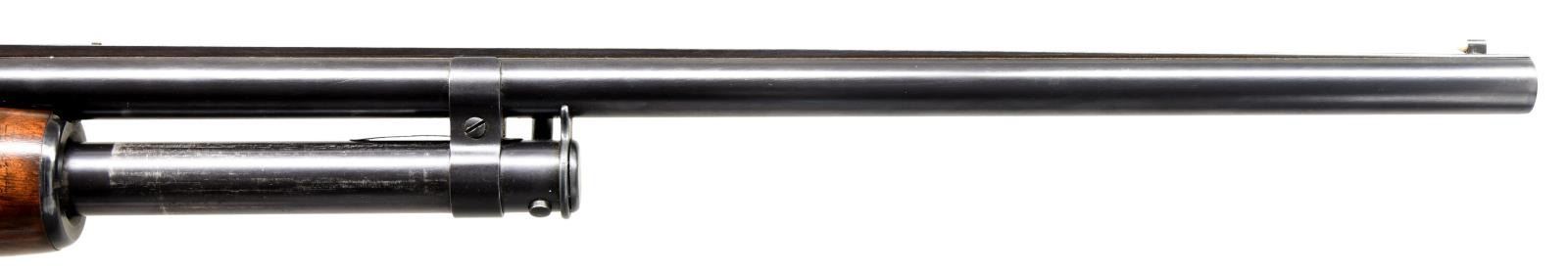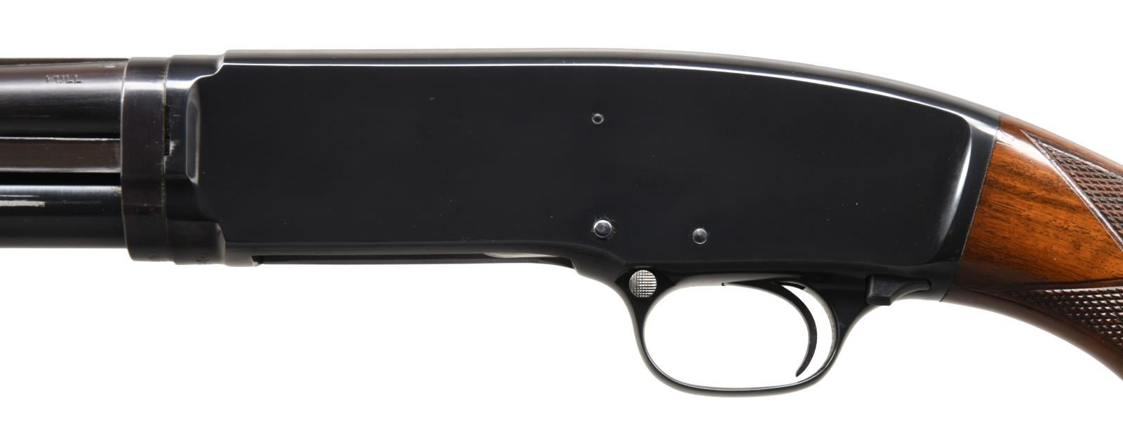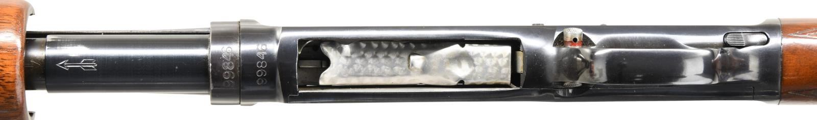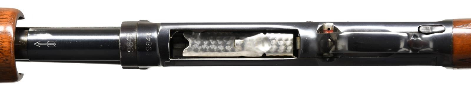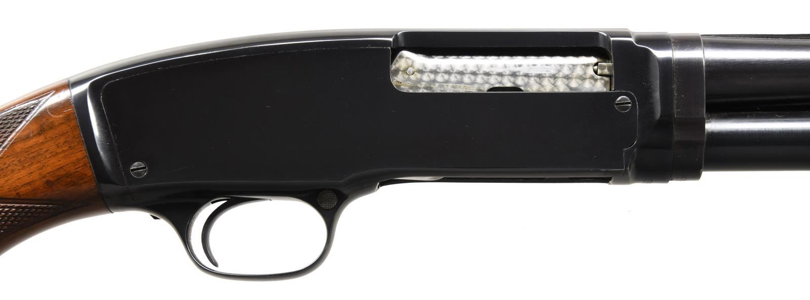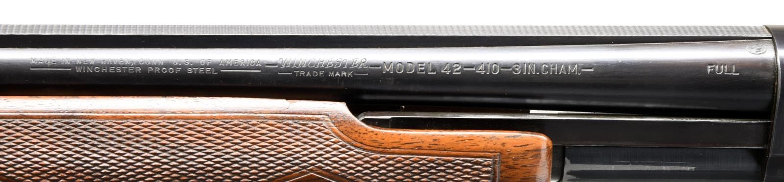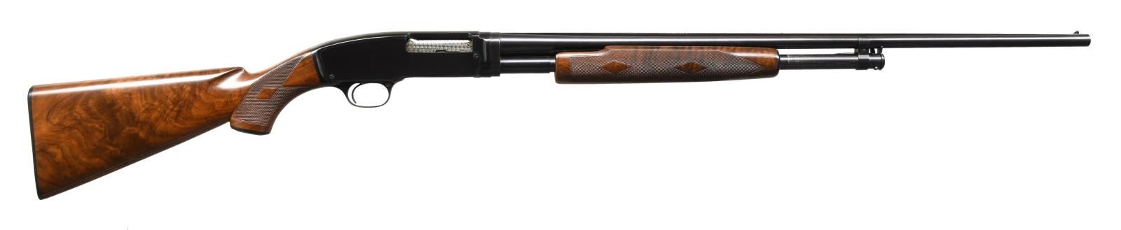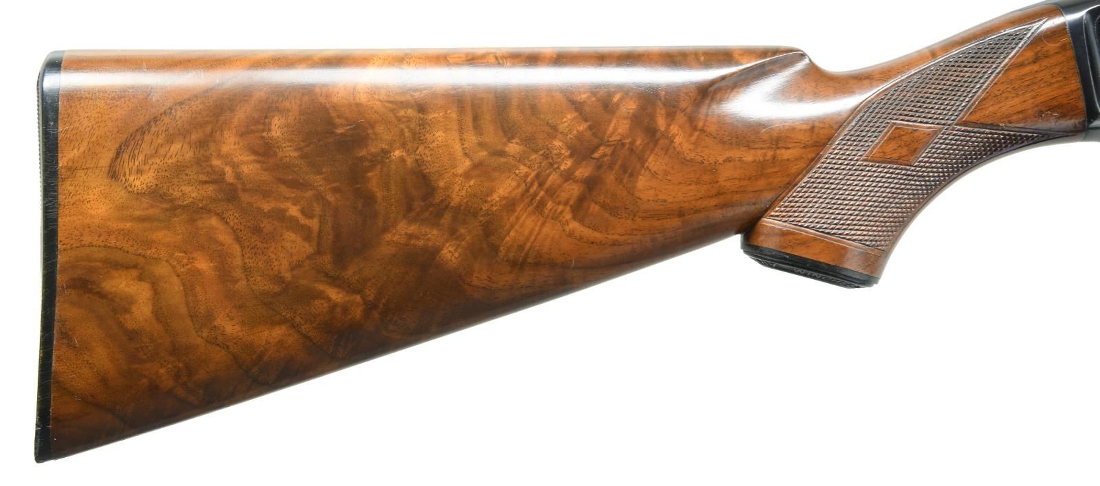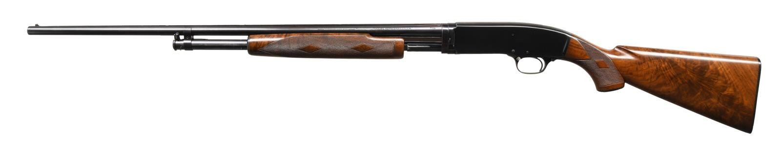 Cal. 410. 3". S# 99846. Bbl. 26" w/ solid rib & fixed full choke. White target front sight w/ white mid bead. Jeweled bolt & carrier. Beavertail forearm & hard rubber capped pistol grip stock of fancy black walnut has double diamond deluxe factory checkering. LOP: 13 3/4" over original buttplate. Mfg. 1953. CONDITION: over 97% blue showing slide wear. Original wood finish shows small scratches & marks. Inside of action as viewed through the ejection port has a cleaned appearance. Bright near excellent bore. (23-4879/DS). CURIO. $5,000-7,500.