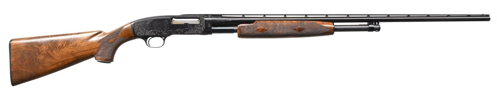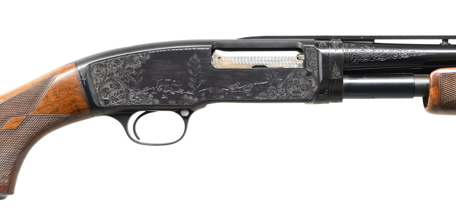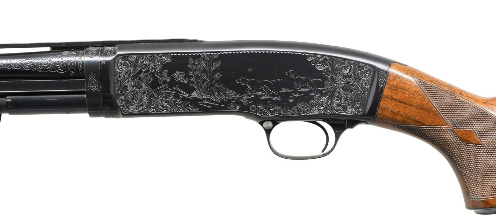 SHOTGUN. Cal. 410. 3". S# 115407. Bbl. 28" w/ added small round donut post vent rib. Fixed full choke. Steel bead. Action has no. 5 style unsigned aftermarket engraving. Right side woodland scene depicts a pointer & 2 birds. Left side scene shows 2 pointers & 2 flushing partridges. Scenes are surrounded by vine type scroll w/ punch dot backgrounds that extends to upper & lower receiver areas, receiver extension & breech end of bbl. Receiver extension has an added pigeon. Jeweled bolt & carrier. Custom aftermarket beavertail forearm & pistol grip stock of fancy walnut have double diamond deluxe style hand checkering & checkered steel grip cap. LOP: 14 1/4" over Winchester buttplate. Mfg, 1954. CONDITION: over 98% custom reblued finish. Custom wood has good finish showing a few marks. Takedown is extremely stiff & may be an indication of replacement bbl. Very good bore. (23-4873/DS). CURIO. $4000-6000.