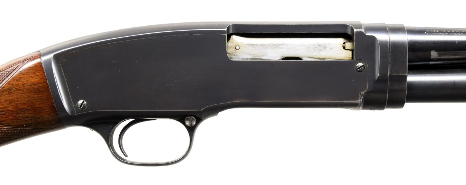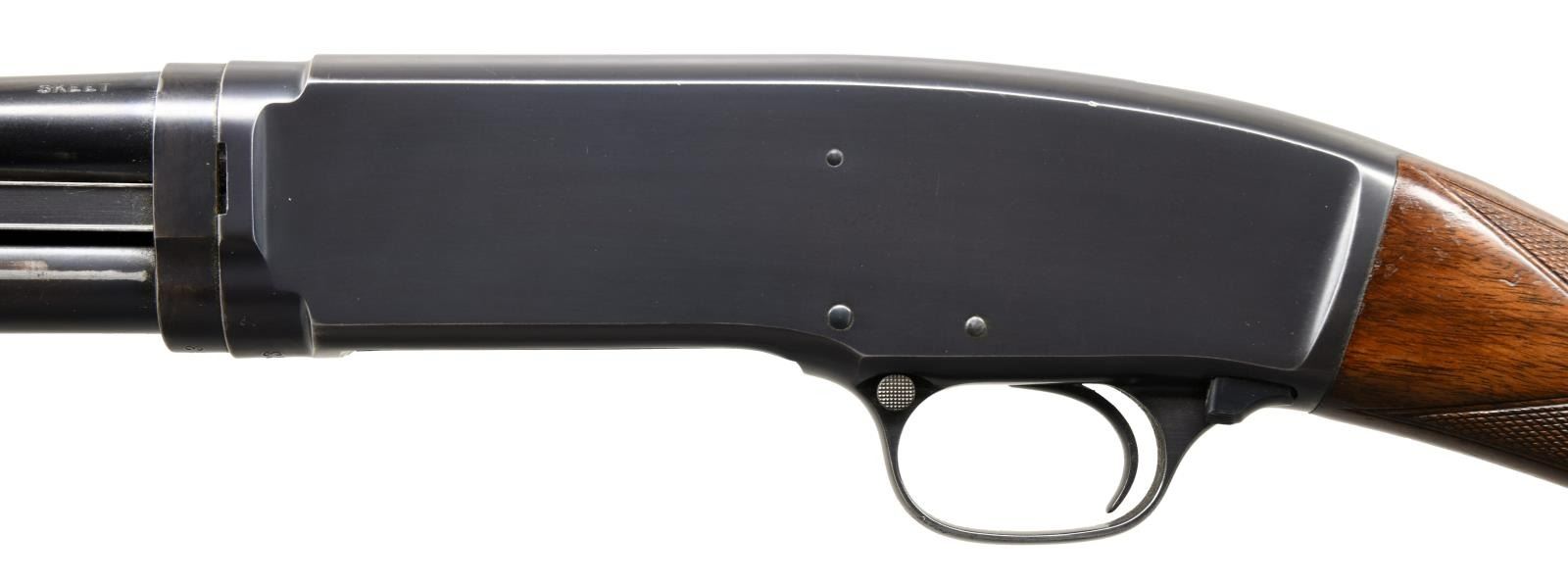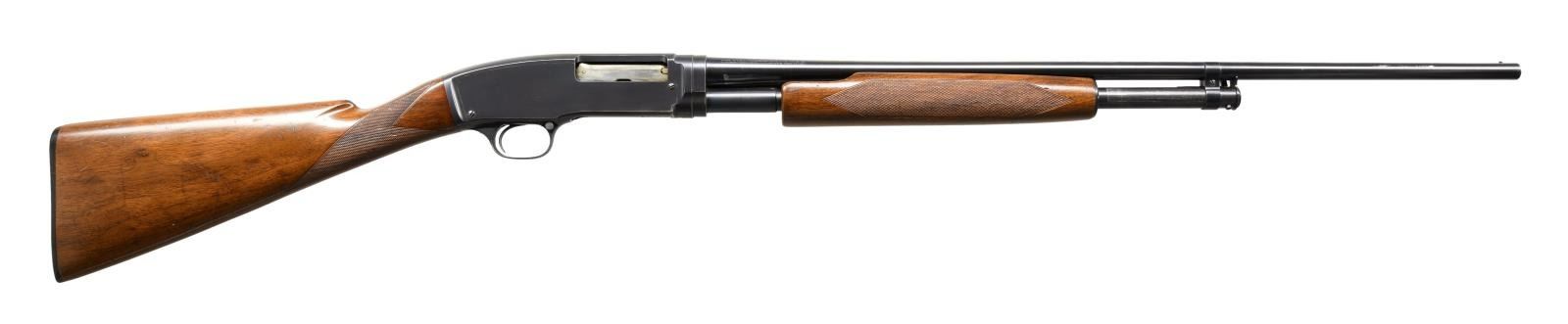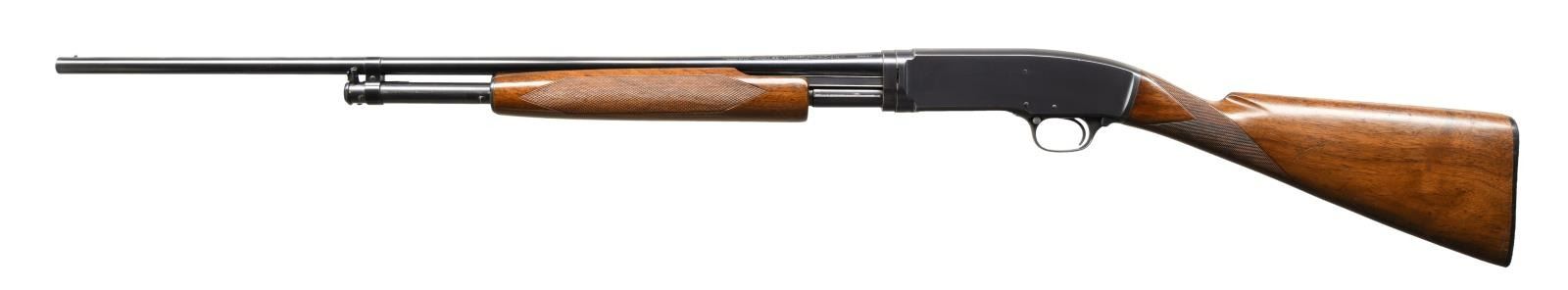 SKEET GRADE PUMP SHOTGUN. Cal. 410 ga. 3". S# 5933. Bbl. 26" plain w/ fixed SKEET choke. Beavertail walnut forearm & straight grip stock w/ target checkering. LOP: 13 3/4" over original buttplate. Mfg. 1933. CONDITION: 95% lightly worn blue showing carry & edge wear w/ wear spots on bbl. Lightly worn original wood finish & checkering showing numerous scratches & marks. Very good bright bore. (23-4803/DS). CURIO. $3000-4000.
