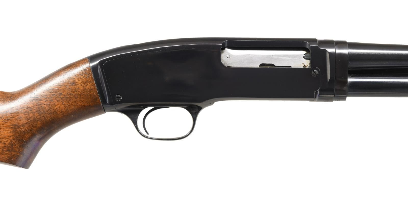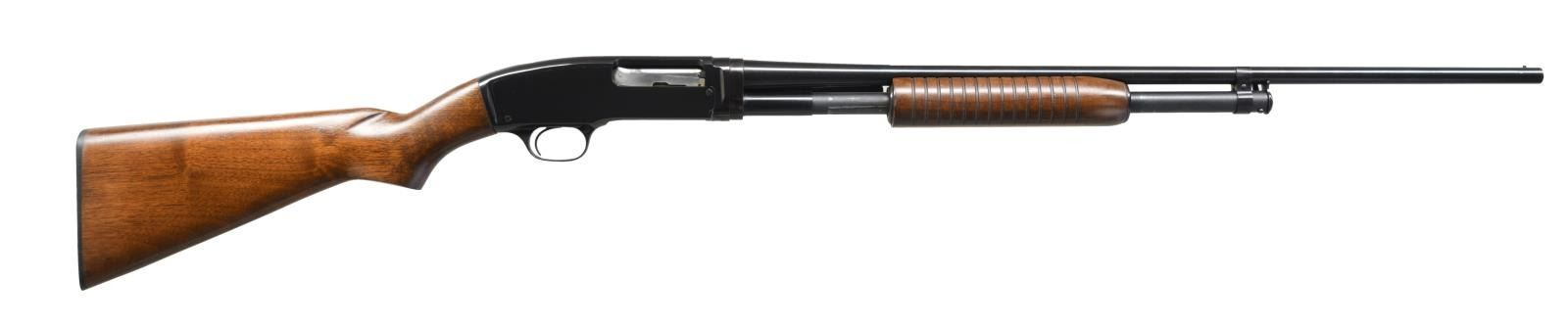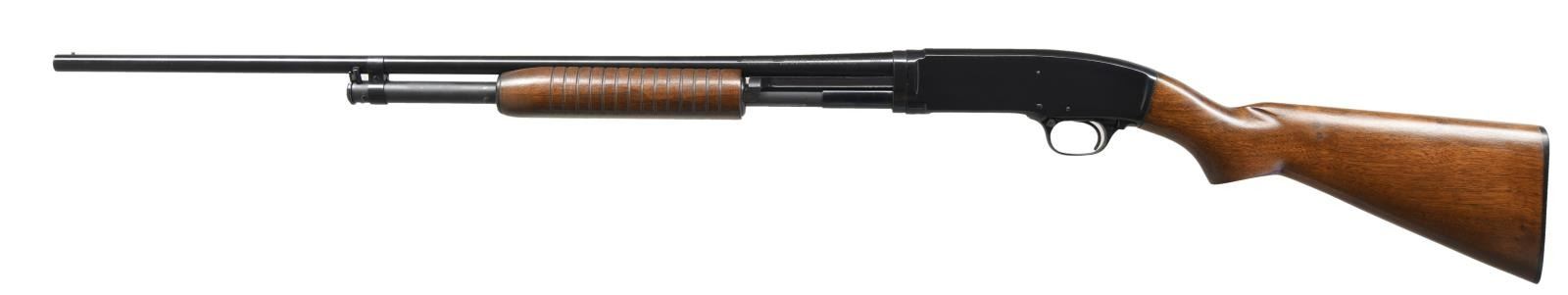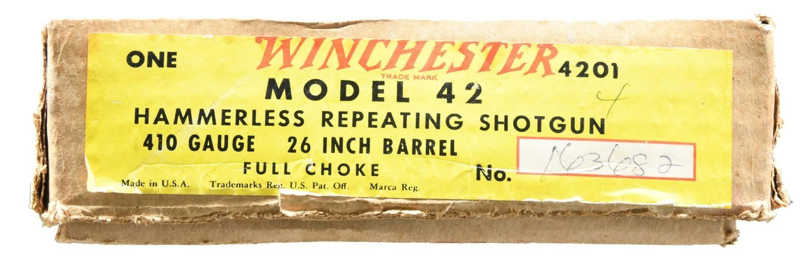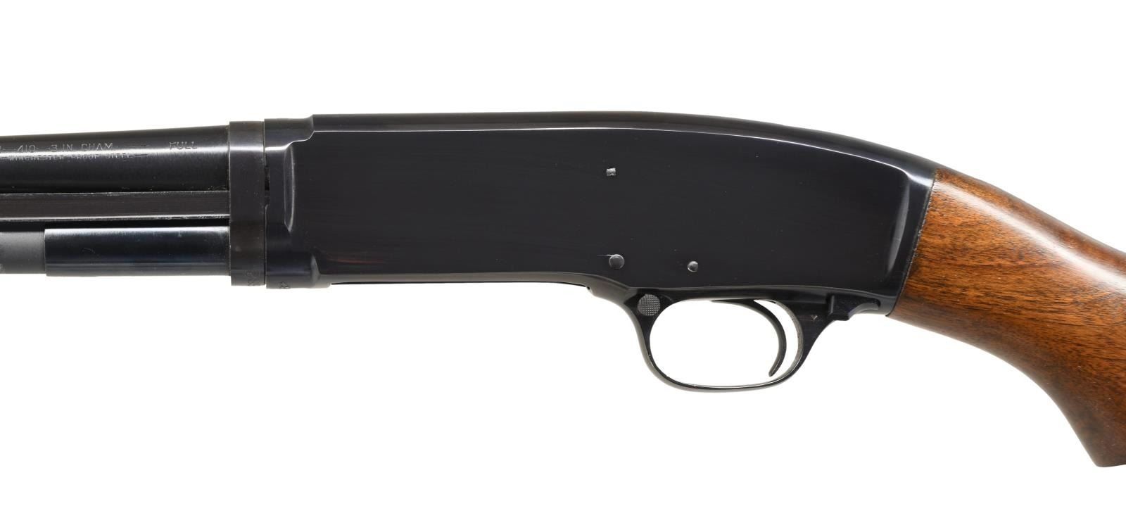 Cal. 410. 3". S# 163682. Bbl. 26" plain. Fixed full choke. Steel bead. Flat bottom grooved forearm & pistol grip stock w/ original buttplate. Mfg. 1963. UNATTACHED ACCESSORIES: original box w/ proper numbered label. Includes instructions & hang tag. CONDITION: near new. Over 97% blue showing slide & mag. tube wear. Very good original wood finish w/ a dent at the front of the forearm. Bright near excellent bore. (23-4893/DS). CURIO. $2500-3500.