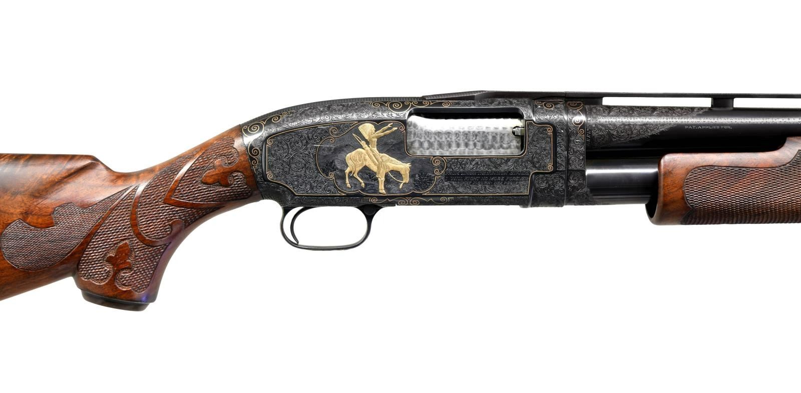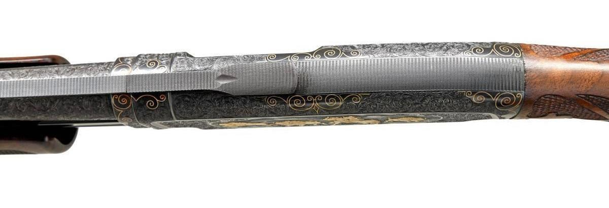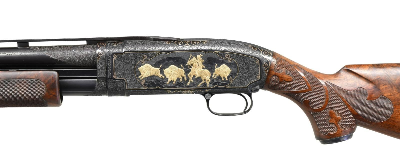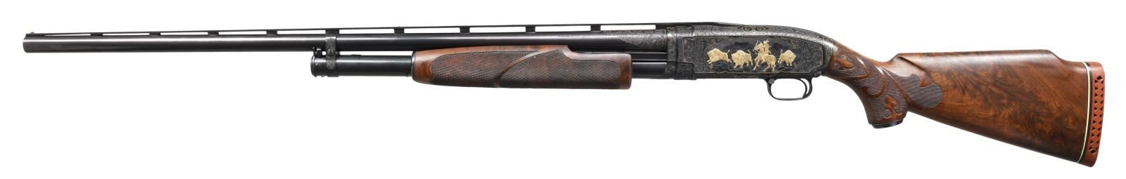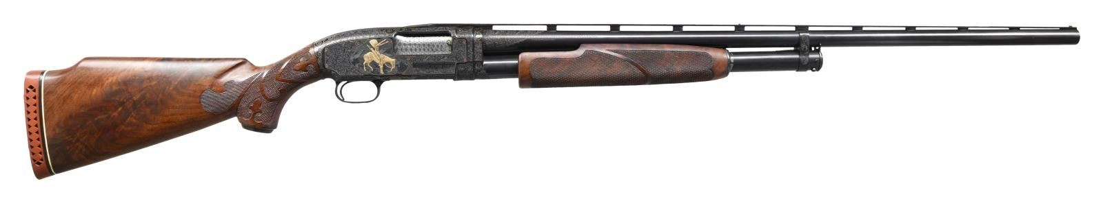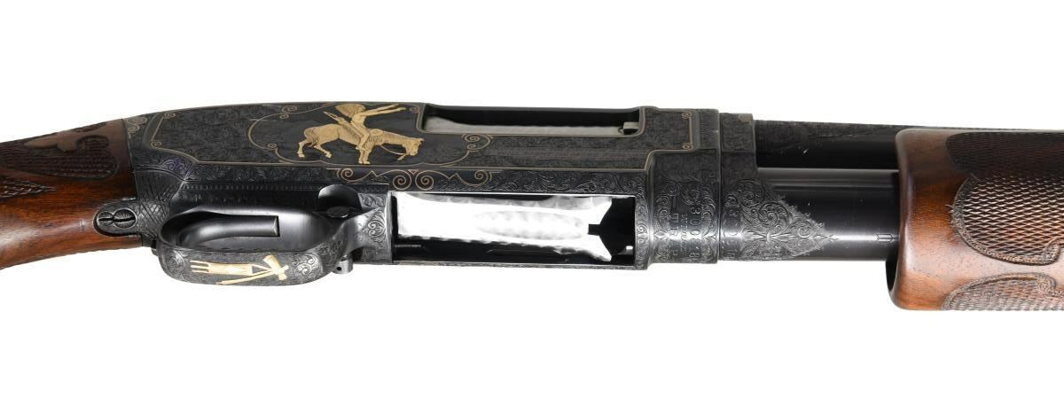 MODEL 12 TRAP PUMP SHOTGUN. Cal. 12 ga. 2 3/4". S# 300818. Spectacular shotgun w/ full coverage American Indian themed engraving w/ gold inlaid figures. Right side of frame has engraved inscription "FROM WHERE THE SUN NOW STANDS / I WILL FIGHT NO MORE FOREVER / CHIEF JOSEPH - NEZ PIERCE". Gold bordered vignette features a gold inlaid horseback mounted Chief Joseph w/ his arms raised to the Sun. Left side scene features a mounted Indian w/ drawn bow & 3 gold inlaid Buffalo. Scenes are surrounded by arabesque scroll w/ punch dot backgrounds & ornate gold borders that extends to upper & lower action areas. Trigger guard bow has gold inlaid tomahawk & sash. Engraving w/ gold highlights extends to the breech end of bbls. & bbl. extension. Bottom of receiver is marked w/ engraver's signature "W. Kolouch" over the word "TRAP". Walter Kolouch, McMinnville, Oregon is widely respected as a master engraver. Bbl. 30" w/ factory milled vent rib & fixed full choke. White front & mid beads. Jeweled bolt & carrier. Trigger guard screw has an added set screw. Beavertail forearm & red "W" capped pistol grip stock of fancy walnut is early 1960s vintage w/ factory "B" carving. LOP: 14 1/4" over red ventilated Winchester pad. Mfg. 1922. CONDITION: over 95% reblued finish showing slide wear. Wood has good satin refinish. Bright bore shows some plastic fouling. Sound action. (23-4878/DS). CURIO. $8000-12000.