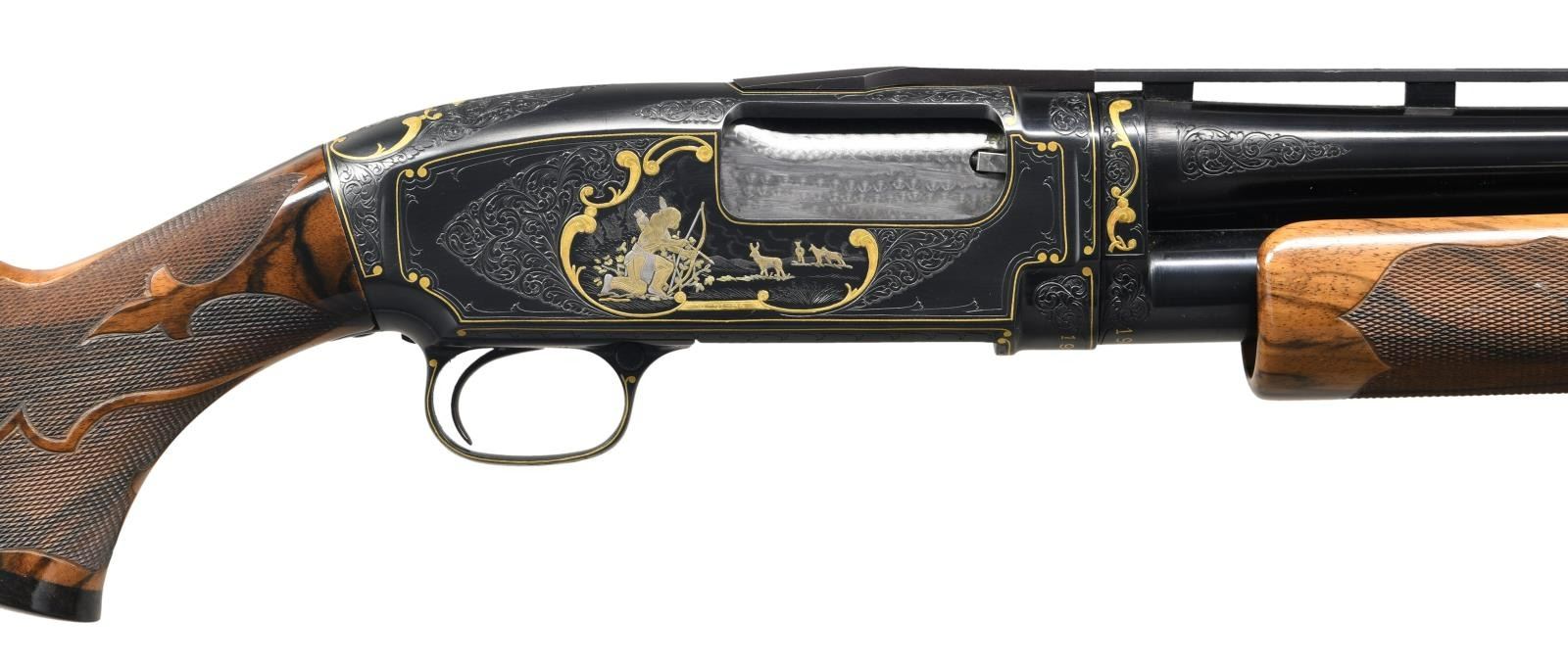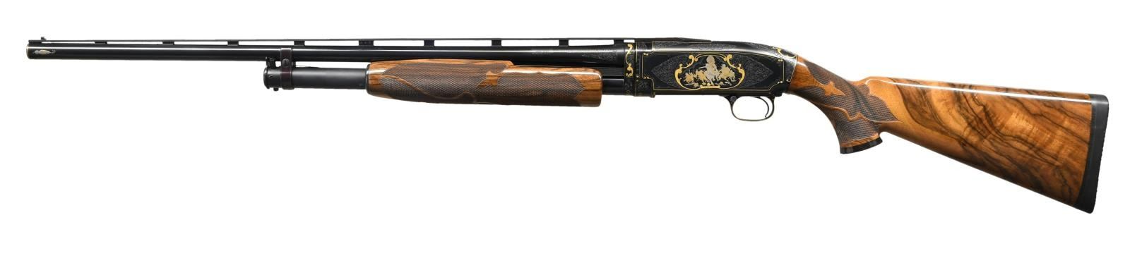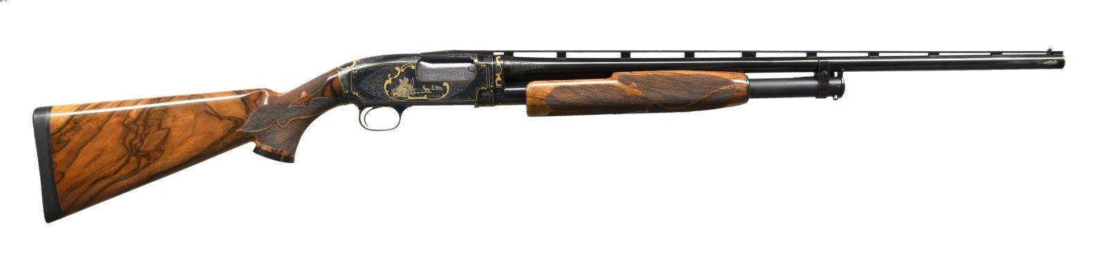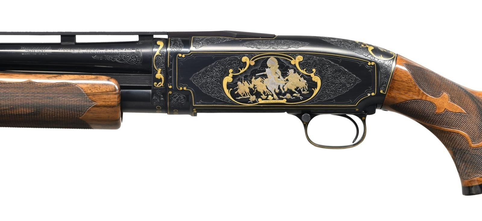 MODEL 12 SKEET PUMP SHOTGUN. Cal. 20ga 2-2/4". S# 1968090. Spectacular hand engraving by Belgium trained master engraver Gino Cargnel. Features include gold and silver inlays of Native Americans. Right side of receiver hunting scene depicts an American Indian drawing his bow on a pronghorn antelope. Left scene depicts an American Indian war party on horseback. Top of receiver has a portrait of a Native American. Scenes bordered by decorative gold highlights w/ straight line borders following the receiver contours. Remaining areas of the receiver have wedges of vine type scroll. The golden highlights & scroll continue to the receiver extension as well as breech & muzzle ends of bbl. Sides of bbl. at muzzle has gold & silver eagle feather highlights. Trigger guard bow has gold & silver spear. S#s are gold inlaid. Engraver's signature "G. CARGNEL" is found in the lower borders of both Indian scenes. Bolt & carrier have custom jeweled finish. Docwiller custom beavertail forearm & pistol grip stock of gloss finished fancy thin shell walnut having vivid marbling w/ dark streaking. Contrasting good grip cap w/ brass diamond inlay. Fancy borderless fleur-de-lis segmented hand checkering. LOP: 14-1/4" over a solid black Pachmayr Presentation pad. 26" bbl. with Winchester new style 3 pin vent rib. Fixed WS-1 choke. White target front sight, mid bead is removed. WEIGHT: 7 lbs, 1.8 oz. S# indicates 1963 mfg. CONDITION: near excellent as refurbished. Metal parts retain over 98% finely polished reblued finish showing slide wear on mag. tube. Jeweled bolt shows some slide wear. High gloss wood finish shows a few small scratches & marks. Very good bright bore. PROVENANCE: From the personal collection of Brad Shepherd. (23-2092/DS) CURIO. $6,000-10,000.