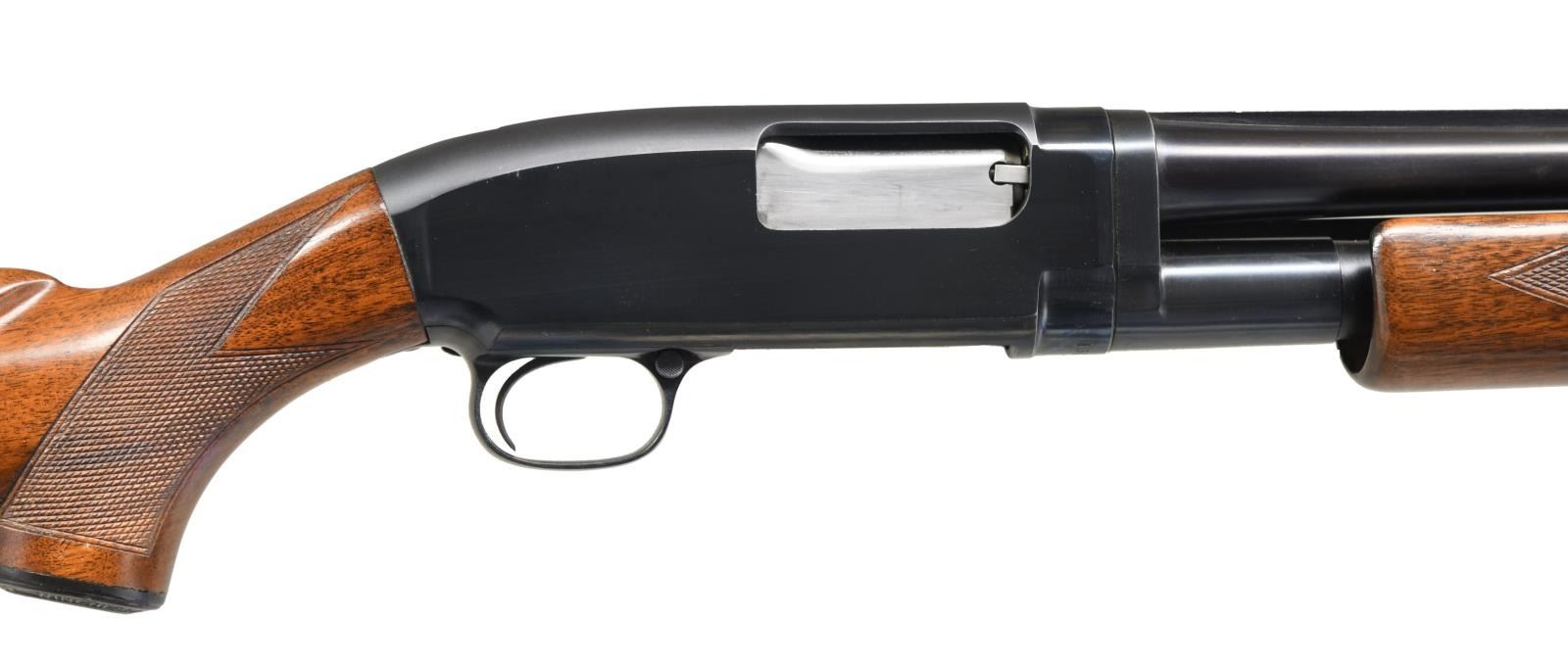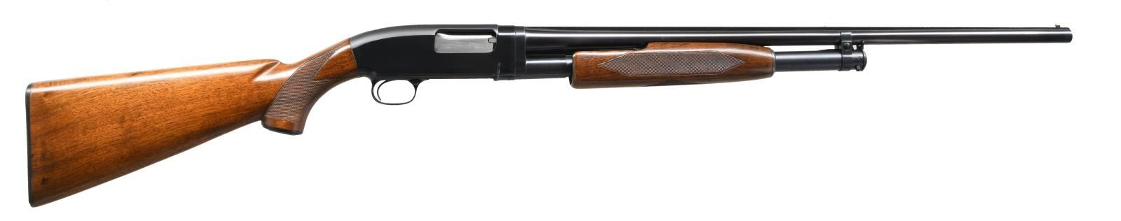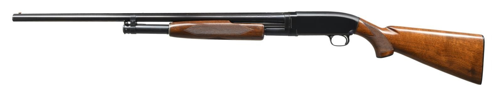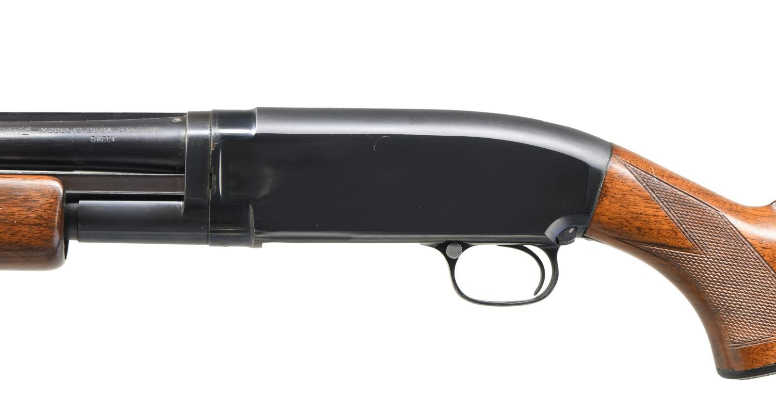 SHOTGUN. Cal. 28 Ga. 2 /8". S# 1375796. Bbl. 26" solid rib. Fixed Skeet choke. Red target front sight w/ steel mid bead. Action has matte-blued receiver top. Correct shotgun w/ proper 28 Ga parts including mag. tube, bolt, carrier & cartridge guide. Beavertail forearm & hard rubber capped pistol grip stock w/ skeet checkering. LOP: 14" over original buttplate. Mfg. 1953. CONDITION: all original retaining 98% blue showing slide wear. Very good original wood finish & checkering. Bright near excellent bore. (23-4869/DS). CURIO. $7000-10000.