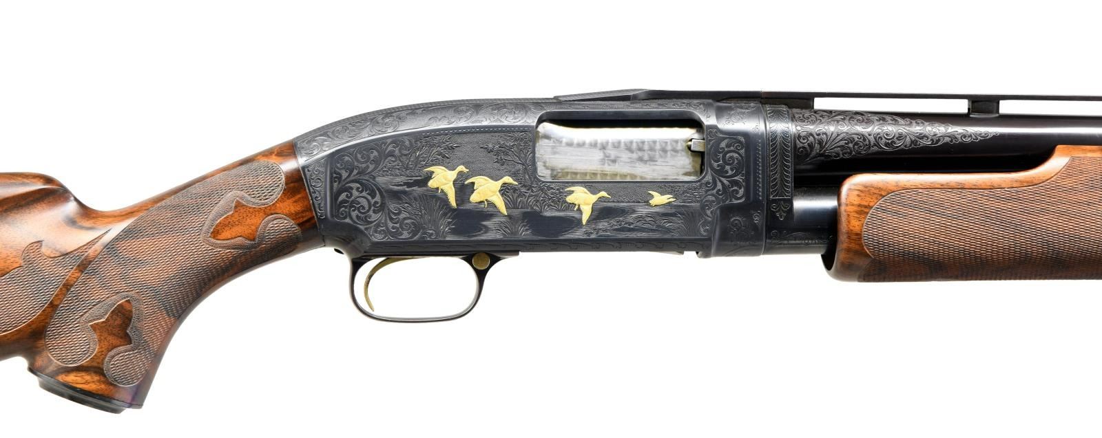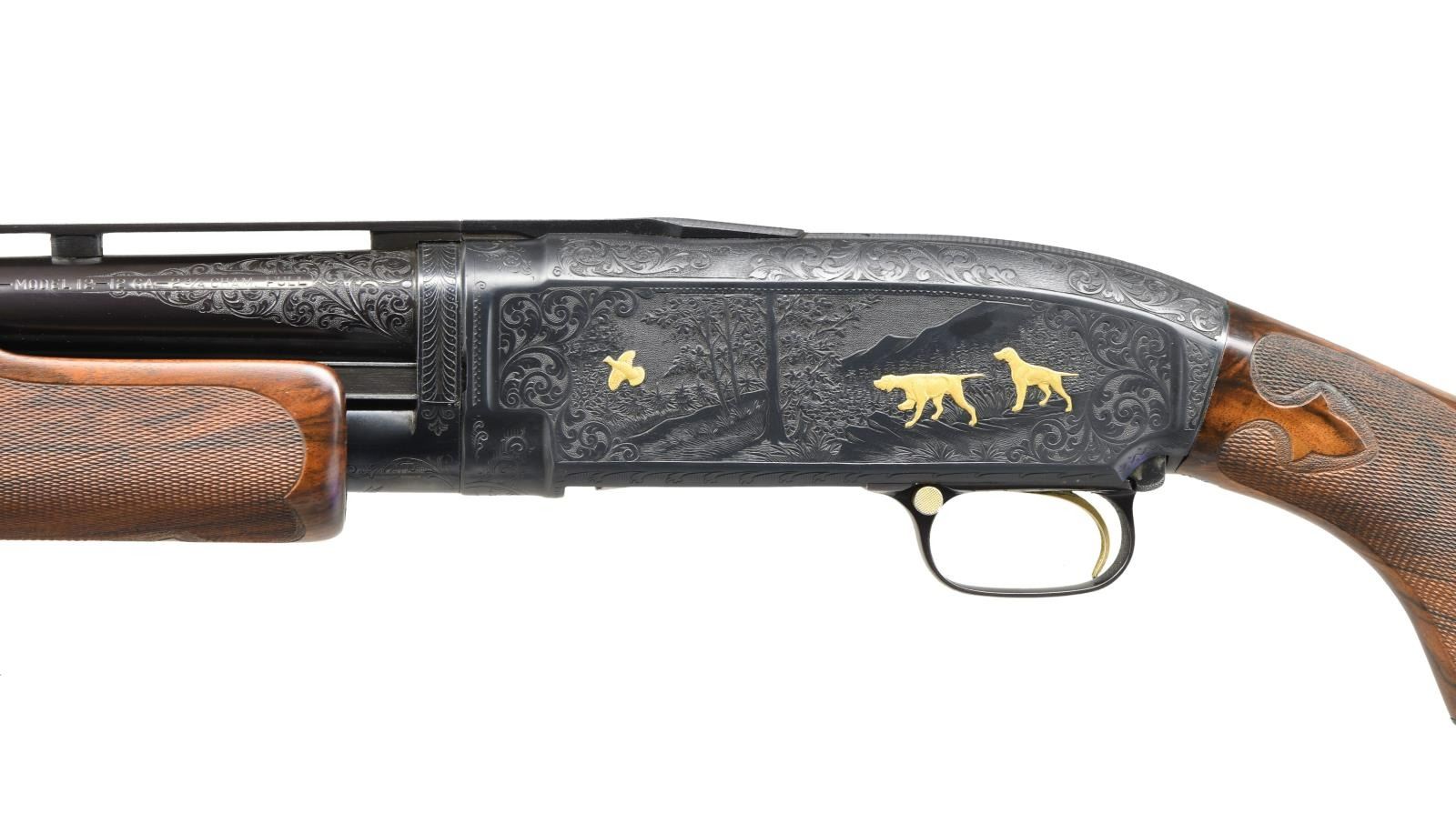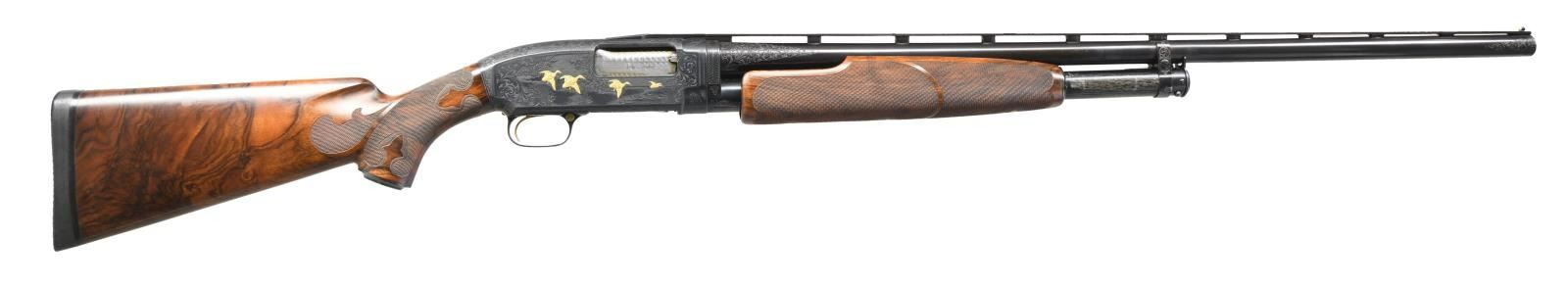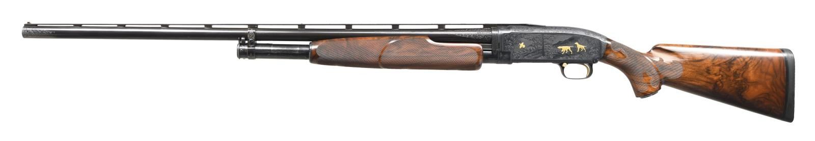 TRAP PUMP SHOTGUN. Cal. 12 ga. 2 3/4". S# 988257. Bbl. 30" w/ milled vent rib. Fixed full choke. White target front sight w/ white mid bead. Spectacular full coverage engraving w/ gold inlaid figures by master engraver Arnold Griebel(1890-1970). Griebel learned engraving at Suhl, Germany & immigrated to the United States in 1928. Right side has a deep relief marsh scene featuring 4 gold inlaid flying mallards. Left side woodland scene features 2 pointers w/ a flushing partridge. Scenes are surrounded by vine type scroll engraving w/ finely stippled backgrounds that extends to upper & lower receiver areas. Receiver extension, mag. band as well as breech & muzzle ends of bbl. have complimentary engraving. Receiver's extension is not S# stamped & has an added pigeon. Hand checkered gold plated trigger & gold plated safety button. Jeweled bolt & carrier. Custom beavertail forearm & straight comb pistol grip trap stock of exhibition quality thin shell walnut. Features include Fleur-de-lis segmented borderless hand checkering & engraved steel grip cap. LOP: 14 3/8" over a solid black Pachmayr presentation pad. Mfg. 1942. UNATTACHED ACCESSORIES: reprint of an article about Arnold Griebel by John T. Amber along w/ printed pages of his engraving patterns. CONDITION: near excellent retaining 97% fine custom reblued metal finish showing slide wear. Wood has very good custom finish showing small marks & wear spots. Very good bright bore w/ some plastic fouling near muzzle. (23-4877/DS). CURIO. $5000-8000.