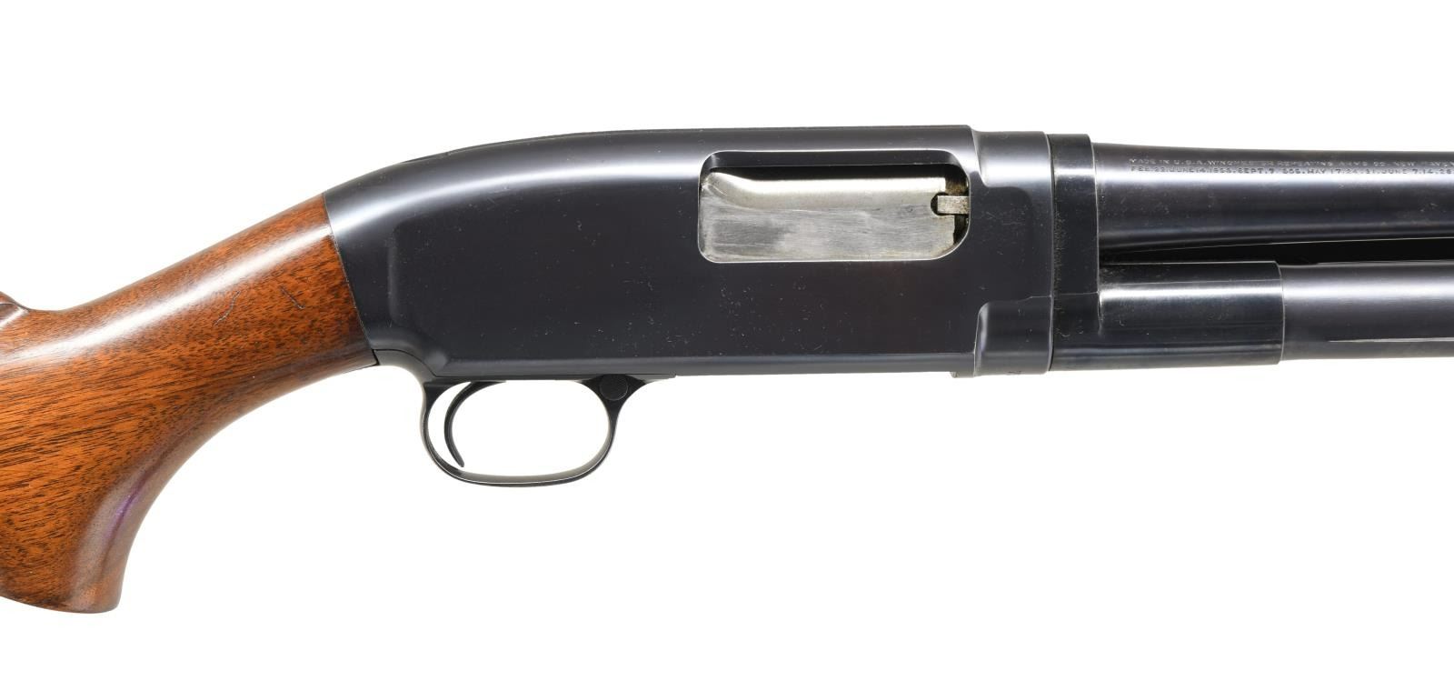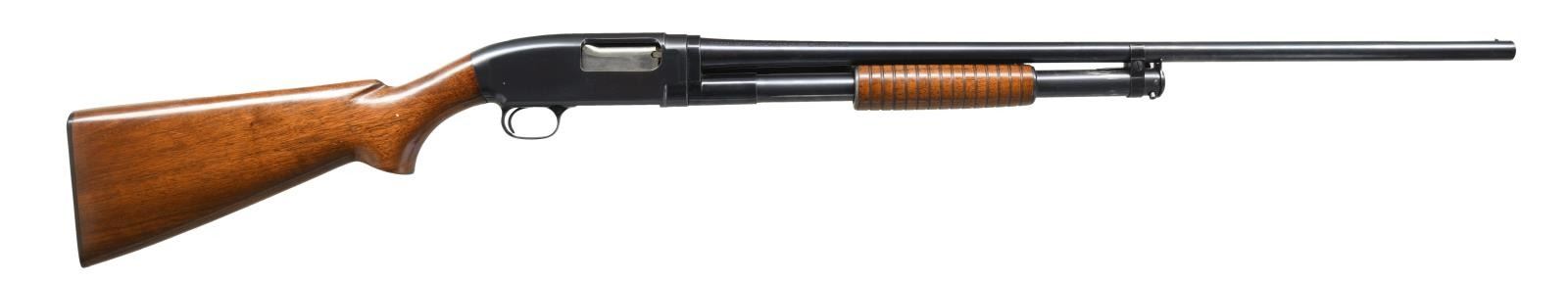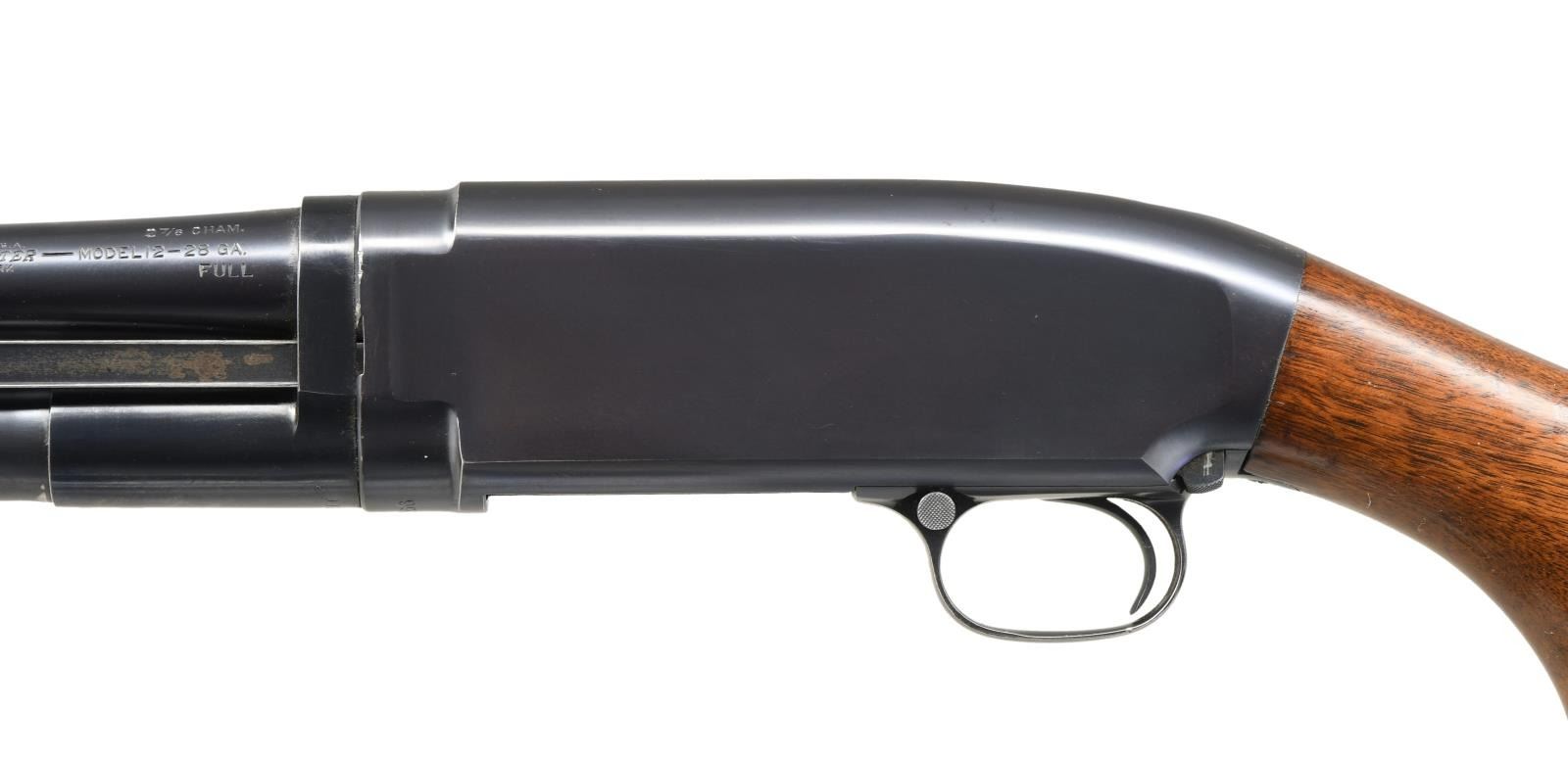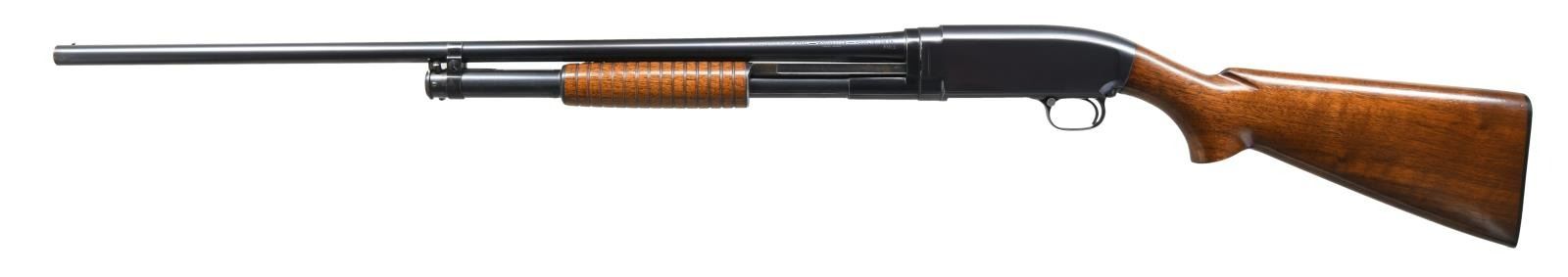 SHOTGUN. Cal. 28 Ga. 2 7/8". S# 750866. Bbl. 28" plain w/ fixed full choke & steel bead. Correct gun w/ proper 28 Ga parts including mag. tube, breech bolt, lifter & shell stop. Small round grooved forearm & pistol grip walnut stock. LOP: 13 7/8" over original buttplate. Mfg. 1937. CONDITION: all original gun retaining over 95% original blue showing slide wear w/ takedown mark on left side of action. Wood has good original finish showing a few small marks. Very good bright bore. (23-4868/DS). CURIO. $5000-8000.