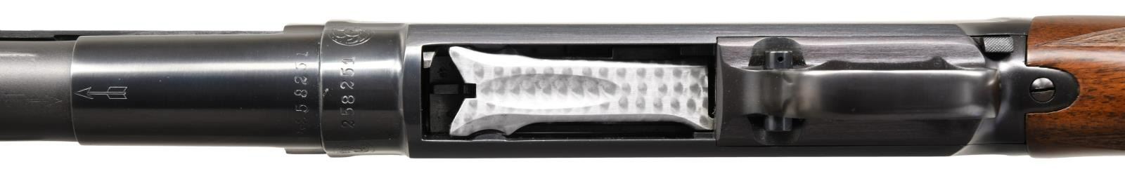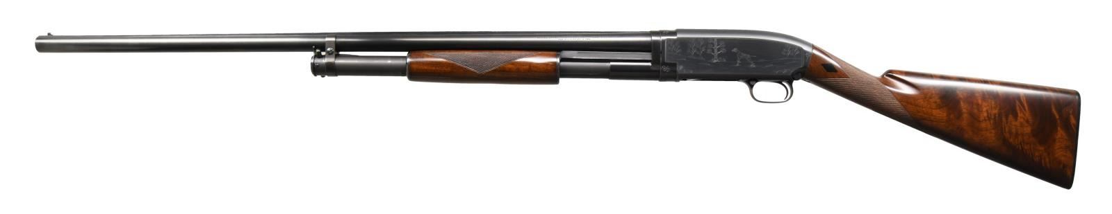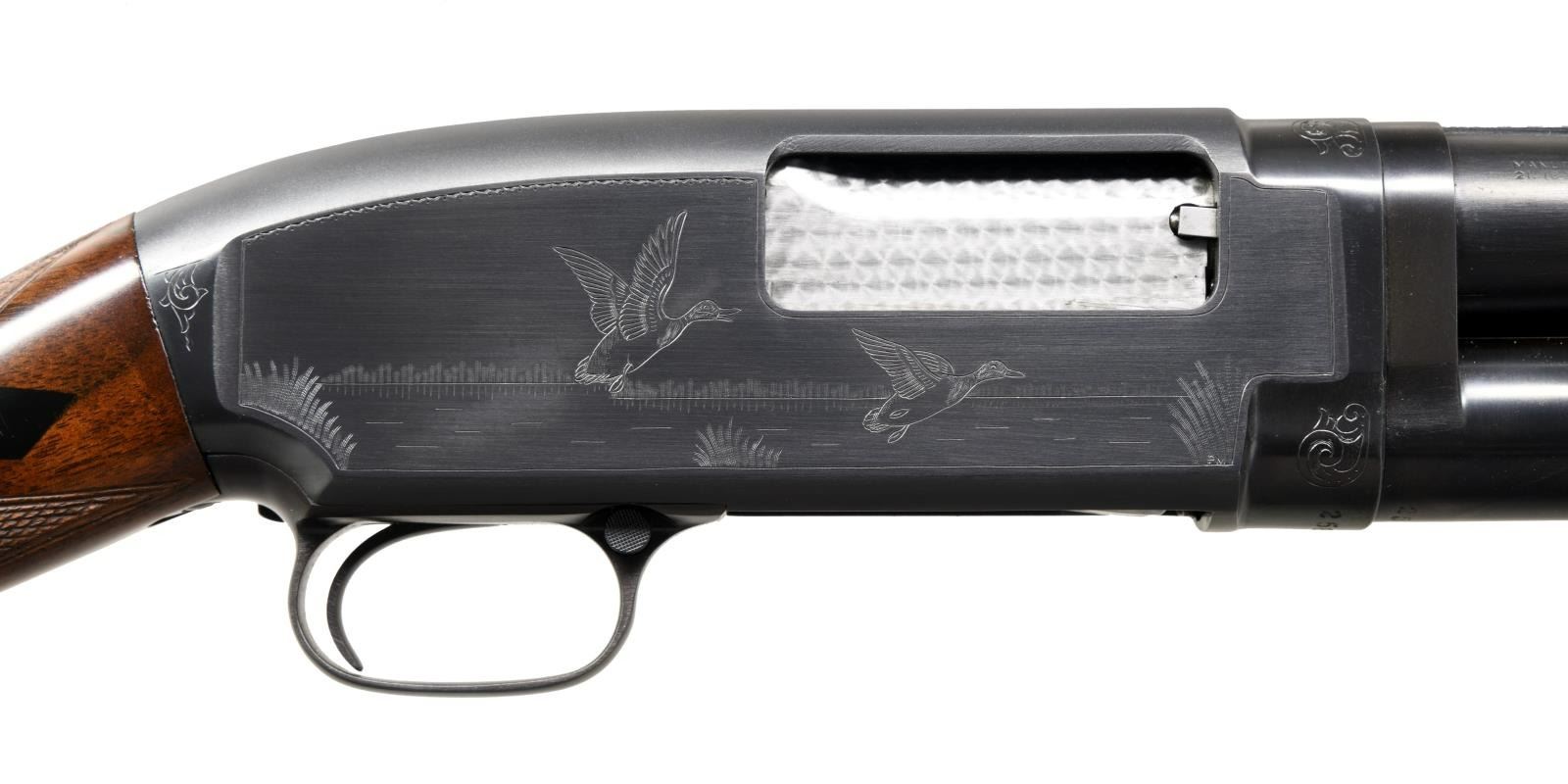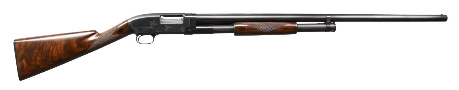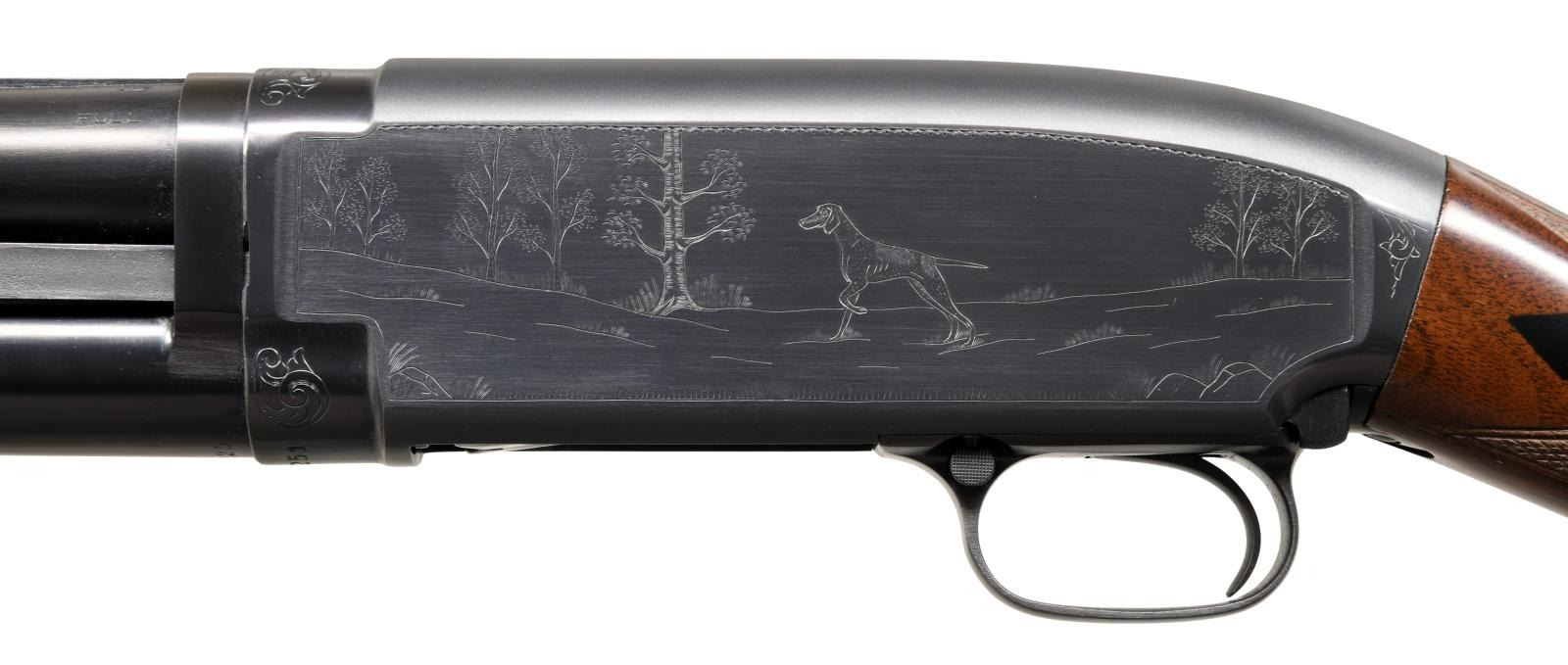 ENGRAVED PUMP SHOTGUN. Cal. 12 ga. S# 258251. Bbl. 30" of nickel steel w/ solid rib & White Bradley style front sight. Choke is open to .007, original choke marking is Full. Tournament grade gun w/ unsigned custom engraving in the factory 12-2 style. Right side features a marsh scene w/ 2 flying mallards. Left side features a woodland scene w/ a pointer. Scenes are surrounded by borders w/ scroll highlights at upper & lower action areas. Hand jeweled bolt & carrier. Small round forearm & straight grip stock of fancy walnut w/ tournament grade checkering having black diamonds at wrist. LOP: 14 1/4" over original buttplate. Mfg. 1921. CONDITION: over 98% of a professional reblued finish. Wood has very good refinish w/ freshened checkering. Action is sound. Bore has an area of pitting near muzzle. PROVENANCE: From the personal collection of Brad Shepherd. (23-2095/DS). CURIO. $2000-3000.