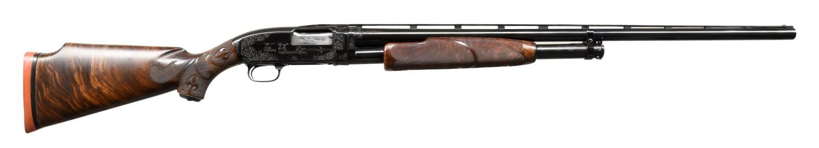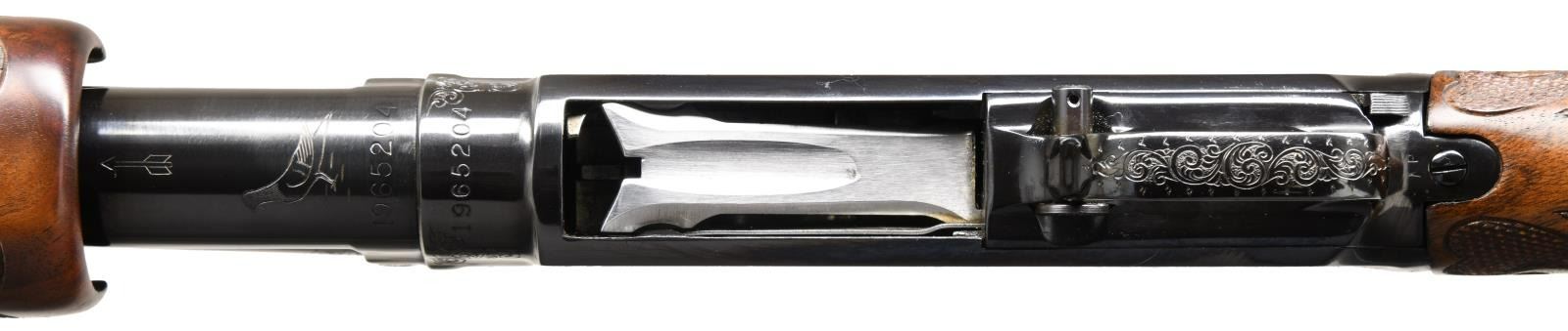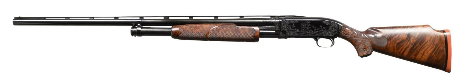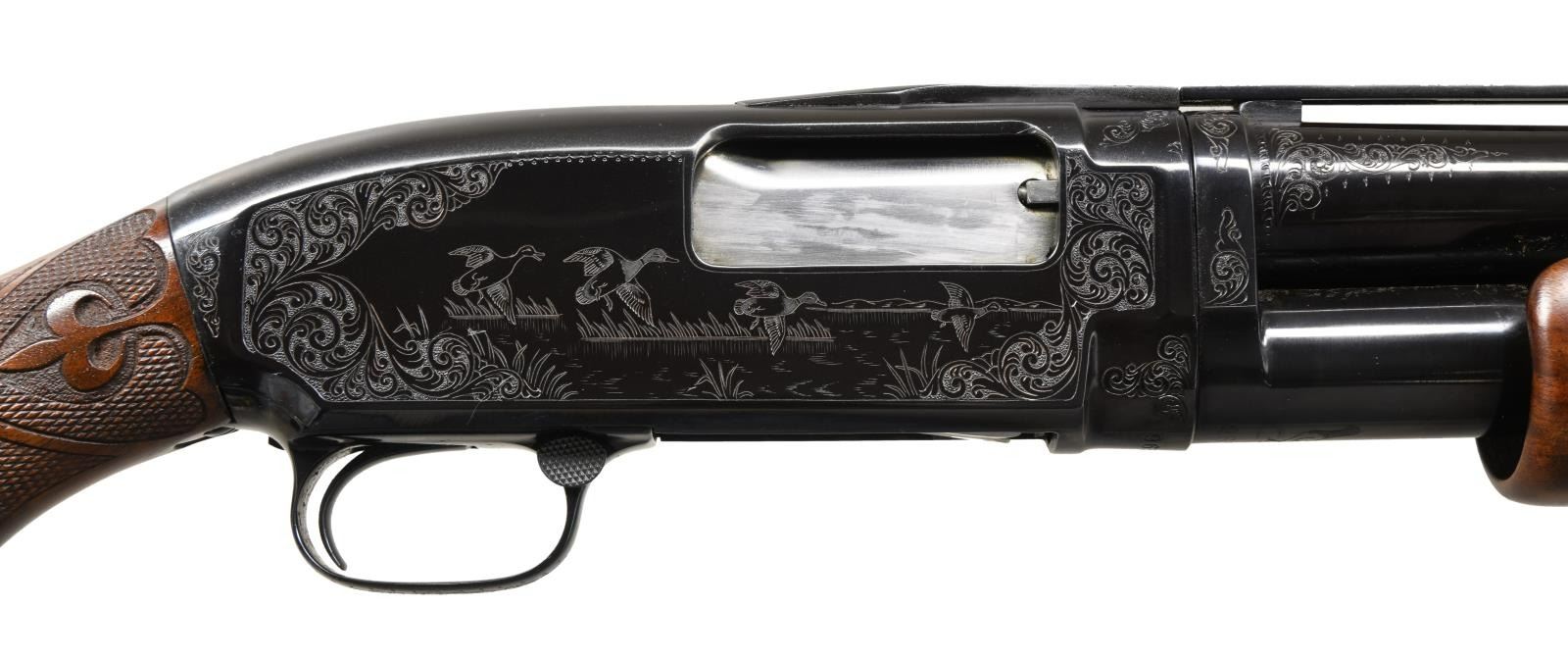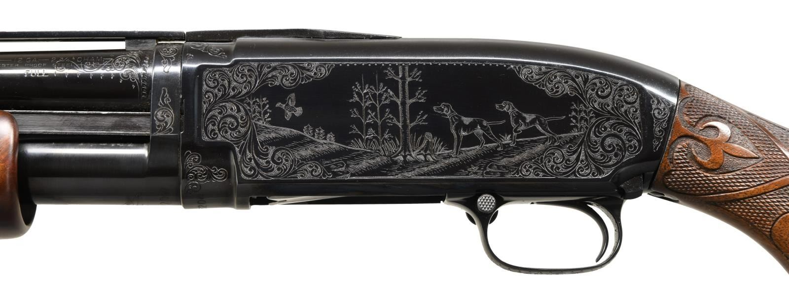 Cal. 12 Ga., 2 3/4". S# 1965204. Bbl. 30" with New Style 3 pin vent rib. Fixed Full choke. Action has custom after market Style 12-5 hand engraving. Right side marsh scene features 4 flying mallards. Left side upland scene shows 2 pointers and a flushing ruffed grouse. The scenes are surrounded by scroll engraving with punch dot backgrounds that extend to the trigger guard and breech end of the bbl. Receiver extension has a added pigeon. After market Big Head safety. Beavertail forend and steel capped pistol grip Monte Carlo stock of fancy black walnut has Style B hand carving. LOP: 14 1/4" over a reproduction solid red Winchester pad. 1963 Mfg. CONDITION: over 98% brightly polished custom reblue. Wood has a very good satin refinish showing a few marks. Bright near excellent bore. (23-4685/DS). CURIO. $2,000-3,000.