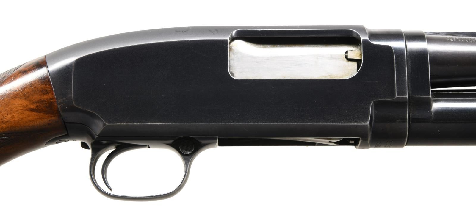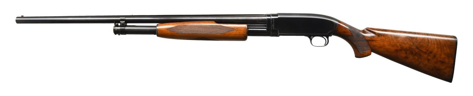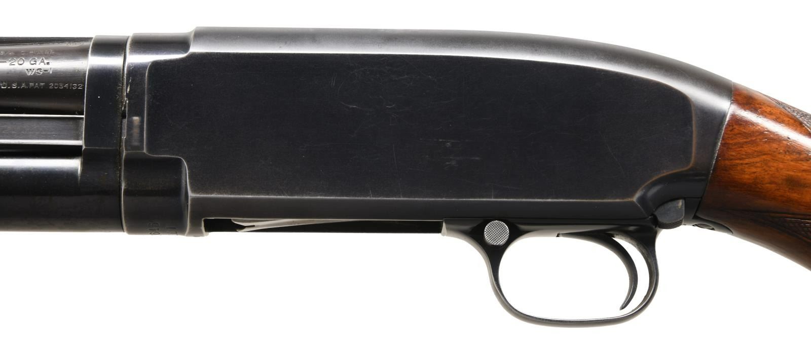 Cal. 20 ga. 2 3/4". S#. 826646. Bbl. 26" solid rib with fixed WS-1 choke. Red target front sight with steel mid bead. Action is marked "SKEET" below S#. Beavertail forend & hard rubber capped pistol grip fancy walnut stock have factory checkering. LOP. 14" over original buttplate. MFG. 1940. CONDITON: over 80% lightly faded blue showing slide & carry wear. Refinished wood shows light marks. Very good bore. (23-4884/DS). CURIO. $1500-2250.