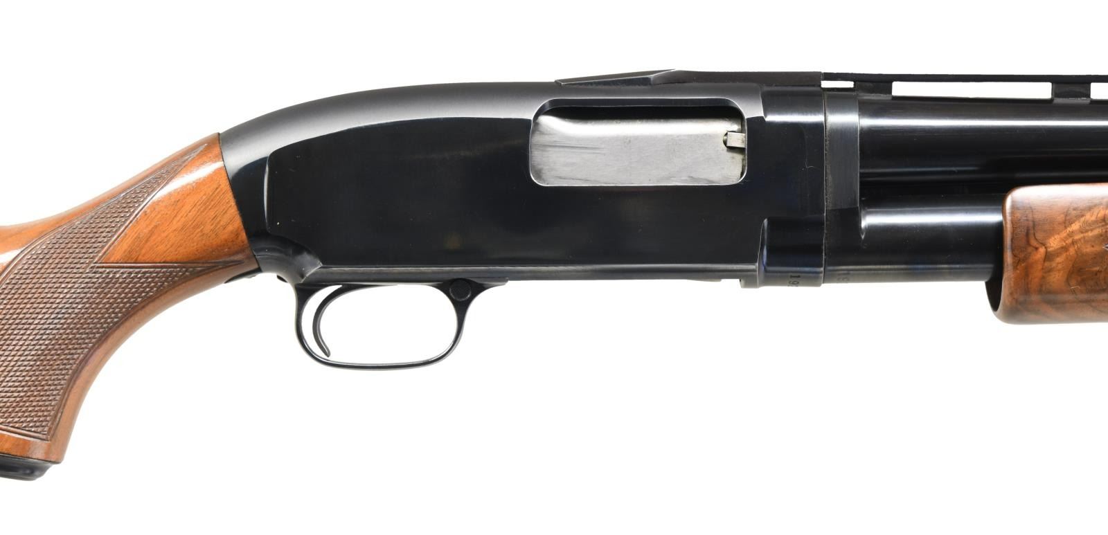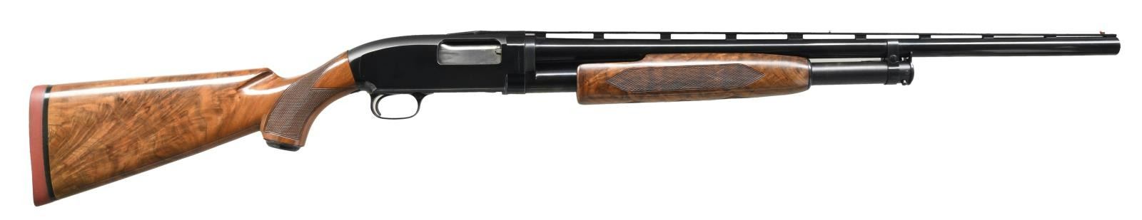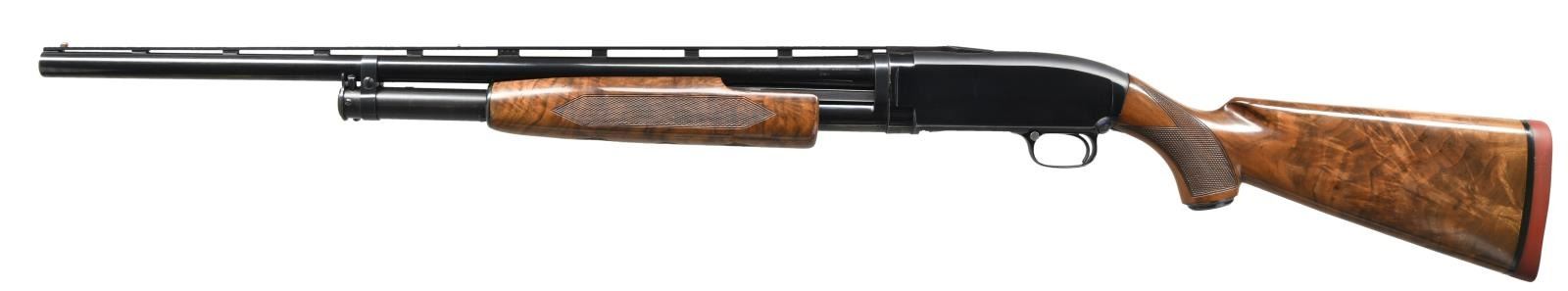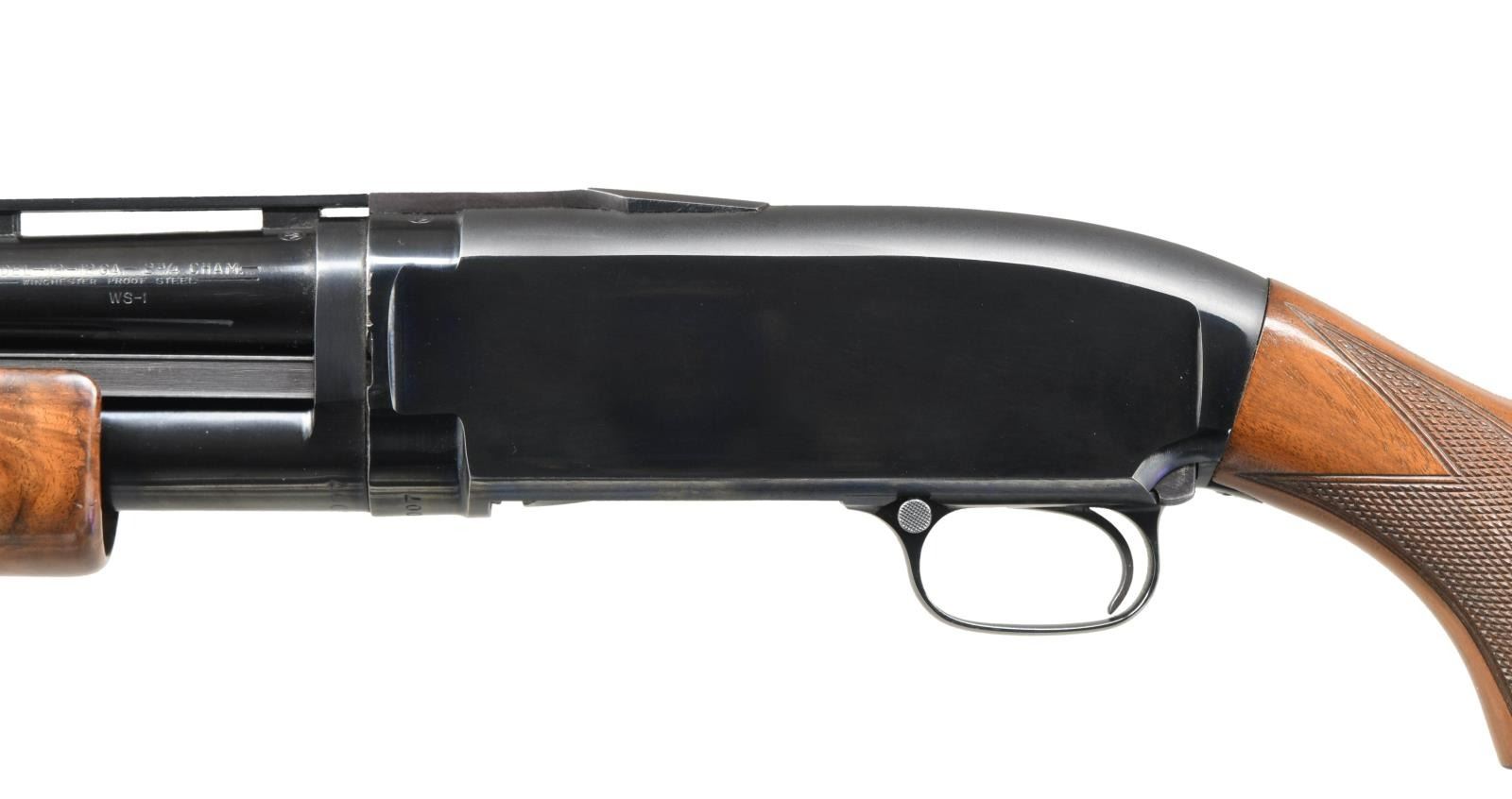 Cal. 12 ga. 2 3/4". S# 1928007. Bbl. 26" w/ new style 3 pin vent rib. Fixed WS-1 choke. Red target front sight w/ steel mid bead. Replacement Y series beavertail forearm & steel capped pistol grip stock of fancy walnut. LOP: 14 3/8" over an added solid red Winchester pad. Mfg. 1961. CONDITION: 97% blue showing slide wear w/ takedown mark on left side of action. Wood has good finish showing scattered marks. Very good bright bore. (23-4883/DS). CURIO. $1000-1500.