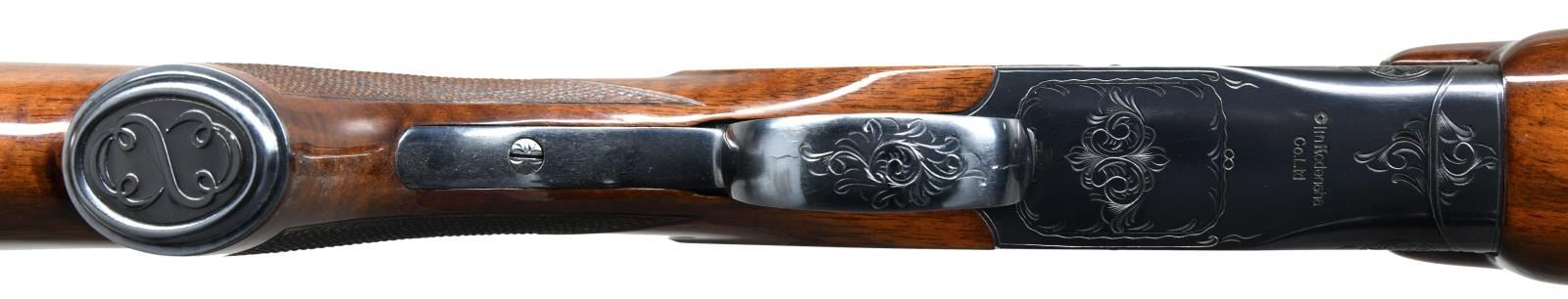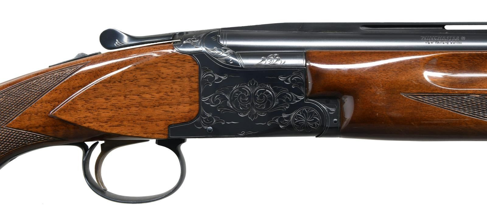 Cal: 20 ga. 2 3/4" & 3". S#: K223737. BBLS:28" vent rib with brass bead. Fixed Mod & Full chokes. Blued action has scroll ornamentation. Selective ejectors & SST. Forend & gloss finished steel capped pistol grip stock of nicely grained walnut have cut checkering. Weight; 6 lbs., 12 ozs. UNATTACHED ACCESSORIES: Winchester black leather case w/ key. Case shows scuff marks. CONDTION: over 98% original blue. Original wood finish shows scattered small scratches & marks. Tight action. Bright near excellent bores. (23-1295/DS). MODERN. $1000-1500.