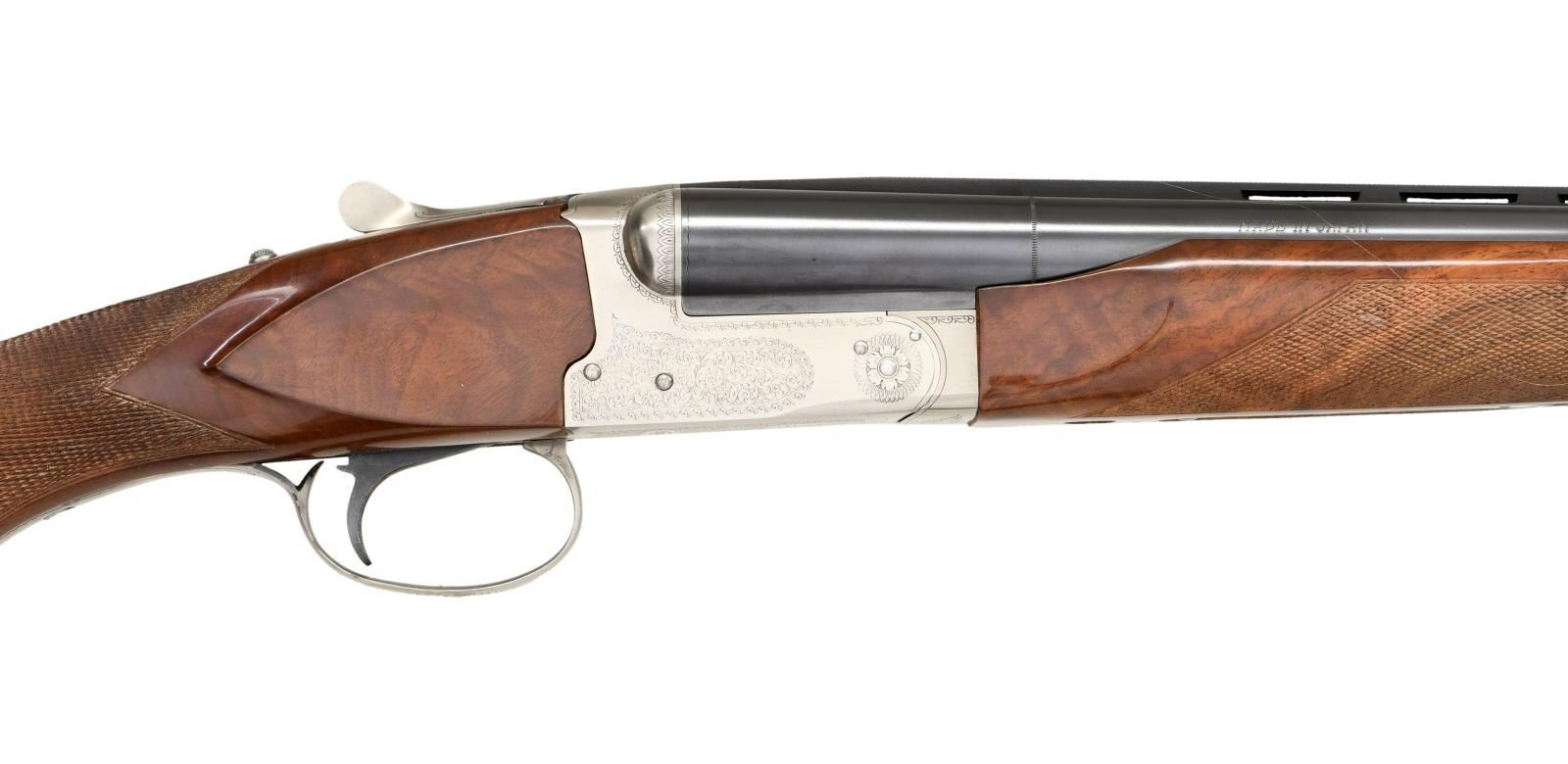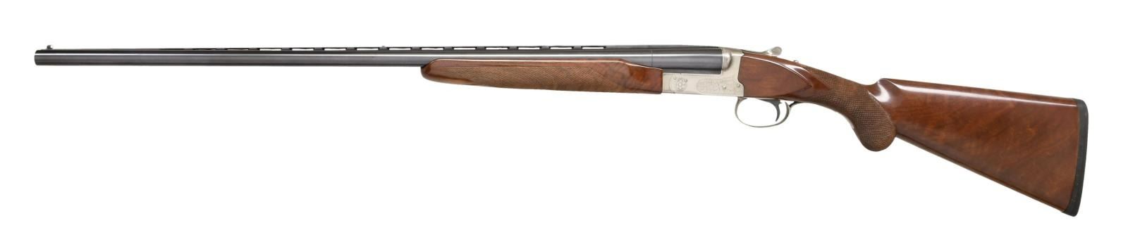 Cal. 20 ga. 3". S#: PWK201849. BBLS: 28" vent rib with white target front sight & white mid bead, Fixed Mod & Full chokes. Coin finished boxlock action has scroll ornamentation with pigeon on floorplate. Selective ejectors & SST. Beavertail forend and round knob stock of satin finished fancy walnut have cut checkering. LOP: 14" over original thin black pad. Weight 7lbs., 3.2 ozs. CONDITION: Over 98% metal finish. Wood shows scuffs & small marks. The wood is proud with worn finish right of the top tang and can cause the top lever to stick. Bright near excellent bores. (23-1298/DS). MODERN. $1500-2250.