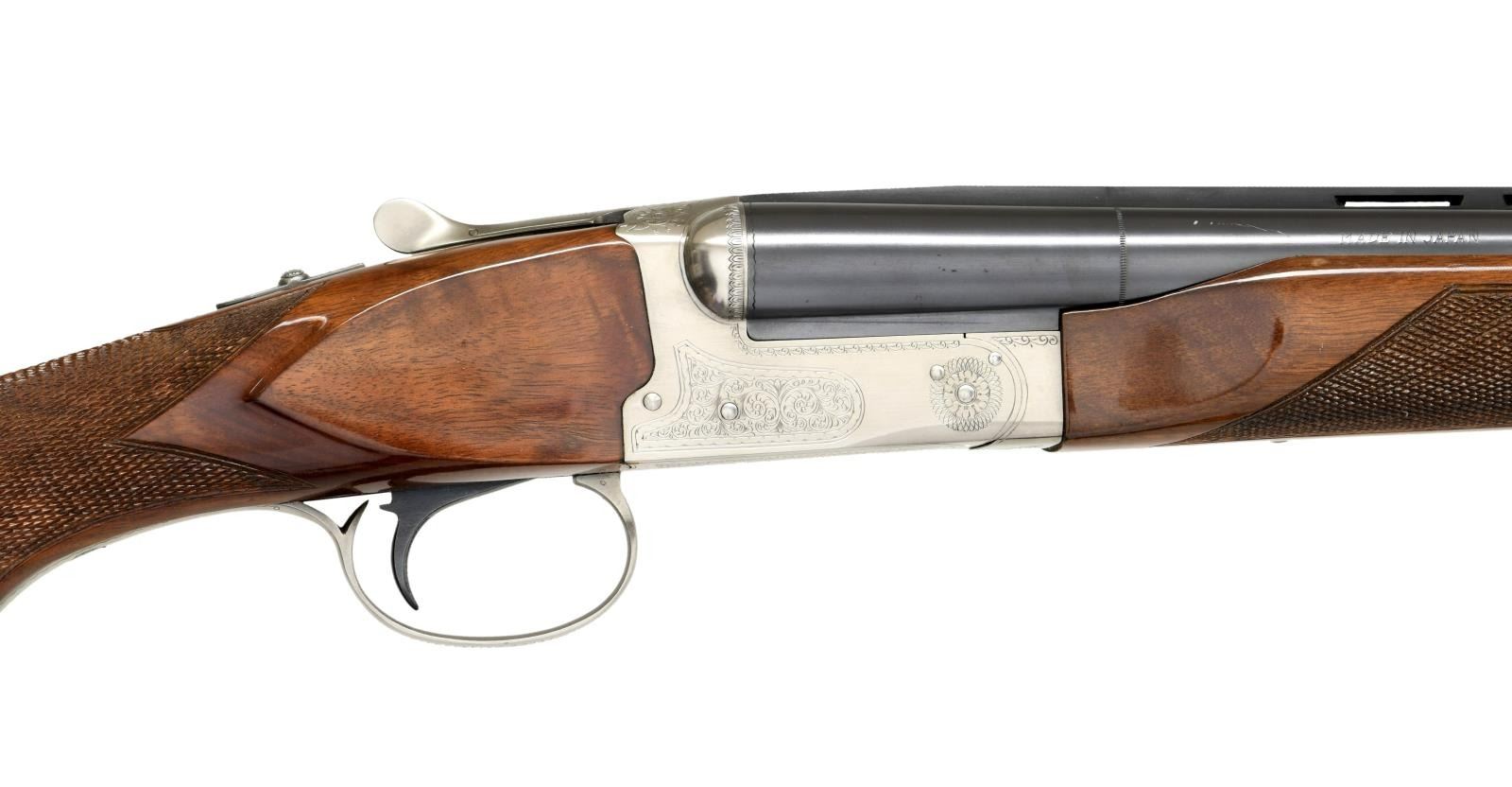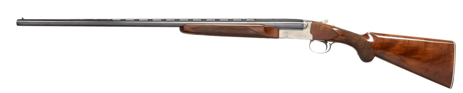 Cal. 20 ga.3". S#. PWK201538. Bbls: 28" vent rib. White target front sight with white mid bead. Fixed Mod & Full chokes. Coin finished action has scroll ornamentation with pigeon on the floor plate. Selective ejectors & SST. Beavertail forend and round knob stock of gloss finished fancy walnut with cut checkering. LOP: 14 1/8: over original buttplate. Weight: 7lbs., 2 ozs. CONDITION: over 98% metal finish. Stocks shows light scratches & small marks. Tight action. Bright near excellent bores. (23-1290/DS). MODERN. $1500-2250