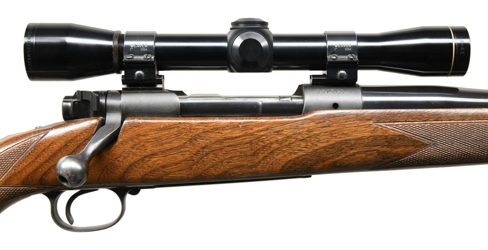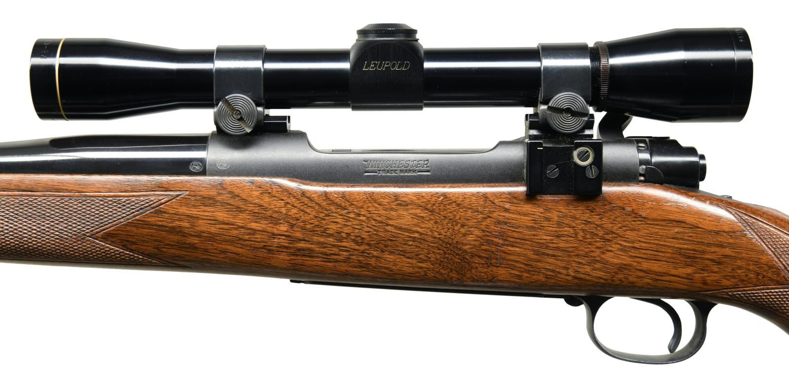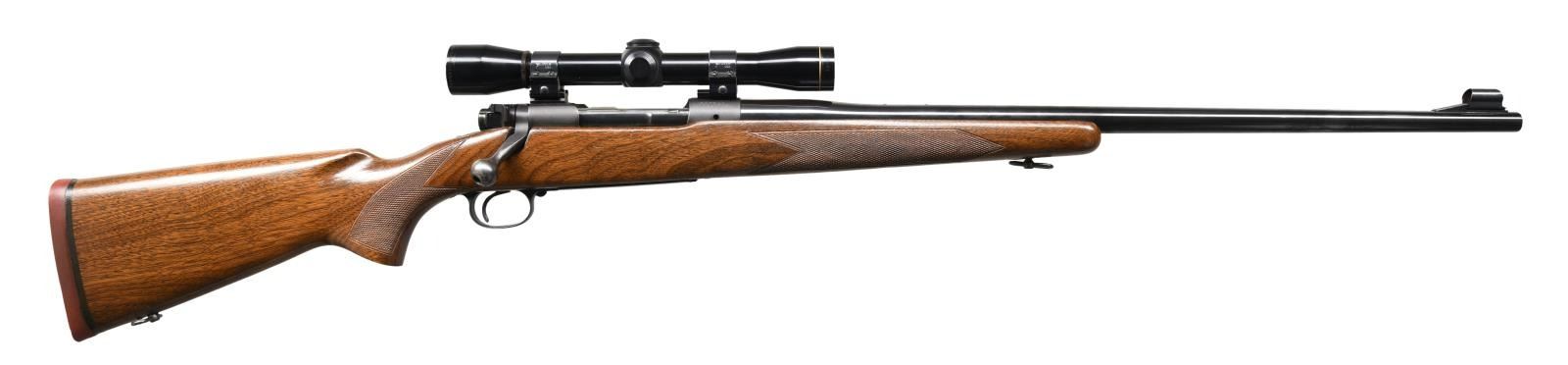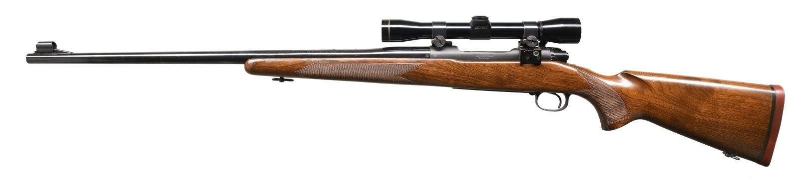 BOLT ACTION RIFLE. Cal. 375 H&H Magnum. S# 337963. Bbl 25". Model 70 bolt action rifle manufactured by Winchester in 1955. Left side of receiver bears standard stampings stipulating the model and caliber designation. Left side of receiver exhibits the Winchester trademark logo, with the serial number on the right. Receiver exhibits a matte blue finish, with remaining metal components exhibiting a lustrous blue finish. Furniture consists of a 1 piece checkered wood buttstock fitted with Winchester red rubber recoil pad. Receiver is mounted with a Leupold M8-4X scope, as well as with a sight block for an adjustable aperture rear sight on the left side. Peep sight is not present. CONDITION: very good, with metal components retaining the vast majority of their original factory blue finish, exhibiting some mild wear, thinning, and light pitting on the top of the bolt head, with some superficial marks from handling and storage present on the floorplate. Brilliant mirror bore, exhibiting what appears to be old grease within the grooves, and retaining well defined rifling throughout. Stock exhibits some scattered marks and a couple small impressions from handling and storage, but is otherwise very good overall. Scope retains a sharp and clear image. (23-2165/MLW). CURIO. $1,500-2,500.