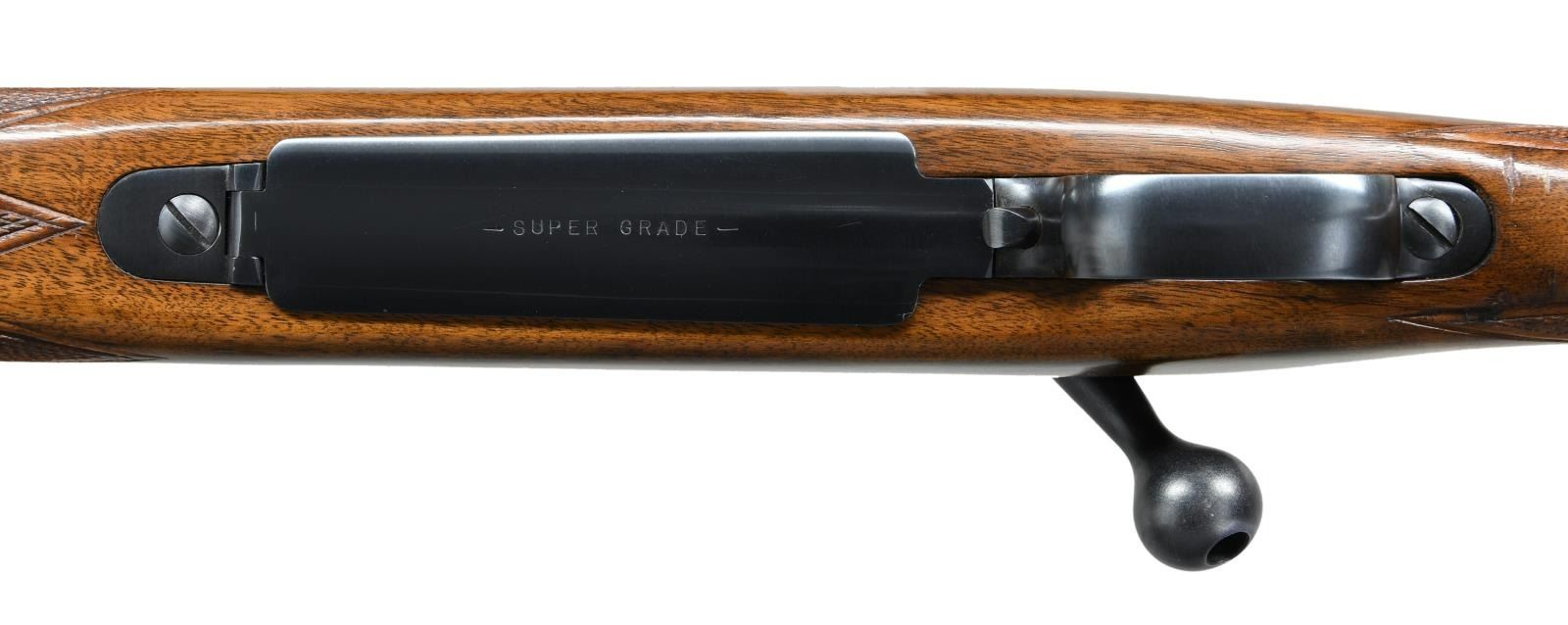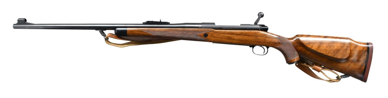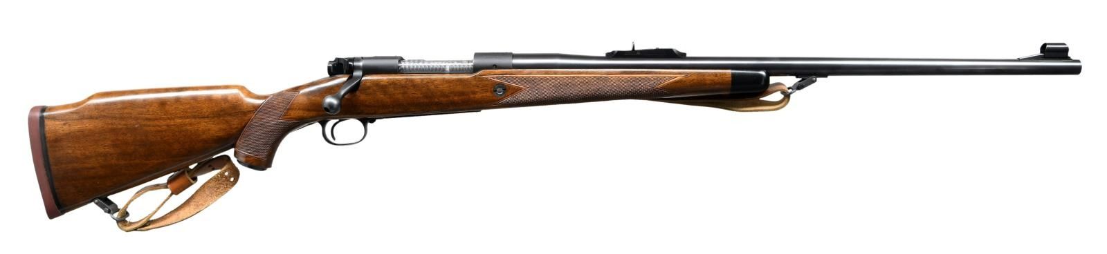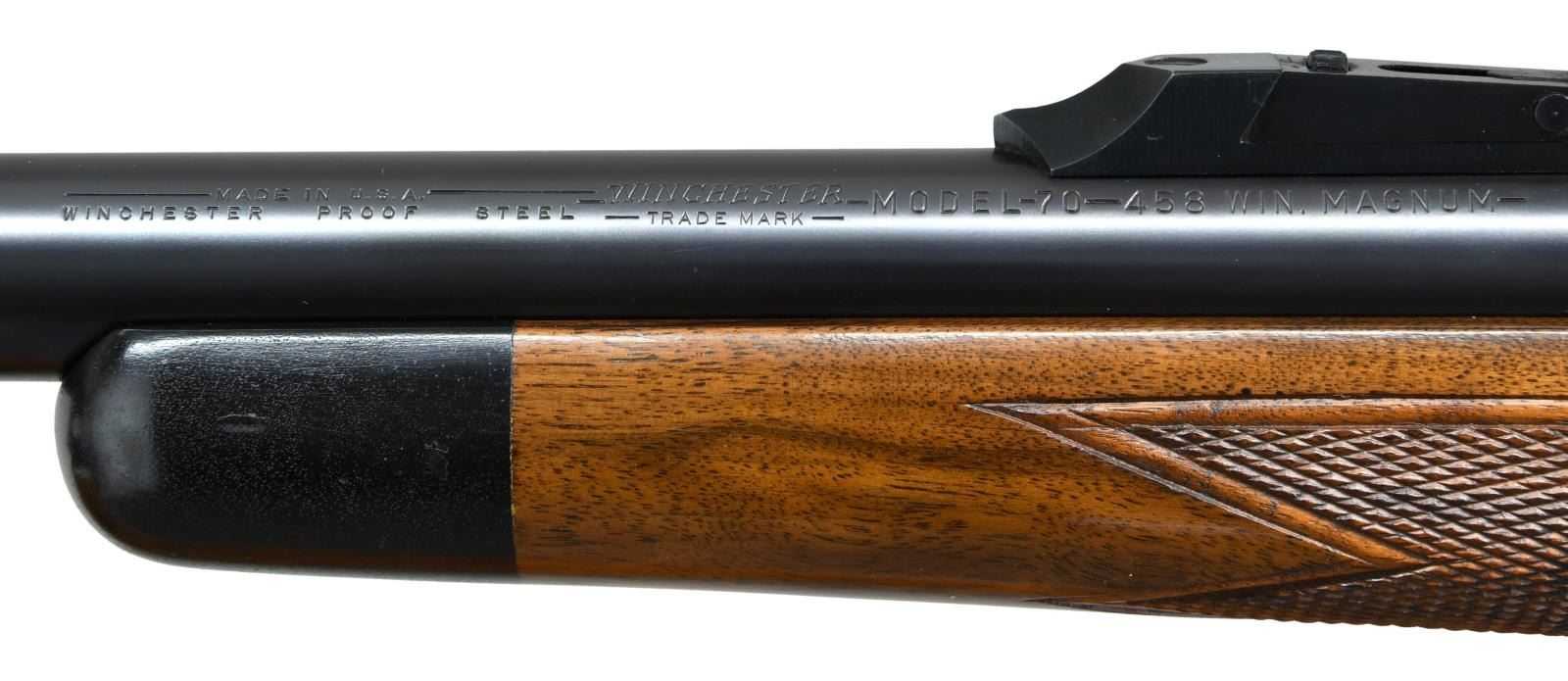 ACTION RIFLE. Cal. 458 Win Mag. S#. 365667. Bbl. 25". First type African rear sight and hooded ramp front with proper Lyman 37FA having a silver bead. Jeweled bolt, extractor, extractor ring & follower. Bolt is numbered to the rifle. Super Grade marked floorplate. High comb Monte Carlo cheekpiece stock of semi fancy walnut has Super grade wrap around checkering. Features include black forend tip, solid red pad, steel grip cap, single large stock cross bolt and Winchester marked sling on Super Grade swivels. S# indicates 1956 mfg. CONDITION: Near excellent retaining over 98% original metal finish. Original stock finish shows only a few small marks. Bright near excellent bore. PROVENANCE: From the Estate of Jon Thomas. (23-1642/DS). CURIO. $7,000-10,000.