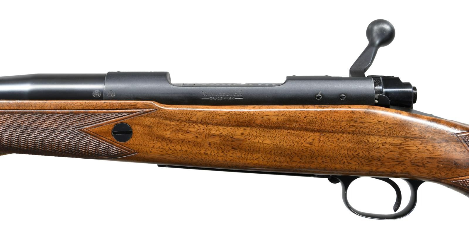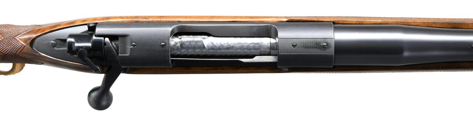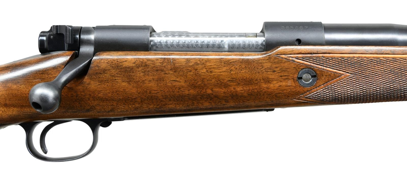 ACTION RIFLE. Cal. 458 Win Mag. S#. 365667. Bbl. 25". First type African rear sight and hooded ramp front with proper Lyman 37FA having a silver bead. Jeweled bolt, extractor, extractor ring & follower. Bolt is numbered to the rifle. Super Grade marked floorplate. High comb Monte Carlo cheekpiece stock of semi fancy walnut has Super grade wrap around checkering. Features include black forend tip, solid red pad, steel grip cap, single large stock cross bolt and Winchester marked sling on Super Grade swivels. S# indicates 1956 mfg. CONDITION: Near excellent retaining over 98% original metal finish. Original stock finish shows only a few small marks. Bright near excellent bore. PROVENANCE: From the Estate of Jon Thomas. (23-1642/DS). CURIO. $7,000-10,000.