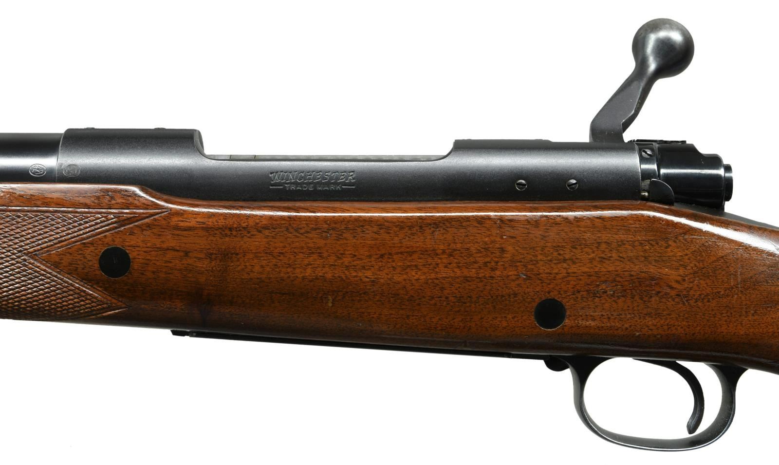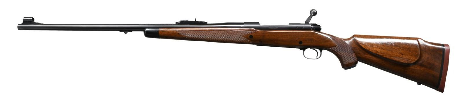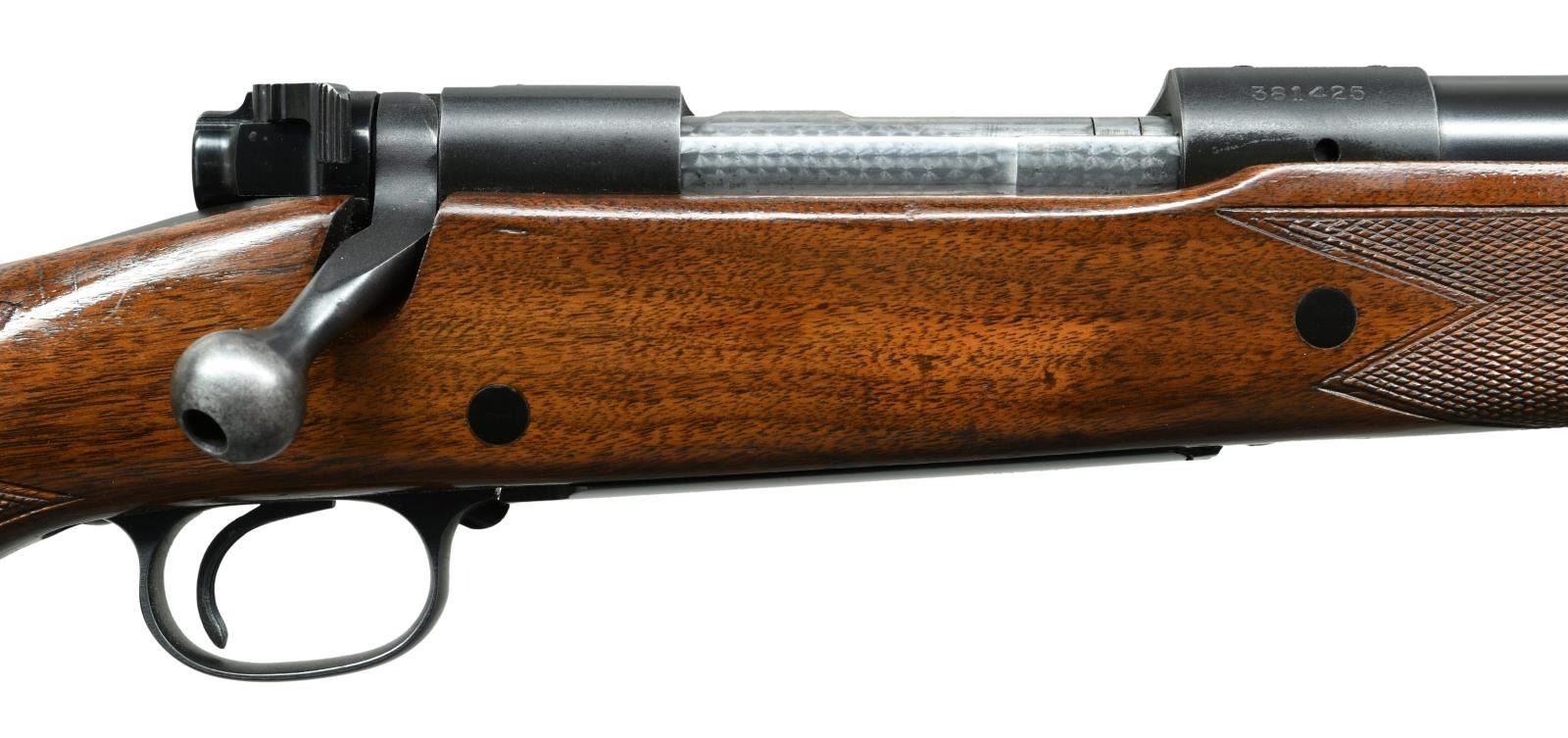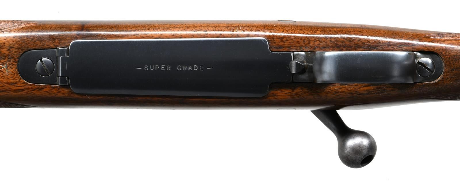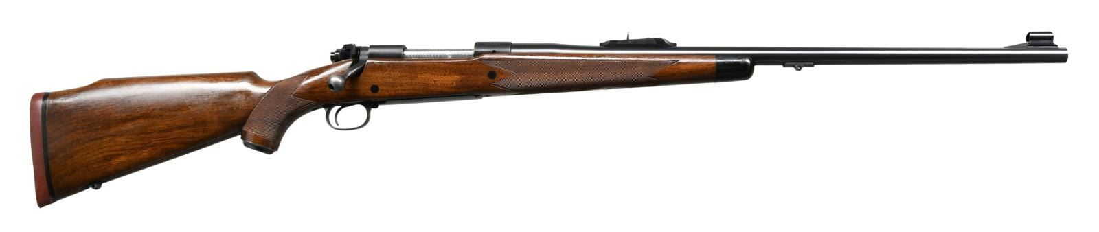BOLT ACTION RIFLE. Cal. 458 Win Mag. S# 381425. Bbl. 25" tapered round. Ramp mounted hooded white bead front sight with Winchester adjustable sporting rear sight. Jeweled bolt, extractor, extractor ring and follower. Bolt is numbered to the rifle. Super Grade marked floorplate. High comb Monte Carlo cheekpiece stock has Super Grade checkering. features include 2 stock bolts with bakelite plugs, black forend tip, steel grip cap, Super Grade swivel bases and solid red pad. S# indicates 1956 mfg. Weight 8 lbs., 10.2 ozs. CONDITION: Metal retains over 95% blue showing slight edge & bolt knob wear. Original stock finish shows areas of light wear with scattered handling marks. Bright near excellent bore. PROVENANCE: From the Estate of Jon Thomas. (23-1661/DS). CURIO. $5,000-7,000.