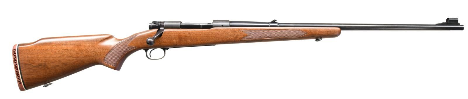 Cal. 300 Win Mag. S# 572068. Bbl. 24" w/ hooded ramp bead front sight & folding leaf rear sight. Pre 64 action w/ claw extractor & 3 position safety. Bolt is numbered to rifle. Monte Carlo walnut stock w/ narrow checkering pattern, sling swivels & red ventilated Winchester pad. Mfg. 1963. CONDITION: 90% thinning blue on bbl. receiver & bottom metal. Bolt handle cocking piece & extractor are reblued, bolt body is polished. Refinished stock w/ freshened checkering. Recoil pad shows wear. Very good bore. (23-4778/DS). CURIO. $2500-3500.