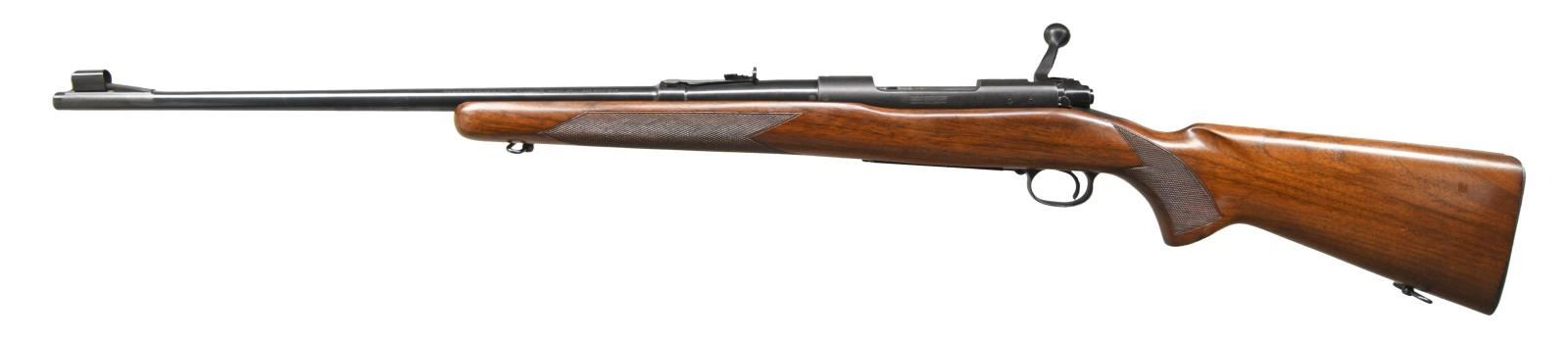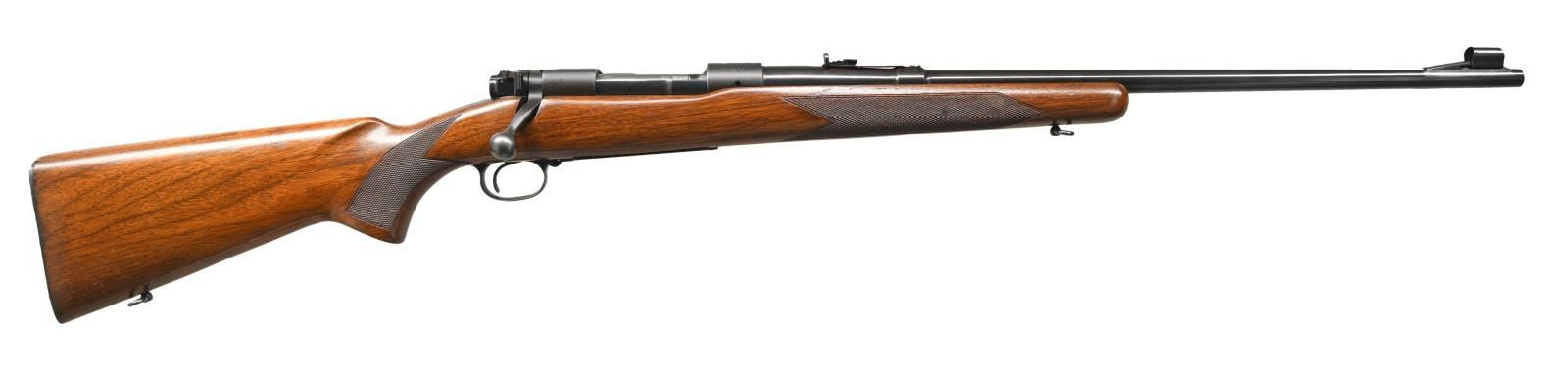 Cal. 257 Roberts. S# 141563. Bbl. 24" with elevator adjustable sporting rear sight and hooded ramp bead front sight. Bolt has matching number in electropencil. Action features long claw extractor, 3 position safety and hinged floor plate. Checkered walnut stock with sling swivels and original checkered steel buttplate. Mfg 1950. CONDITION: metal retains 95% original blue with a few light handling marks. Top front of receiver shows notable area of wear from prior installation of scope/sight mount. Stock shows very good finish with scattered scratches and handling marks. There are a few moderate impressions on right side of forend. Heel of stock at buttplate shows a couple superficial chips. Bright shiny bore with crisp rifling. PROVENANCE: The Collection of Gun Sport Ltd. owned by Jon R. Thomas. (23-3622/BH). CURIO. $1,800-2,500.