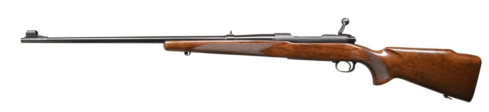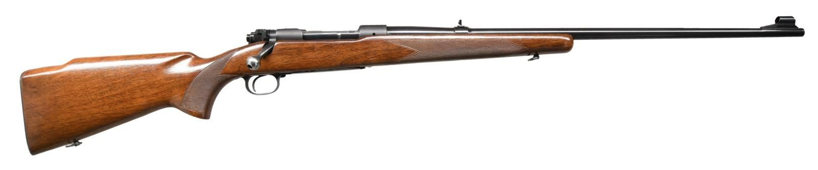 Cal. 300 H&H Mag. S# 339828. Bbl. 26" with flip up sporting rear sight and hooded ramp bead front sight. Bolt has matching number in electropencil. Action features long claw extractor, 3 position safety and hinged floor plate. Checkered walnut Monte Carlo stock with sling swivels and original checkered steel buttplate. Mfg 1955. CONDITION: bbl. & action show very good original blue with light high edge wear and a few scattered handling marks. Very good wood finish shows with occasional light scratches, handling marks and spots of worn finish. Very good bore with crisp rifling. PROVENANCE: The Collection of Gun Sport Ltd. owned by Jon R. Thomas. (23-3624/BH). CURIO. $1,500-2,000.