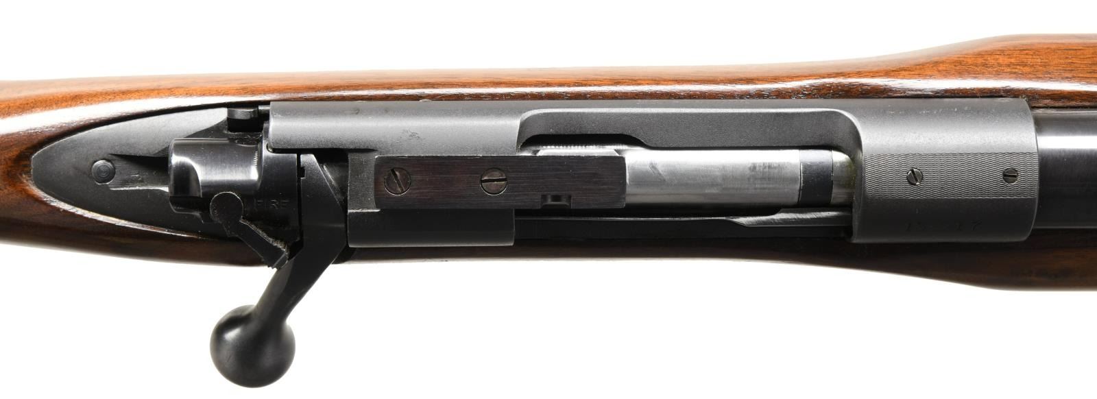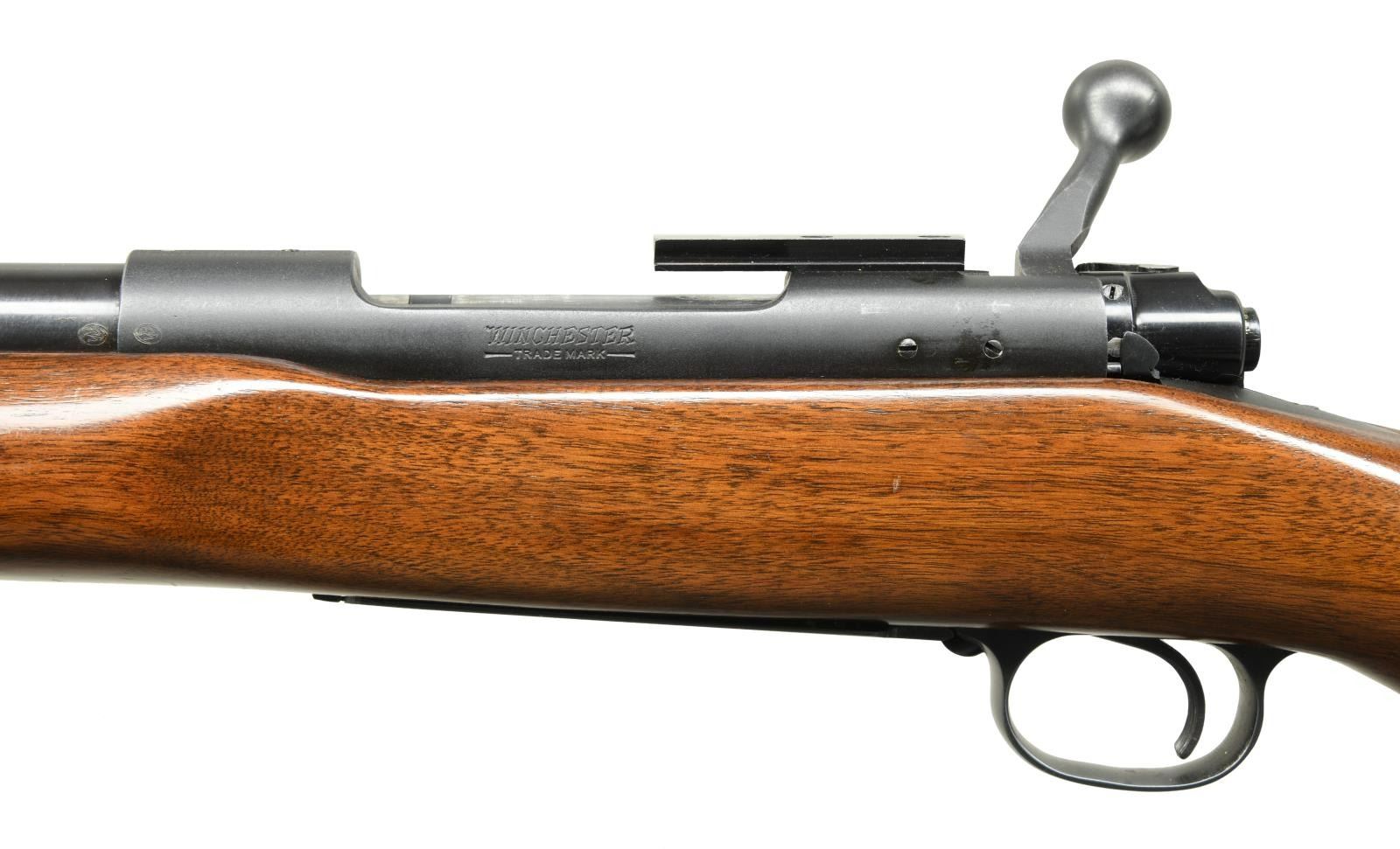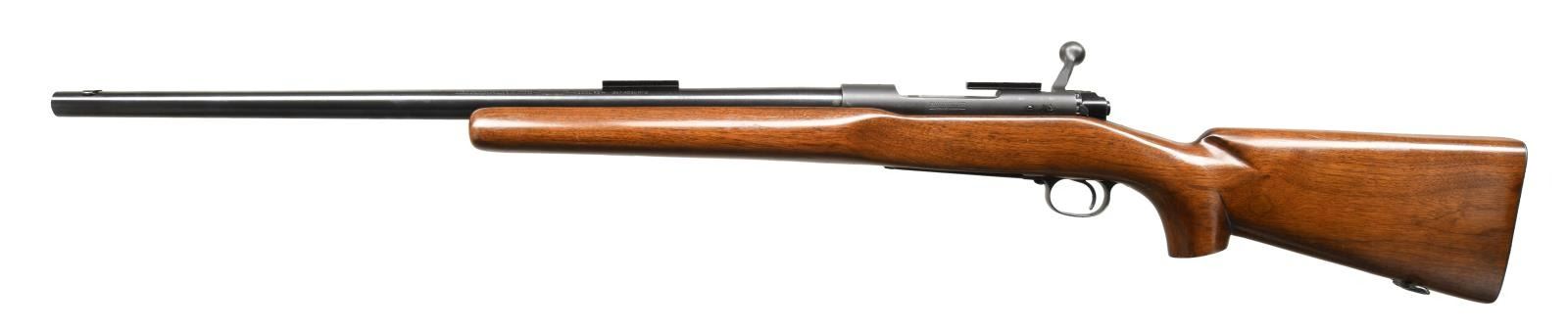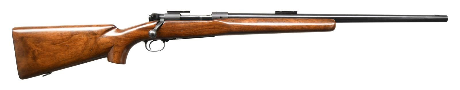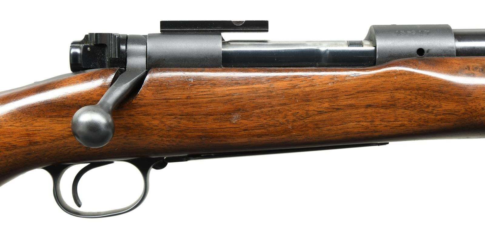 ACTION BENCH RIFLE. Cal. 257 ROB. S# 139017. Bbl 24". Model 70 bolt action bench rifle manufactured by Winchester in 1950. Left side of barrel exhibits stampings stipulating the manufacturer information, as well as the model and caliber designations. Left side of receiver bears the Winchester trademark logo, with the serial number on the right. Receiver exhibits a matte blued finish, with remaining metal components exhibiting a polished blue finish. 1 piece solid wood bench rest pattern buttstock with a checkered steel buttplate. CONDITION: metal components retain the vat majority of their original factory applied blue, with some mild superficial marks from handling and storage, as well as a small concentrated area of pitting that is present over the top of the barrel. Muzzle crown exhibits some light surface oxidation. Brilliant mirror bore, exhibiting well defined rifling throughout. Stock shows a few scattered marks and minor impressions from storage and handling, but is otherwise very good overall. A very nice example of a desirable pre-64 Winchester Model 70 bench rifle chambered in .257 Roberts. (23-2162/MLW). CURIO. $1,200-1,800.