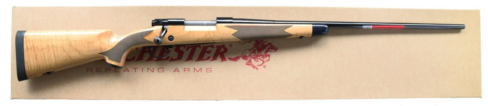 WITH MATCHING FACTORY BOX. Cal. 300 Win Mag. S# WIPT04749YM35G. Bbl 25 3/4". Model 70 Super Grade bolt action rifle manufactured in Portugal by Browning Viana and imported by BACO Inc. of Morgan, UT. The left side of the barrel exhibits the Winchester trademark logo followed by markings stipulating the model and caliber designation, with the right side being marked "-MODEL 70 SUPER GRADE-" above stampings stipulating the importer information. Floorplate is marked "-SUPER GRADE-".Metal components exhibit a lustrous blue finish. Blonde Monte Carlo pattern checkered wood stock with Decelerator black rubber recoil pad. UNATTACHED ACCESSORIES: matching factory box containing its styrofoam insert and factory paperwork. CONDITION: metal components retain virtually all of their original factory blue finish overall. Mirror bore, exhibiting sharp and well defined rifling throughout. Stock is excellent. Box shows some light exterior wear, but otherwise remains sturdy and serviceable. PROVENANCE: The Collection of Gun Sport Ltd. owned by Jon R. Thomas. (23-3596/MLW). MODERN. $1,250-1,750.