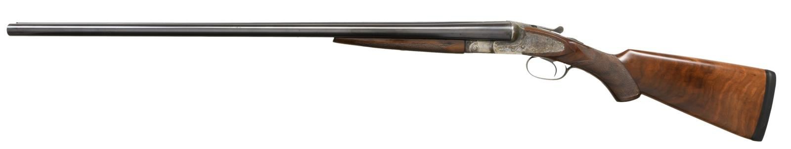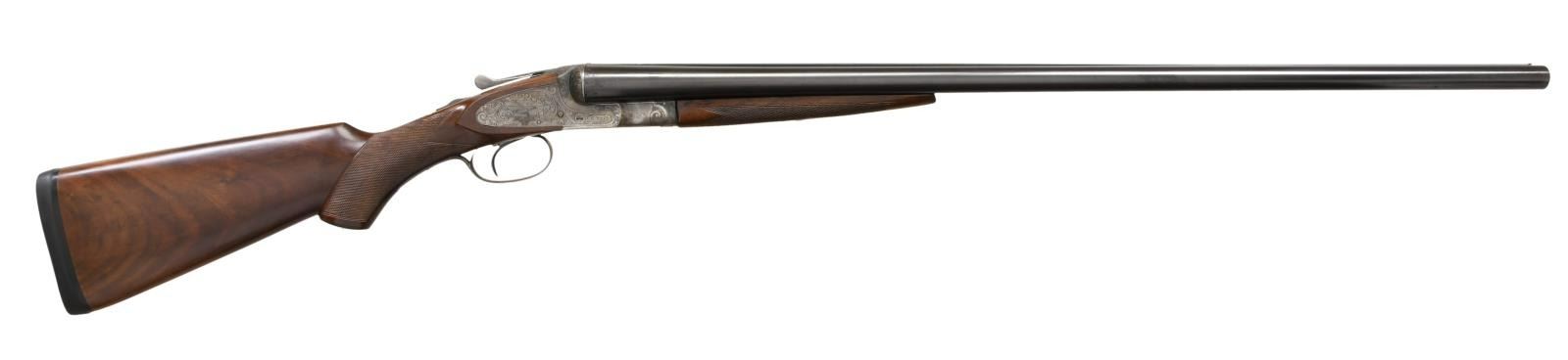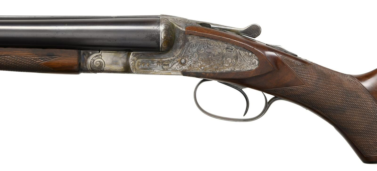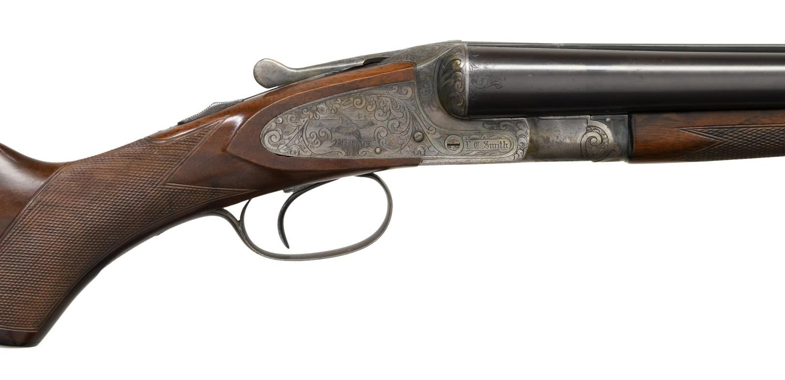 SINGLE TRIGGER. Cal. 12 Ga., 2 3/4". S# 220500E. The 30" barrels with slightly raised narrow matted rib have correct L.C. Smith markings on tops. Barrel flats are stamped with S#, grade and Hunter proofs. Case hardened action with non automatic safety and Hunter single selective one trigger is engraved in usual Specialty style with game birds on lockplates surrounded by large scroll and more scroll on action. "L.C. Smith" is on each lockplate. S# is on trigger guard tang. Stump figured American walnut capped pistol grip buttstock measures 14 1/4" over black Pachmayer pad. Point pattern checkering wraps over grip. Matching splinter ejector forend with inlet ebony tip has "J" spring release with secondary latch in engraved oval escutcheon. MEASUREMENTS: BBLS: Bore Diameter: L .728. R .727. Restriction: L .042 (Extra full). R .021 (Mod). Wall thickness: L .029. R .034. STOCK: DAH: 3". DAC: 1 5/8+". CAST: neutral. LOP: 14 1/4". WEIGHT: 7 lb. 6 oz. CONDITION: very good to fine. Barrels retaining over 80% old reblue with some scattered freckling. Action and lockplates retain about 40% original color, the balance a bright silver to gray. What appear to be replacement stocks retain nearly all of their original oil finish. Checkering with very little wear. Bores are bright and shiny. Mechanically good. (23-2164/MGM). CURIO. $1,200-1,800.