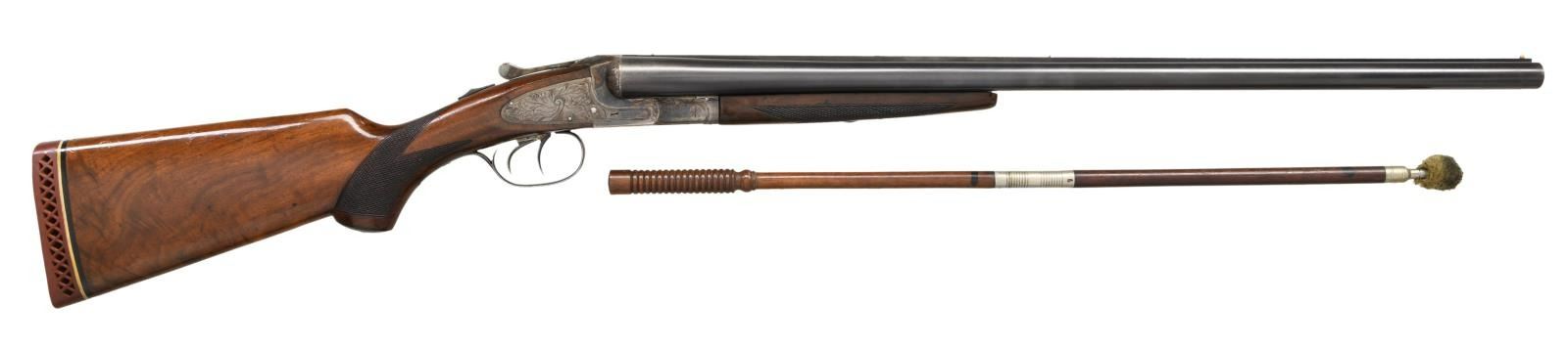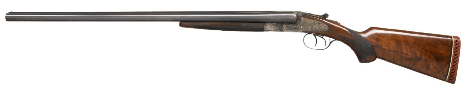 SIGHTING PLANE SXS SHOTGUN WITH FACTORY LETTER. Cal. 12 Ga., 2 3/4". S# S19824 (1947). The 26" London steel barrels fitted with raised matted rib set with two white beads have all correct markings on flats. Case hardened feather weight action with tall fences to accomodate high rib features automatic safety and double triggers (factory letter indicates that gun was made with single selective trigger so these triggers are a replacement. Color and finish of trigger plate do not match action.). Action is engraved in usual Ideal style with stylized large acanthus on lockplates and some foliate engraving on frame. Capped pistol grip buttstock of crotch figured American walnut measures 13 7/8" over red white line pad. Point pattern checkering is at grip. Matching splinter ejector forend has "J" spring release with secondary latch in oval escutcheon. MEASUREMENTS: BBLS: Bore Diameter: L .736. R .735. Restriction: L .030 (Full). R .014 (Mod). Wall thickness: L .033. R .035. STOCK: DAH: 2 1/2". DAC: 1 1/2". CAST: neutral. LOP: 13 7/8". WEIGHT: 7 lb. 3 oz. UNATTACHED ACCESSORIES: Factory letter and 2 sections of a BGI cleaning rod. CONDITION: good to very fine with some alterations. Barrels retaining about 85% original blue. There are two drilled and tapped holes in top rib with plug screws. Action and locks retaining over 80% original color with some silvering and brown specks. Trigger plate replaced along with original single trigger. Stocks retain most of their original oil finish which shows attic burn and some chipping to finish and deep scratches. A coat of oil has been added. Checkering is lightly worn. Bores are bright and shiny. Ejectors are in time. (23-2520/MGM). CURIO. $1,500-2,000.