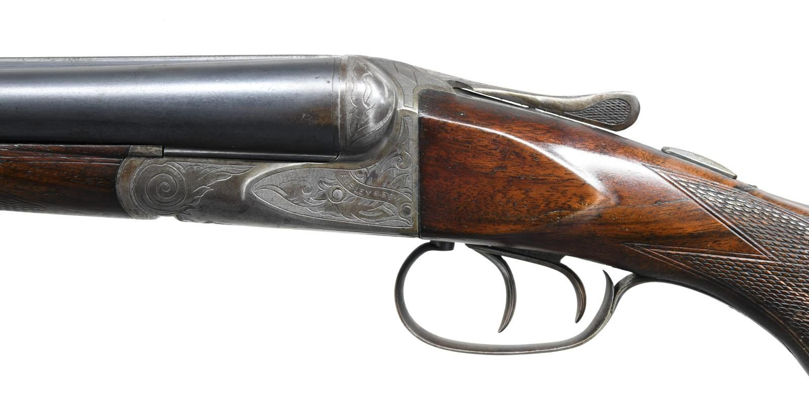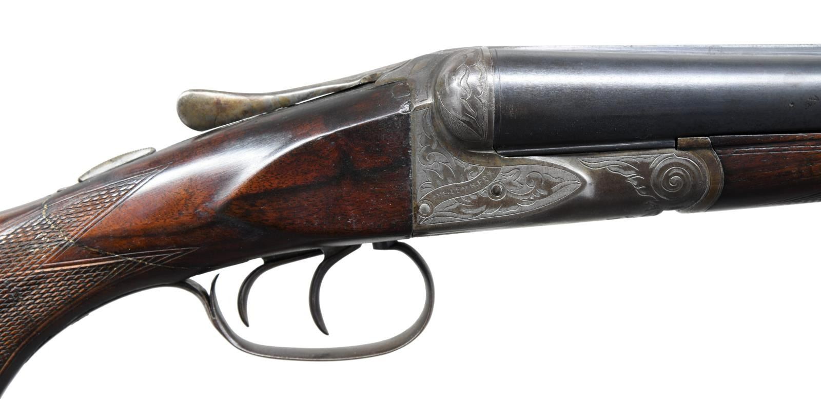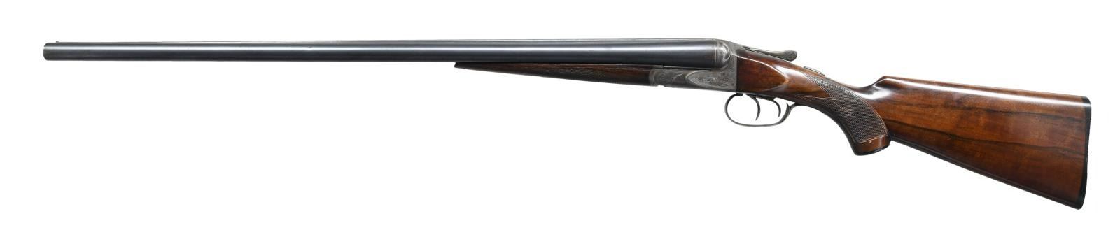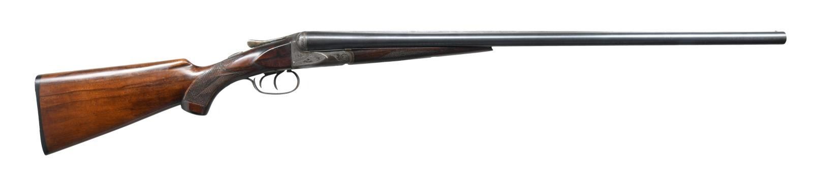 Cal. 12 ga. 2 5/8". S# 32152. Bbls. 28" of Chromox Fluid Compressed Steel. Case colored boxlock action has deep style A Grade engraving. Double triggers. Extractors. Splinter forend hard rubber capped pistol grip stock. LOP 14 1/8" over original buttplate. DAC: 1 3/4". DAH: 2 5/8". Bore Diameter: R .729, L .729. Choke Constriction: R .028, L .050. Min. Wall thickness: R .032, L .042. Weight: 7 lbs 1.8 oz. CONDITION: Action has faded to a dark patina showing some case colors in protected areas. Bbl. has dull blue with general light freckling. Forend show light finish & checkering wear. The stock is broken & glued thru the wrist. Tight action. Good bright bores. (23-1318/ DS) CURIO. $600-1000.