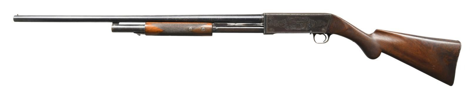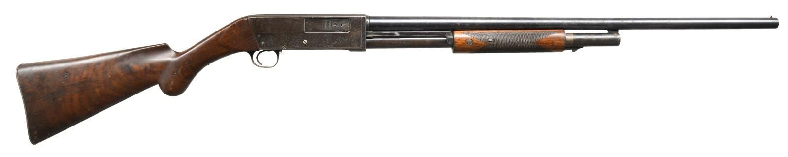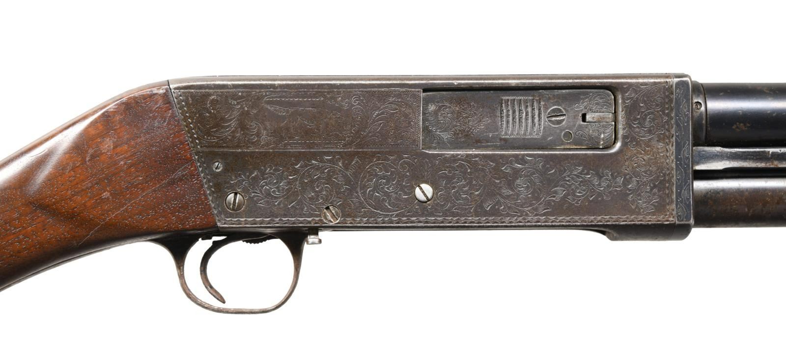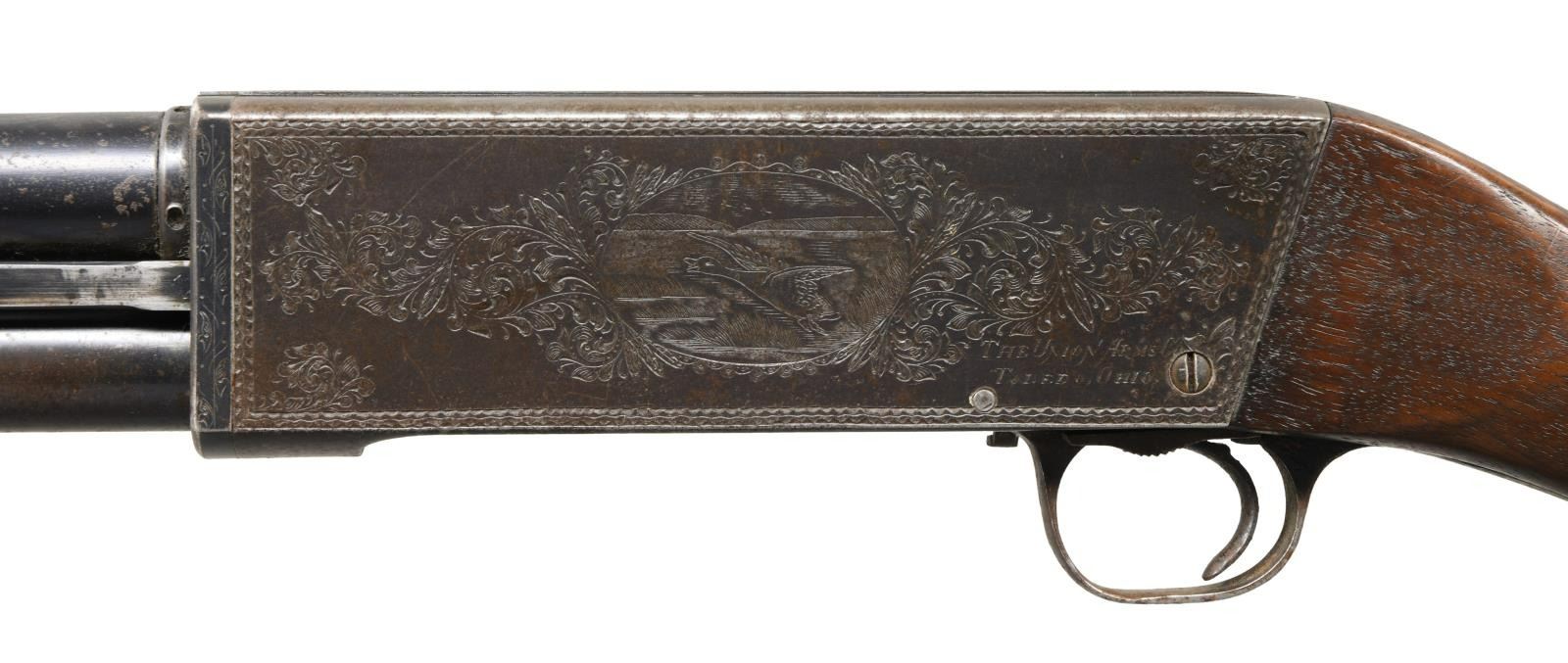 ACTION SHOTGUN. Cal. 20 Ga., 2 3/4". S# 250052. The 26" plain round barrel is choked full. Blued action with milled in rib on top is engraved "THE UNION ARMS CO" "TOLEDO OHIO" on left side. Action is near fully engraved with large open scroll within geometric borders which surrounds game scenes. A flushing duck is on left side and pointing setter is on upper left of right side. S# is on bottom. Slide release is to right of trigger guard and safety is at left which can be reached with your finger through trigger guard (not the safest situation but it is effective). Replacement (?) pistol grip buttstock of crotch figured American walnut measures 14" over steel buttplate, no checkering is present. Forend is near fully checkered. MEASUREMENTS: STOCK: DAH: 2 3/4". DAC: 1 5/8". CONDITION: fair to fine with evidence of poor storage. Barrel and action retain most of their original blue with a large amount of scattered areas of rusting which may clean. Stocks retain most of their oil finish. Bore is bright and shiny. Mechanically good. Nearly all of this companies production was 12 Ga., engraved examples are very scarce. (22-6444/MGM). CURIO. $600-1,000.